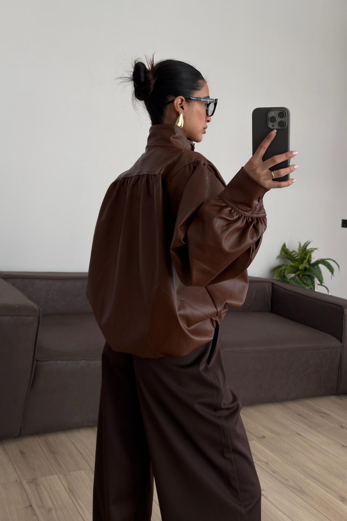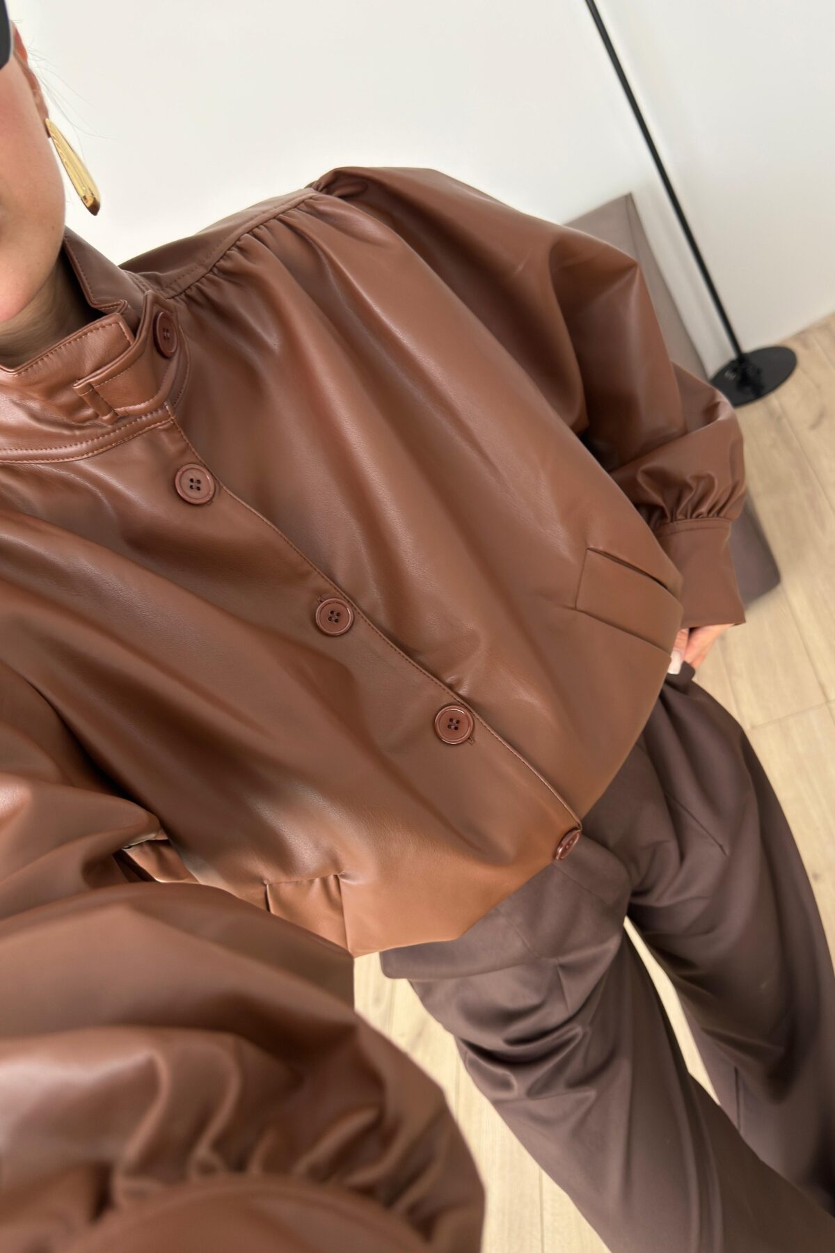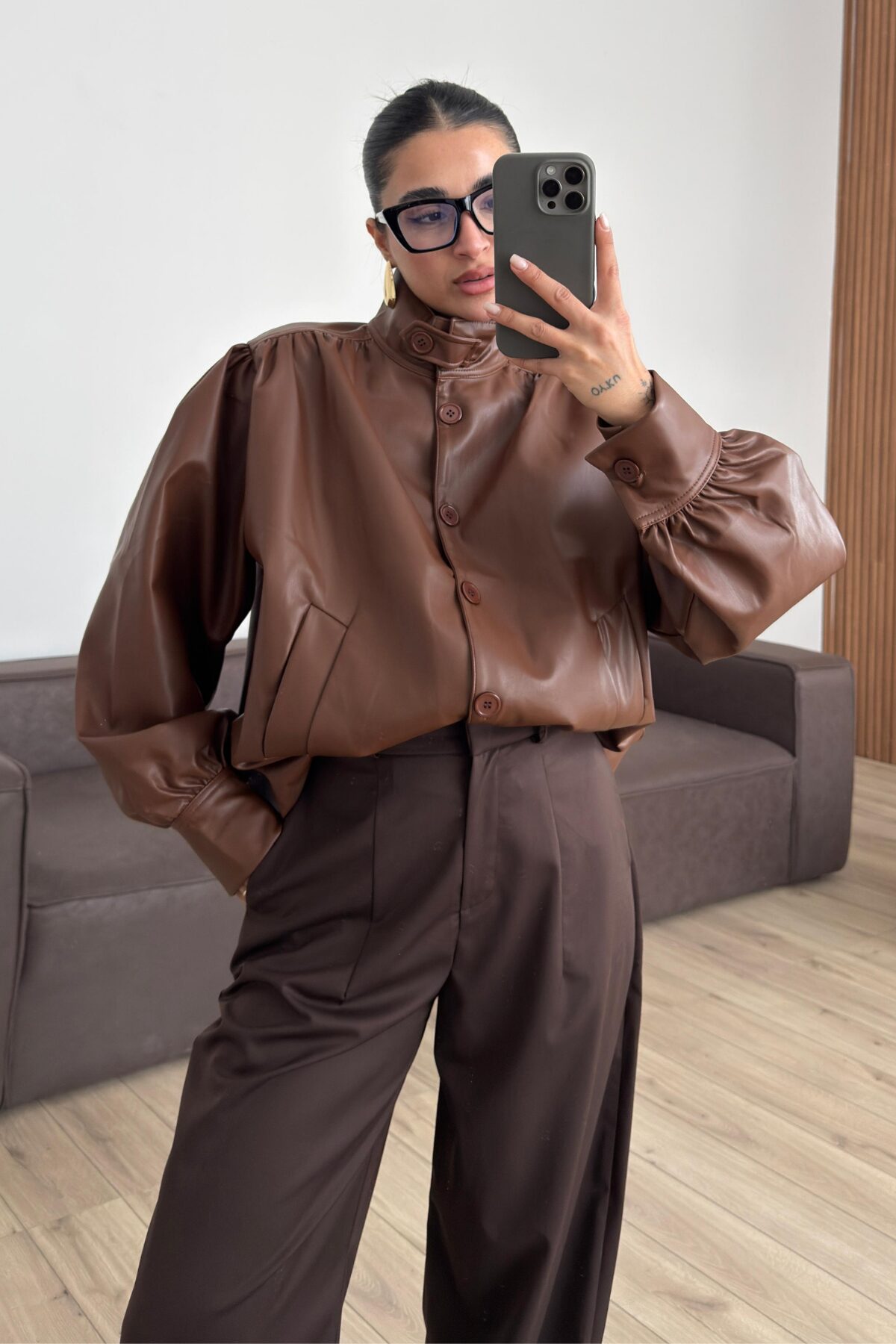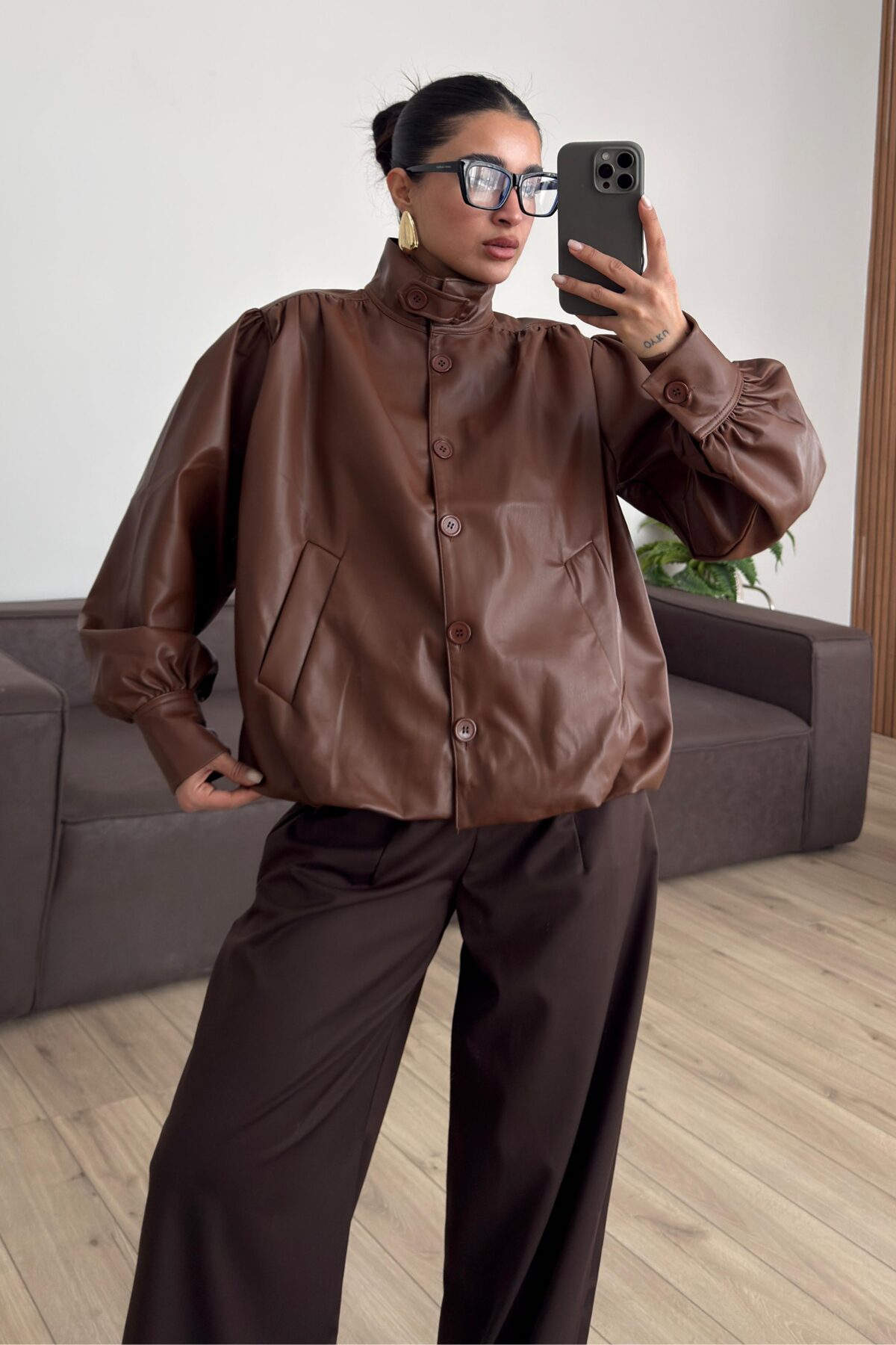 Düğmeli Yumuşak Deri Ceket Kahverengi
