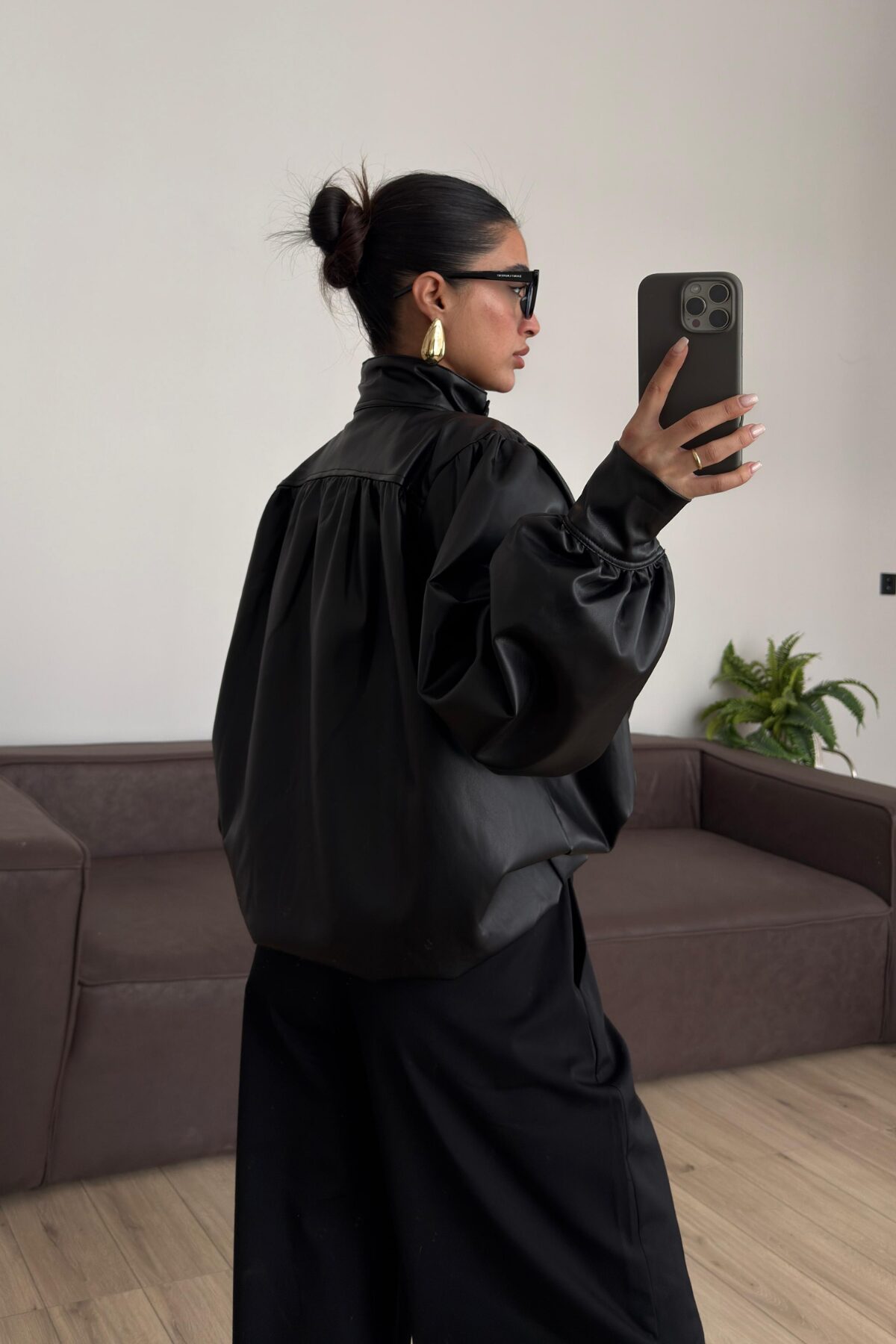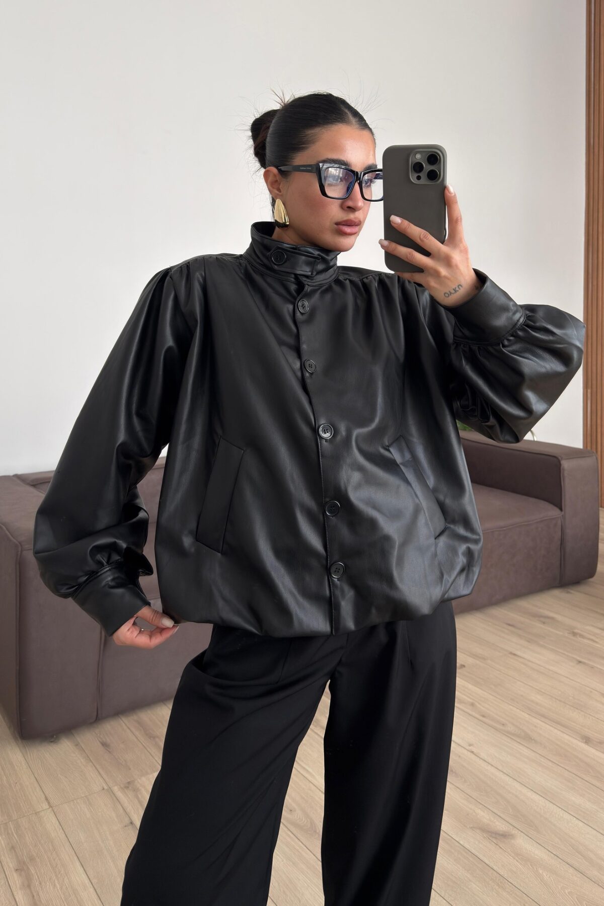Düğmeli Yumuşak Deri Ceket Siyah