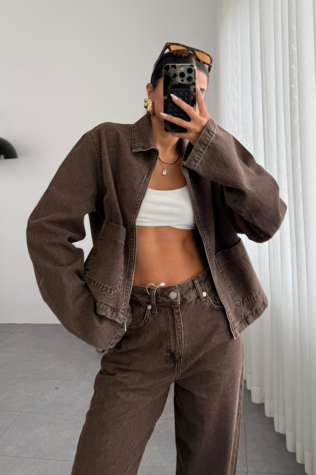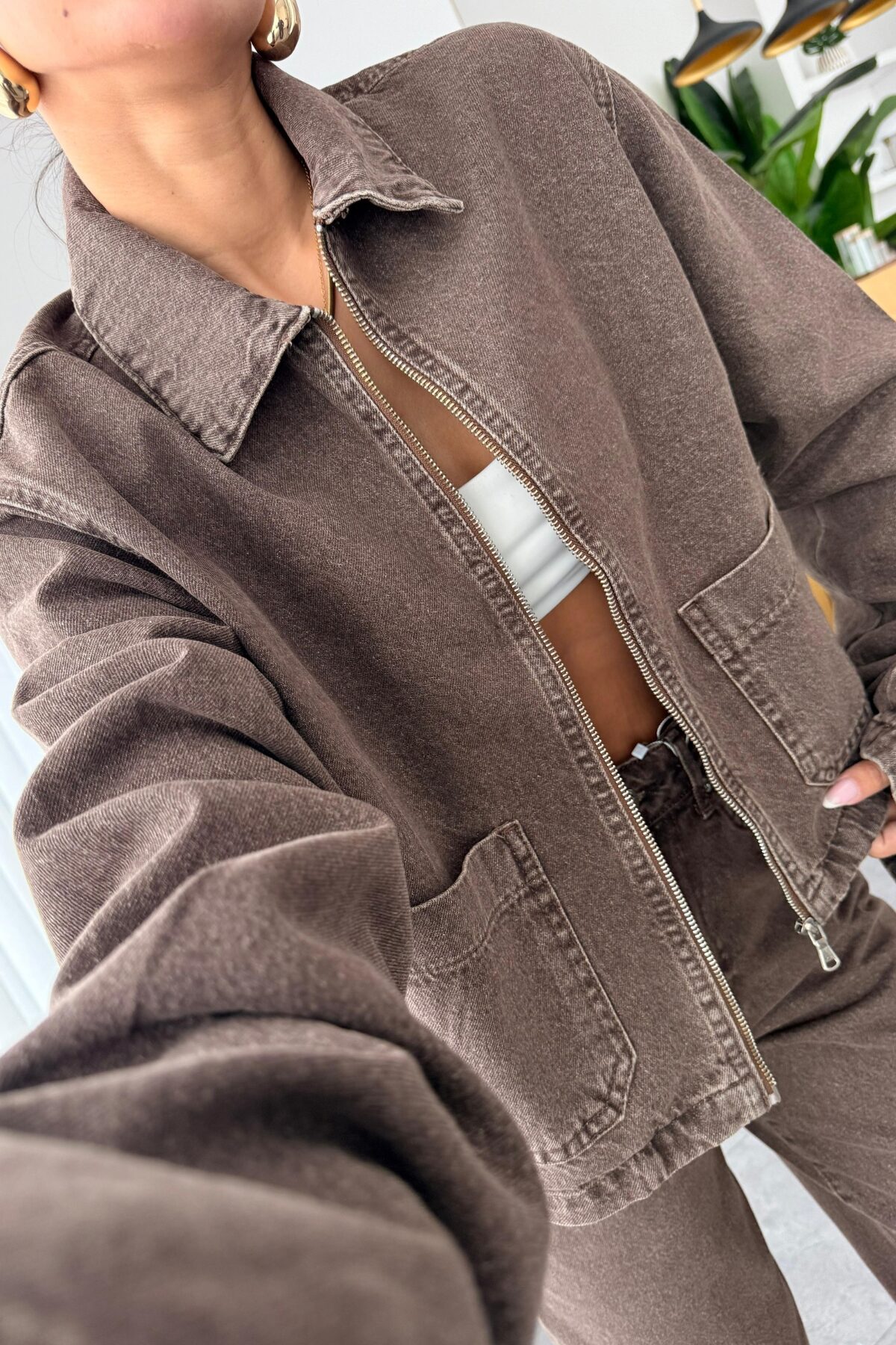Fermuarlı Denim Kahve Eskitme Ceket
