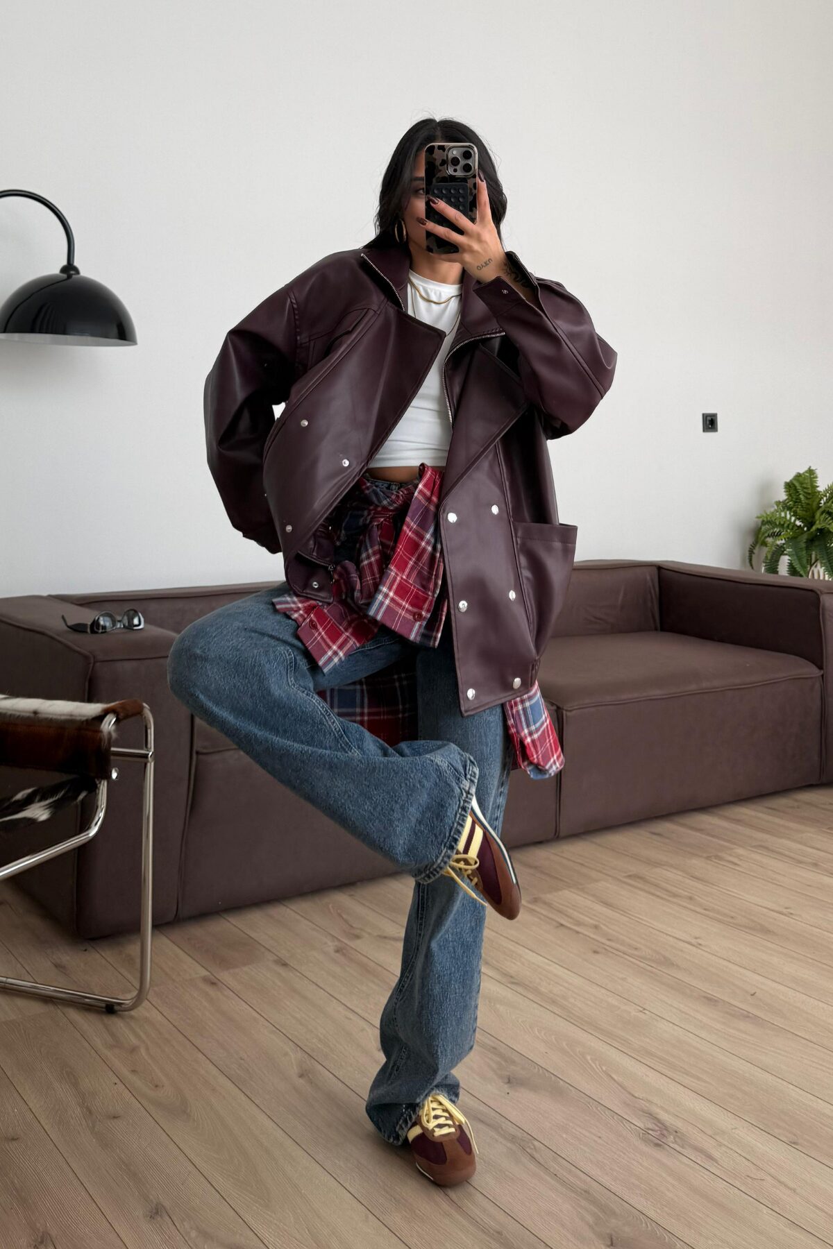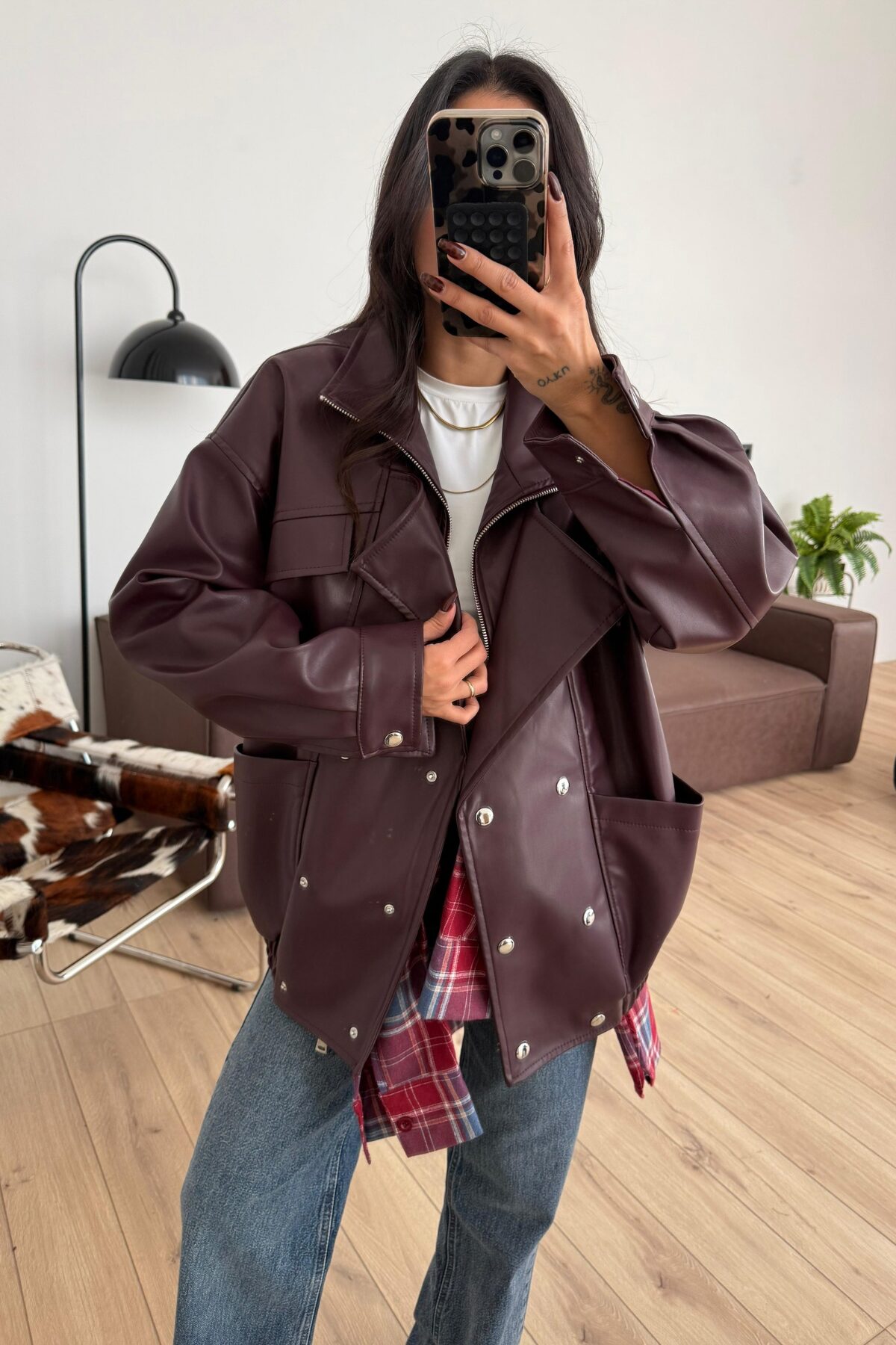 Hakim Yaka Bomber Deri Ceket Mürdüm