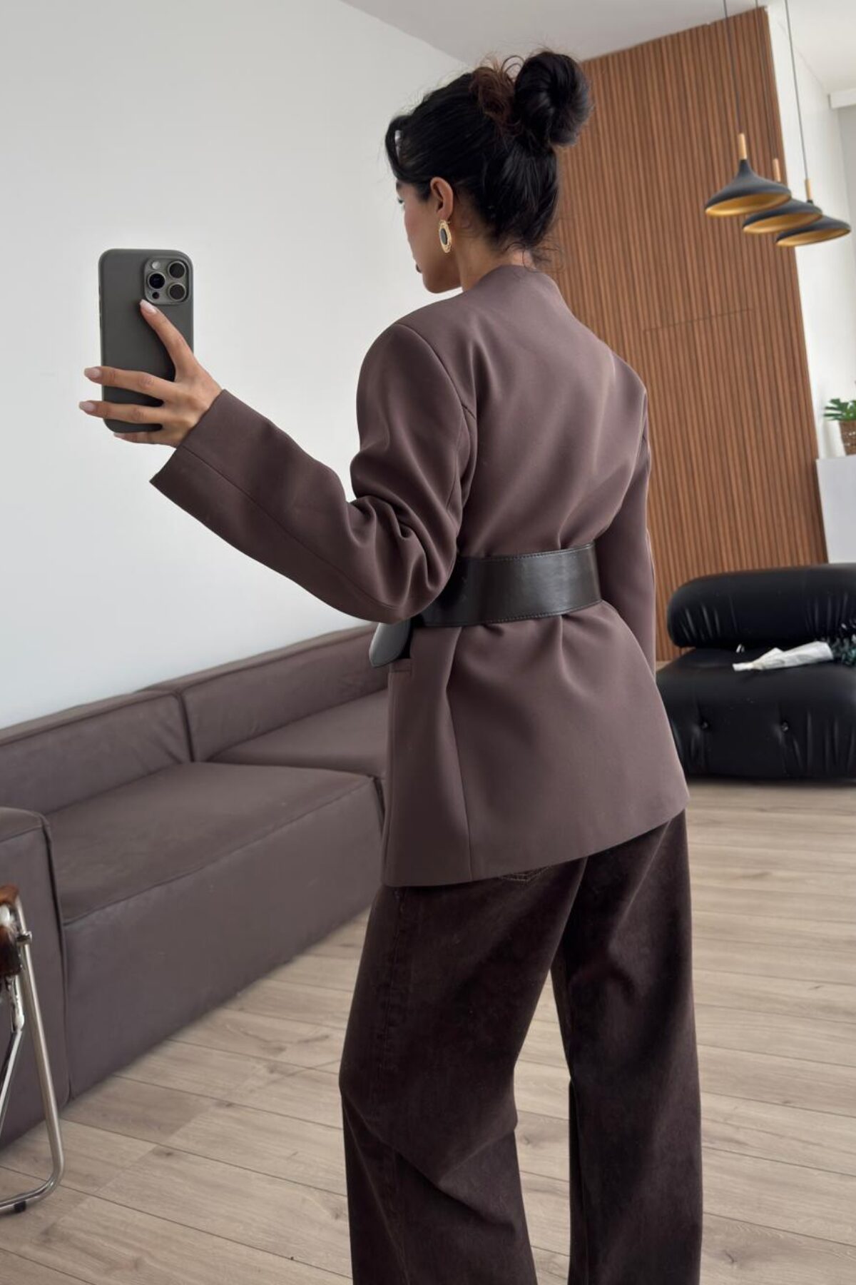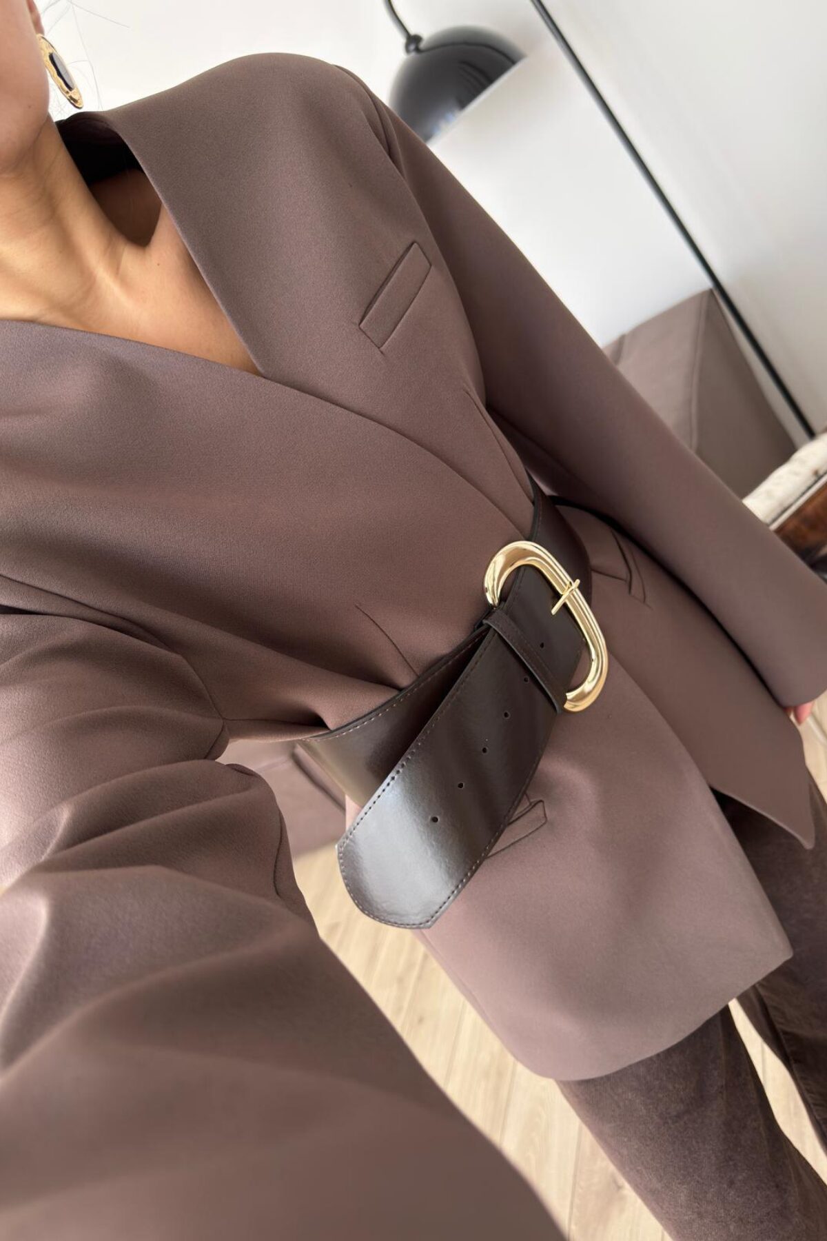 Kalın Kemerli Atlas Ceket Kahverengi