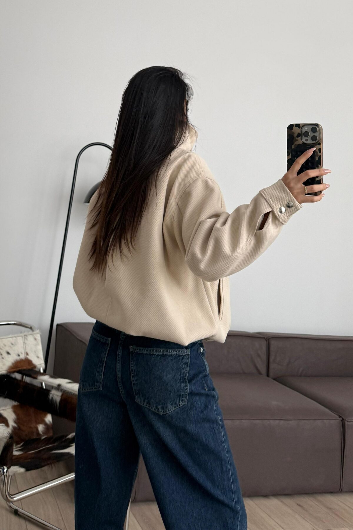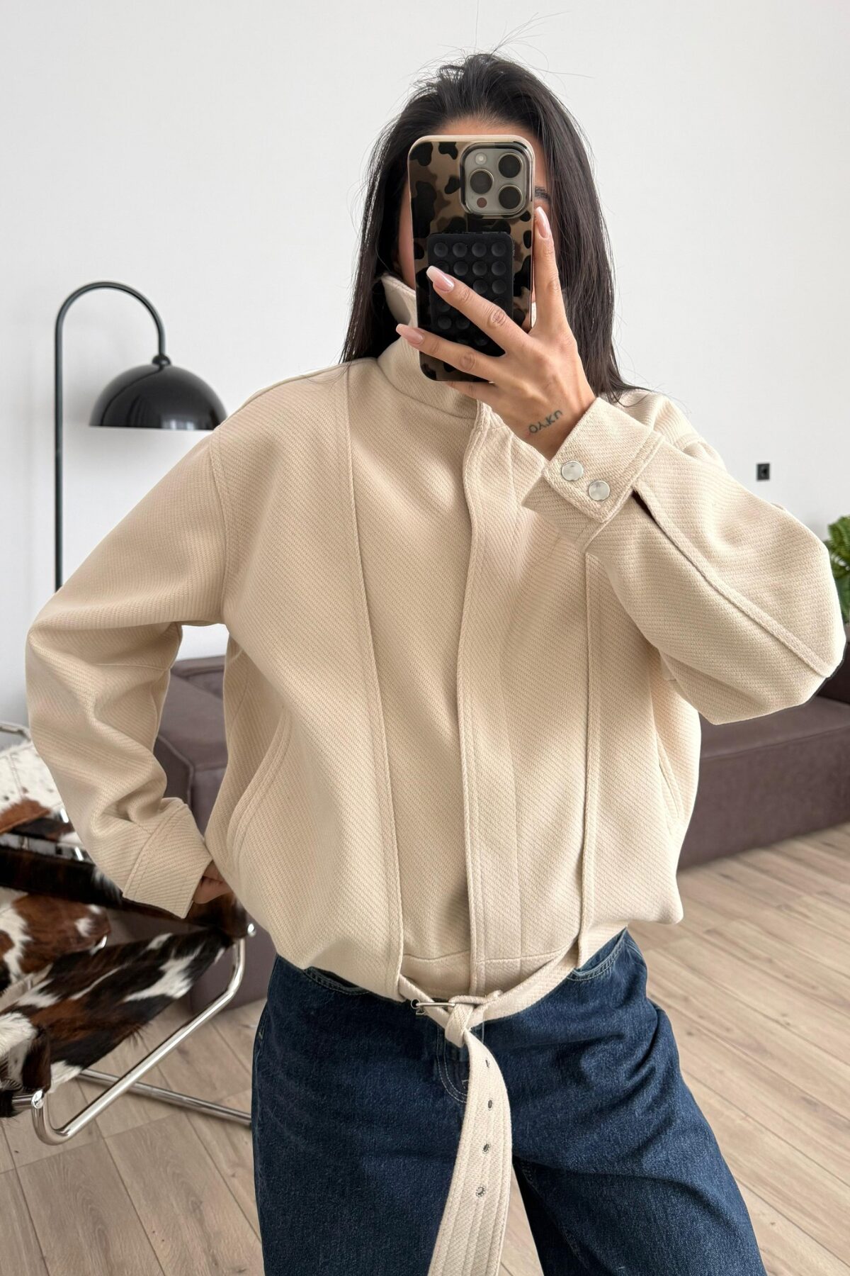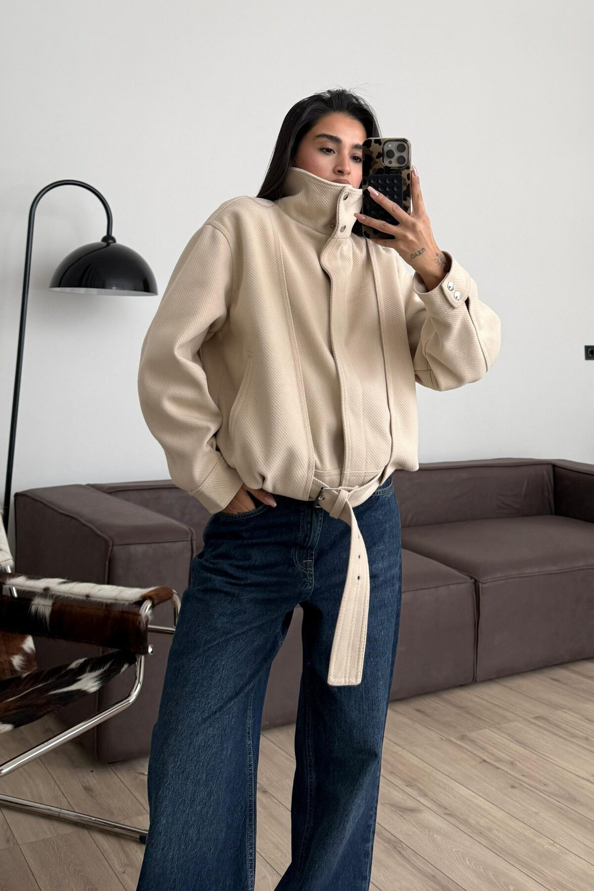 Kemer Detaylı Fitilli Dik Yakalı Bomber Ceket Taş