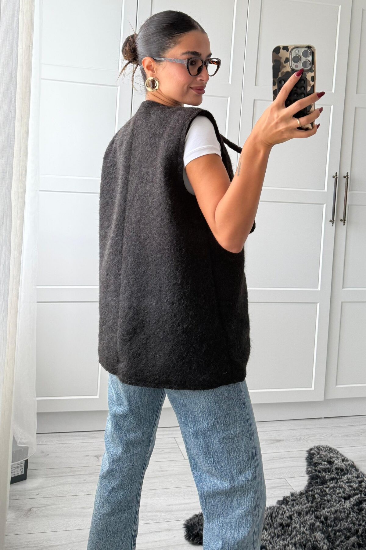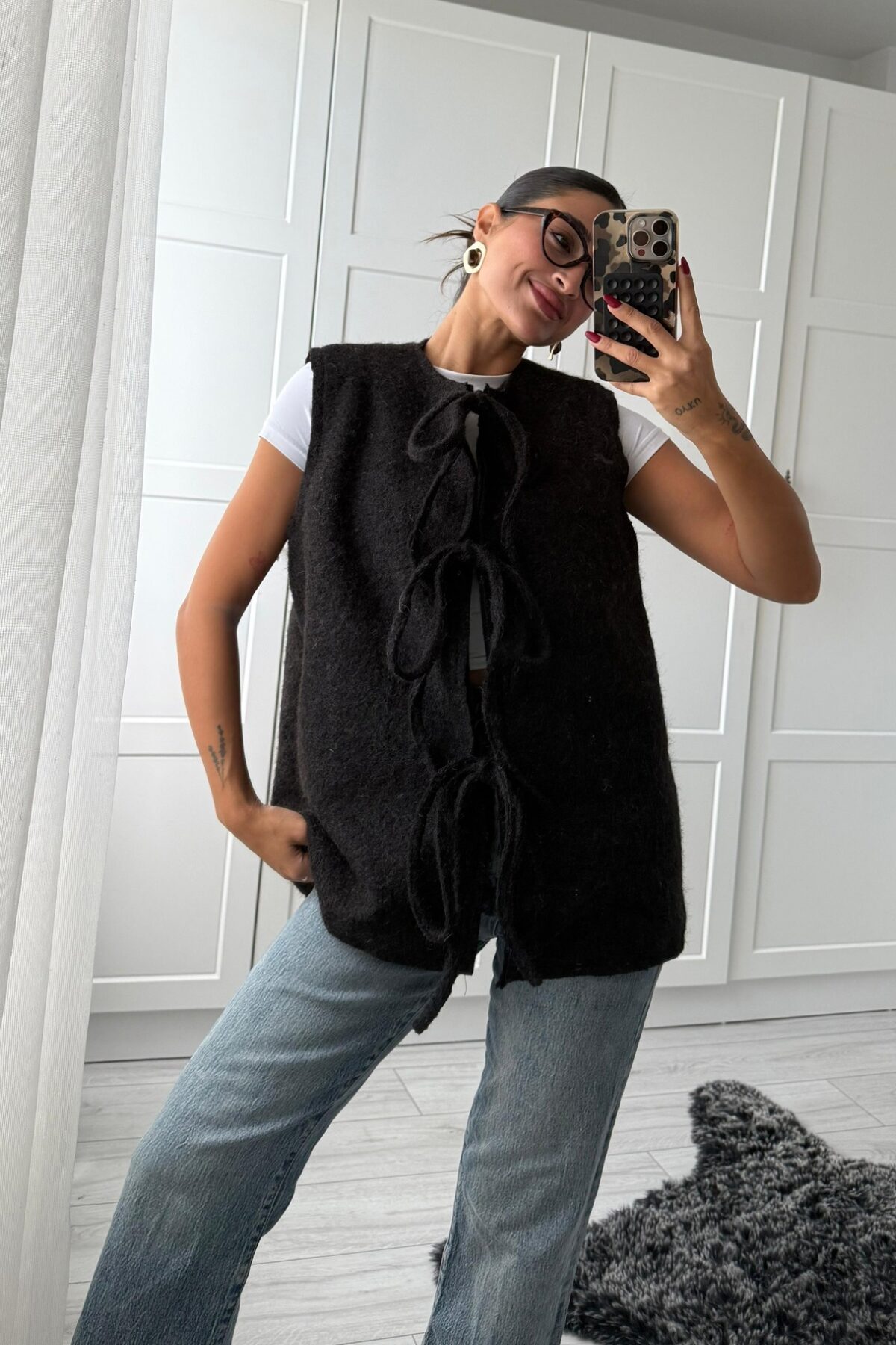 Önden Bağlamalı Kırçıllı Yelek Siyah