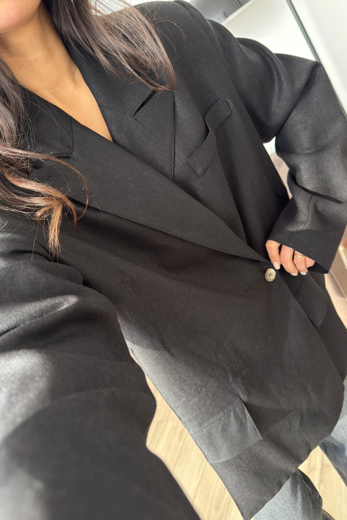Önü Yırtmaçlı Keten Blazer Ceket Siyah
