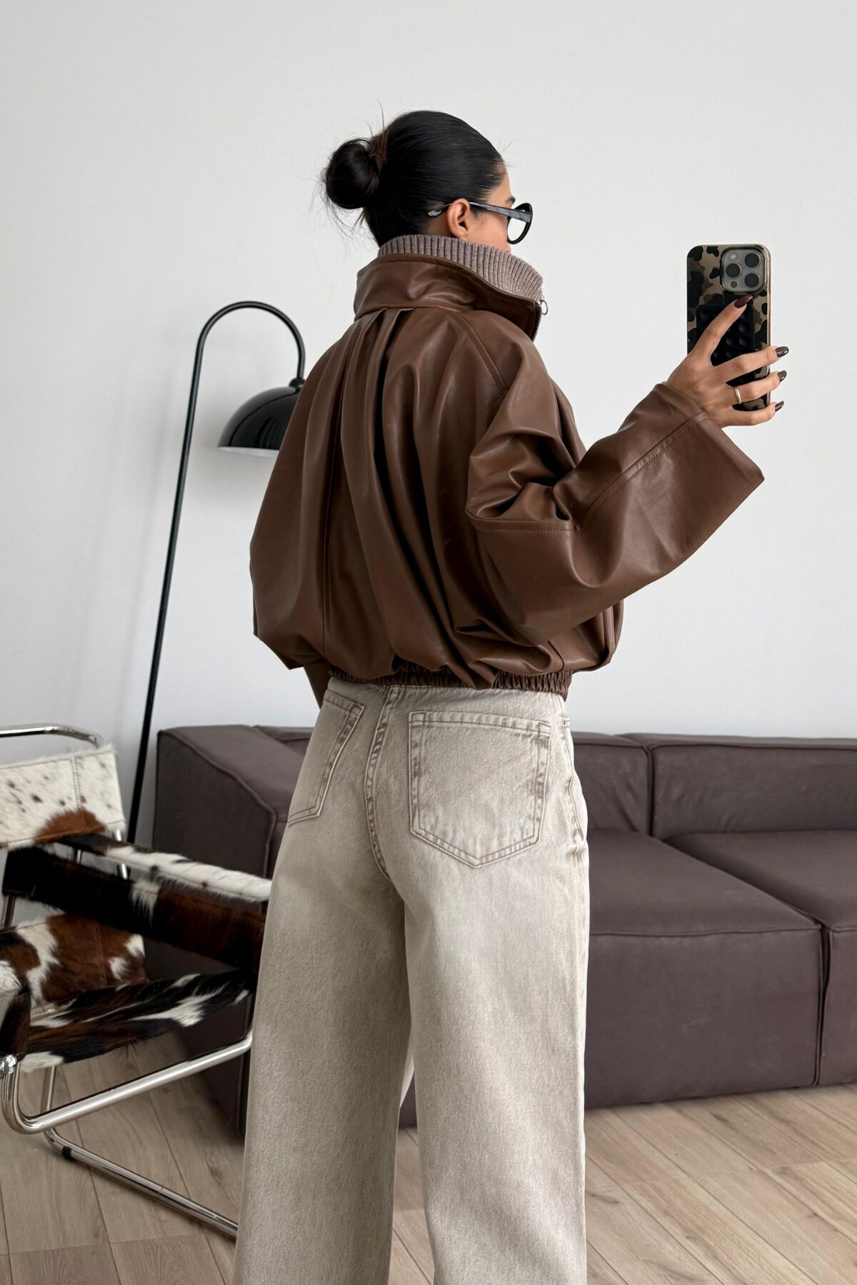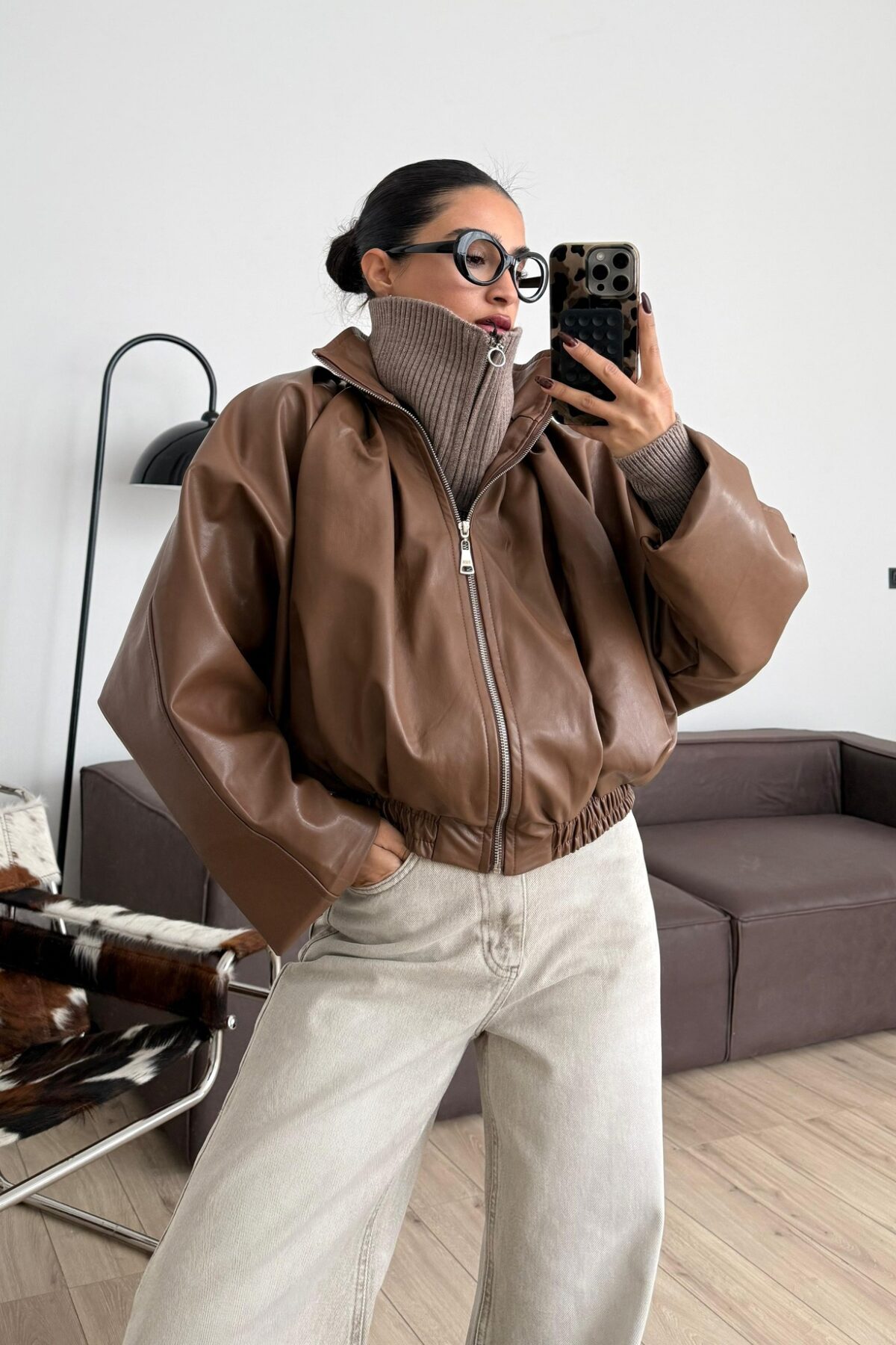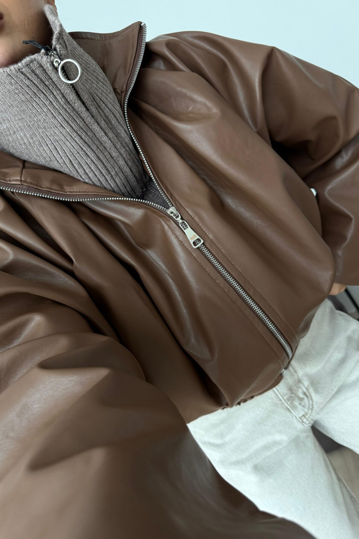 Pileli Yarasa Kollu Deri Ceket Kahverengi