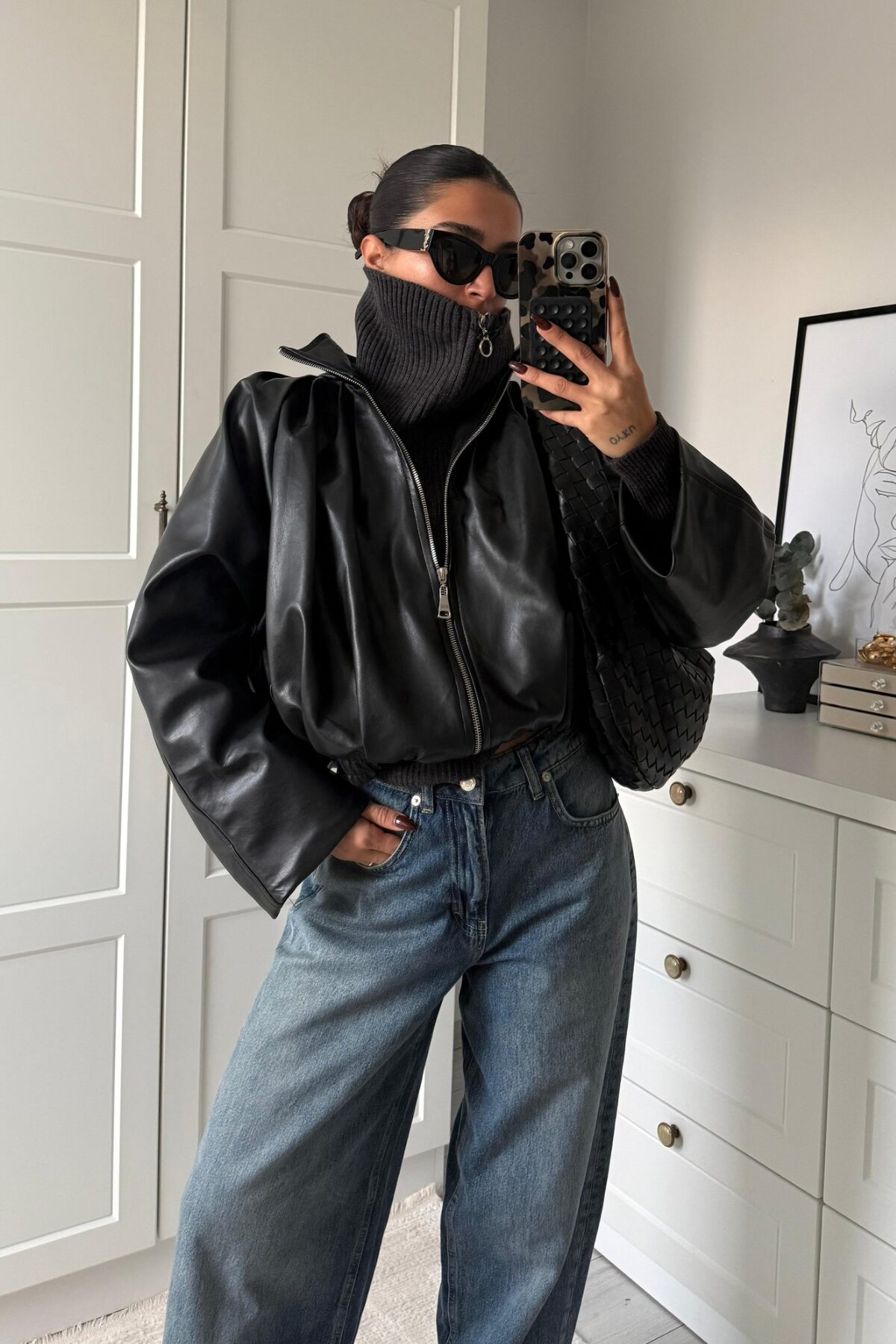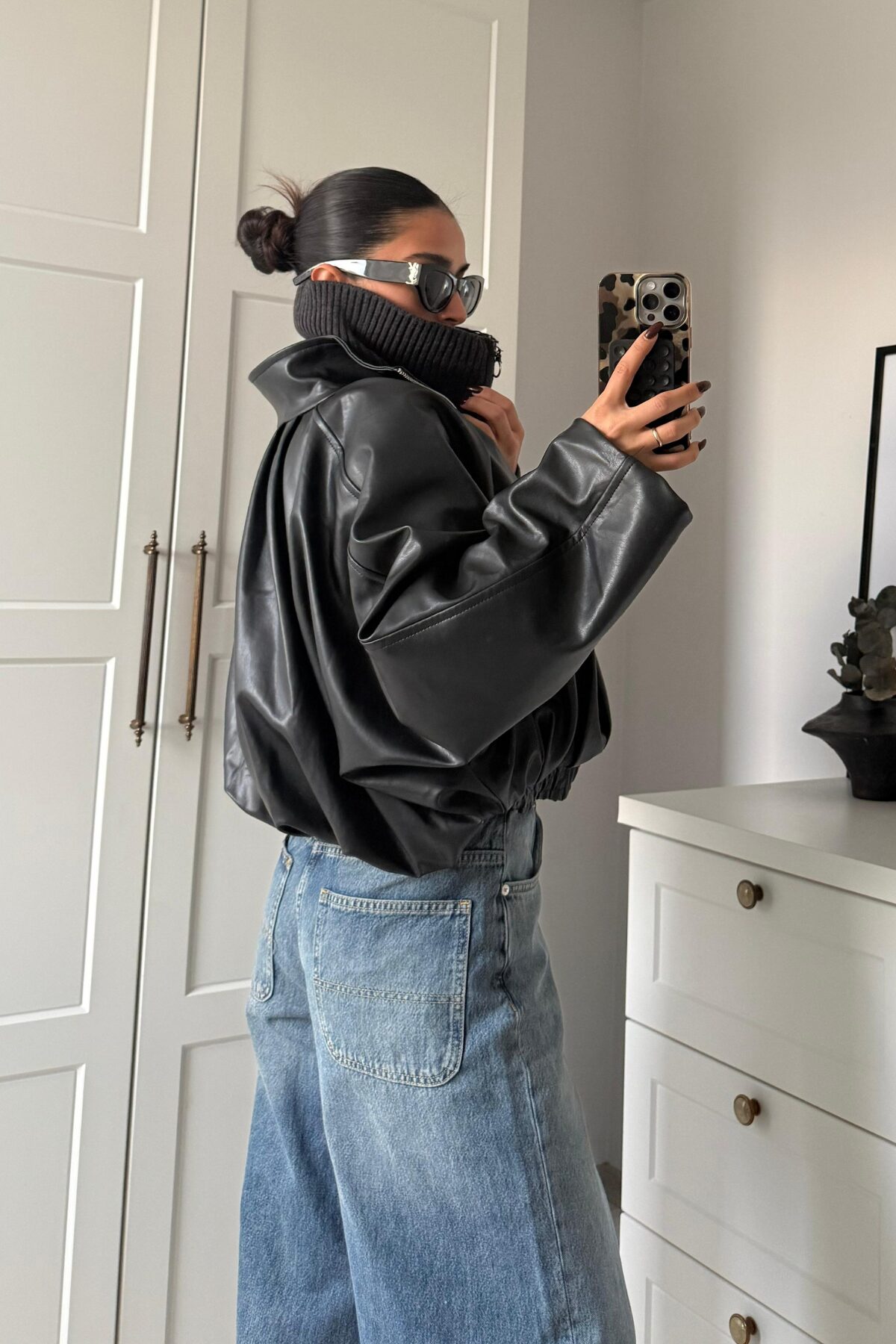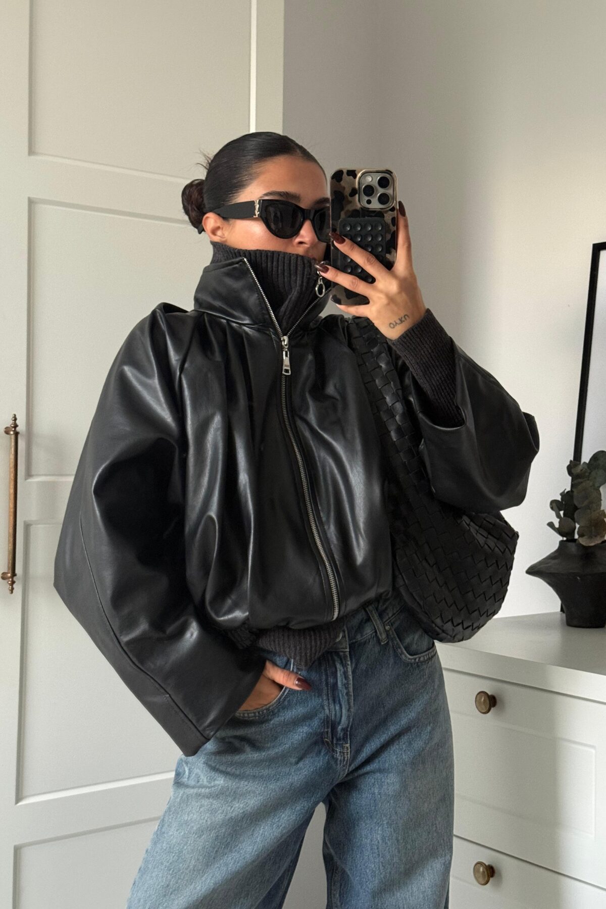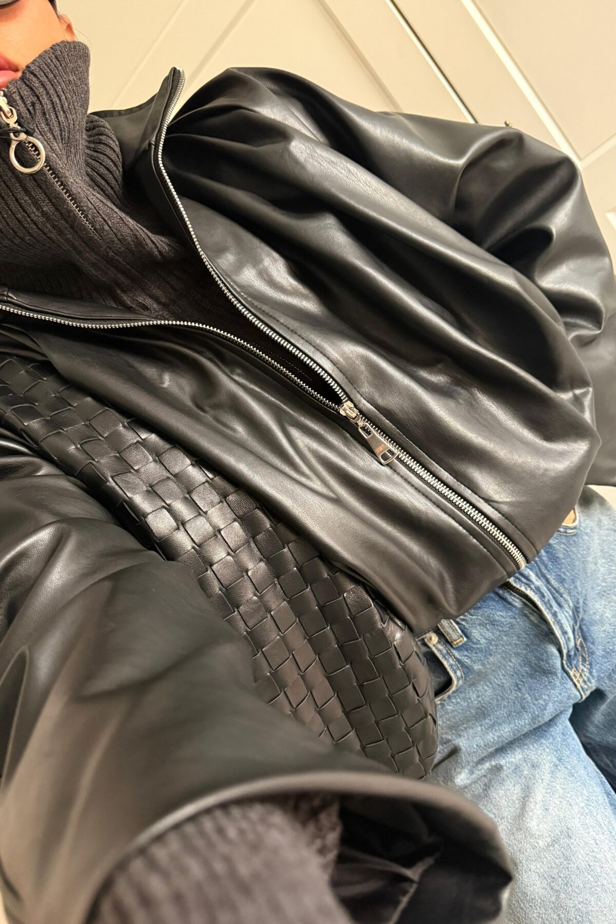 Pileli Yarasa Kollu Deri Ceket Siyah