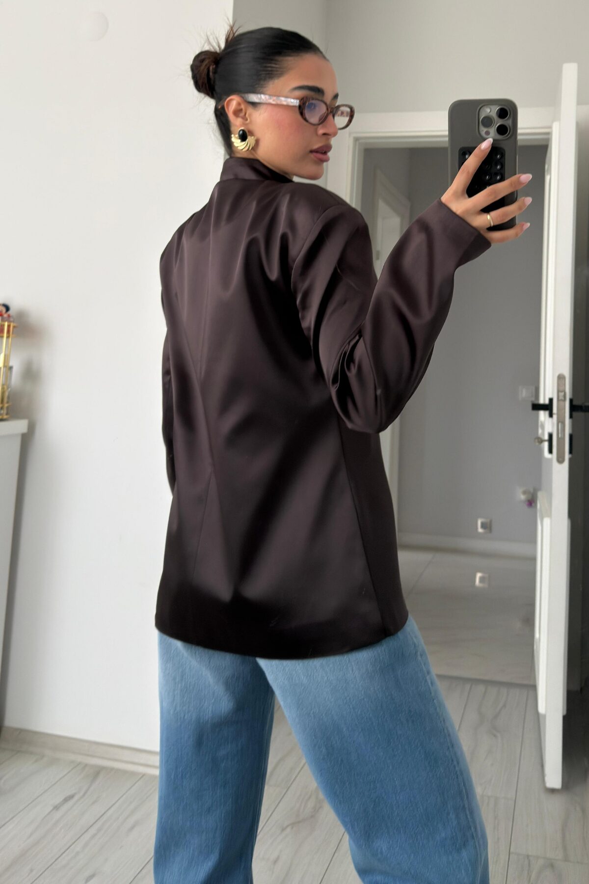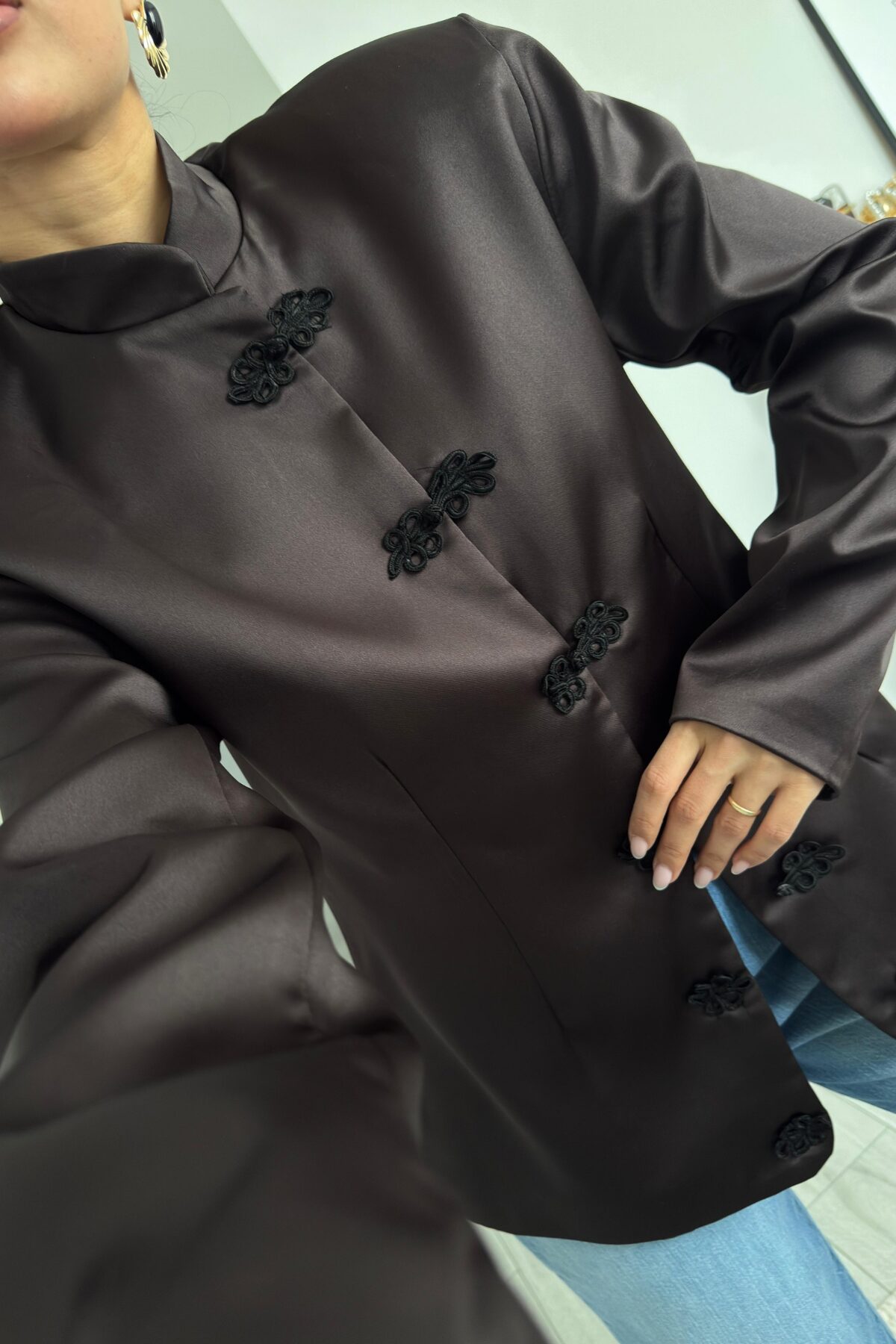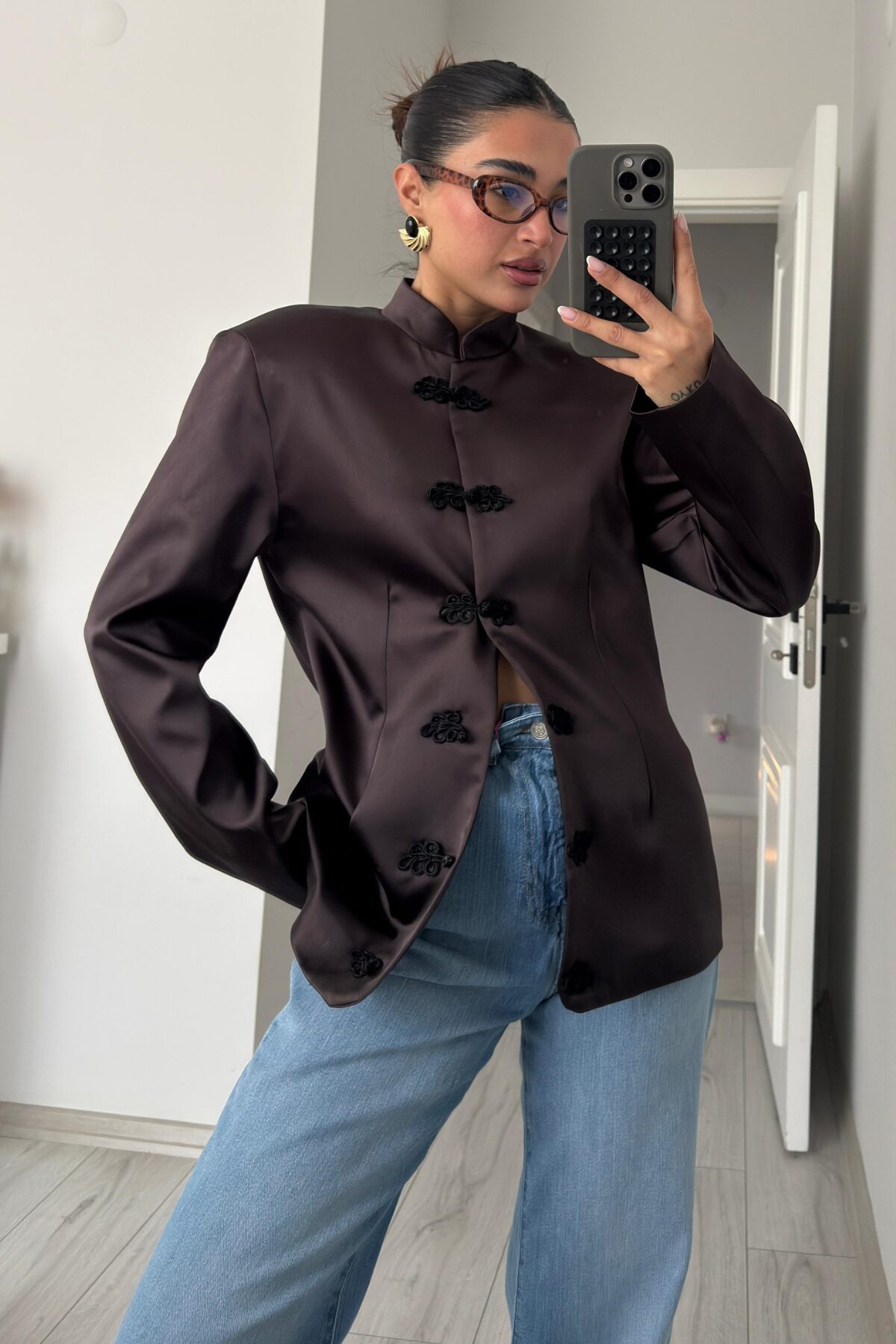 Saten Vatkalı Mandarin Ceket Kahverengi