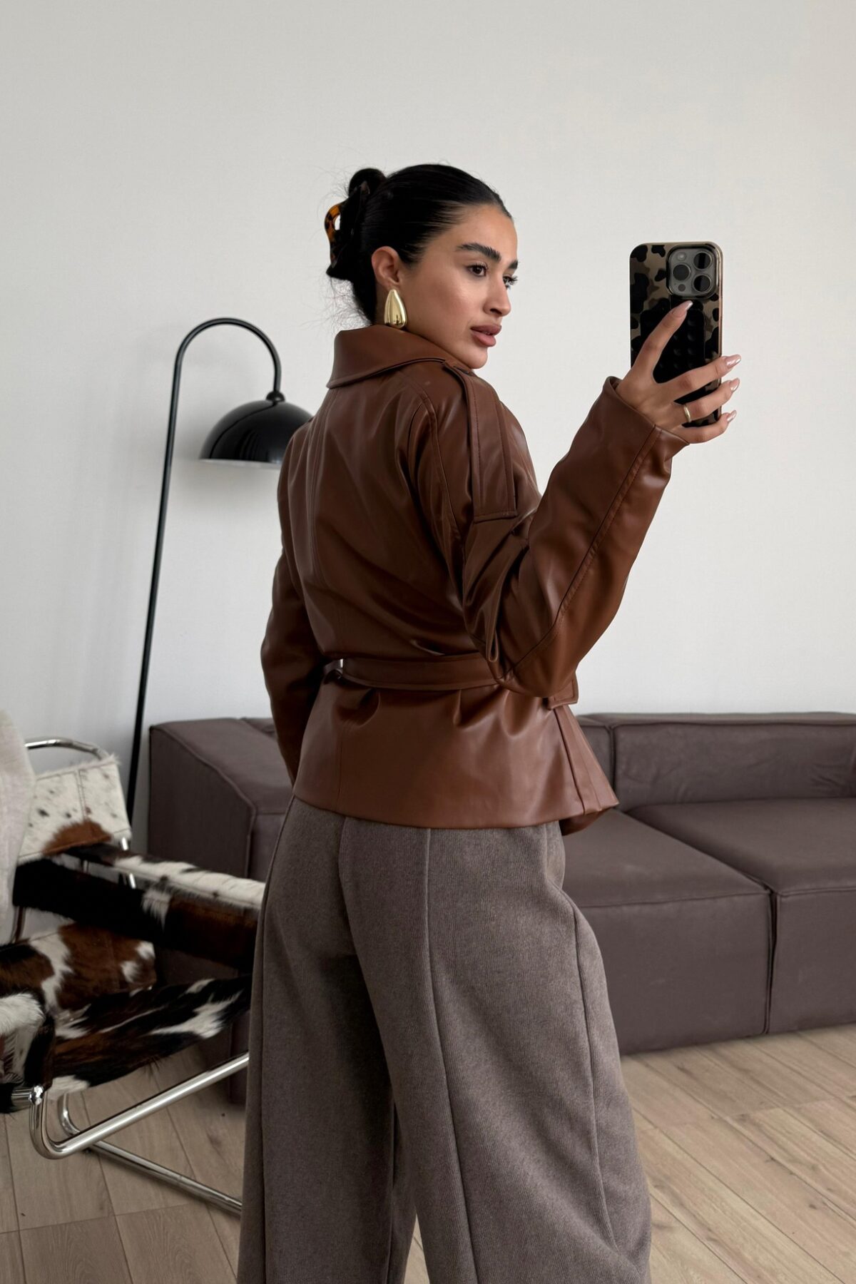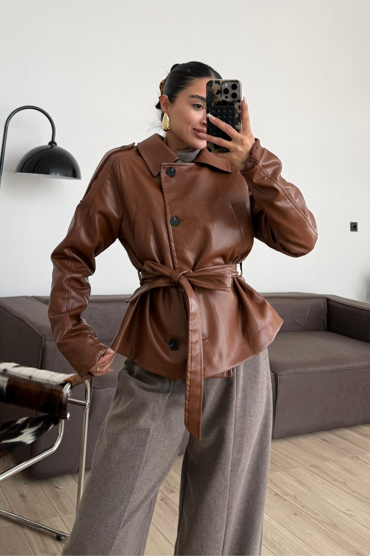 St Beli Kemerli Yumuşak Deri Ceket Kahverengi