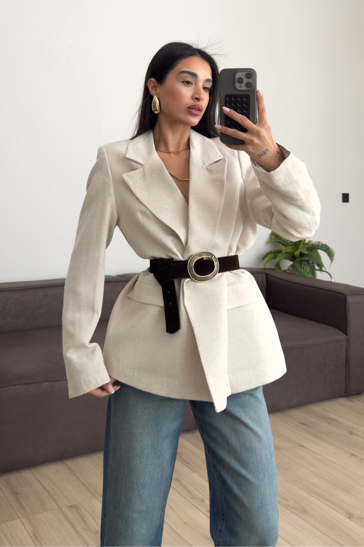 Süet Kemerli Keten Ceket Taş