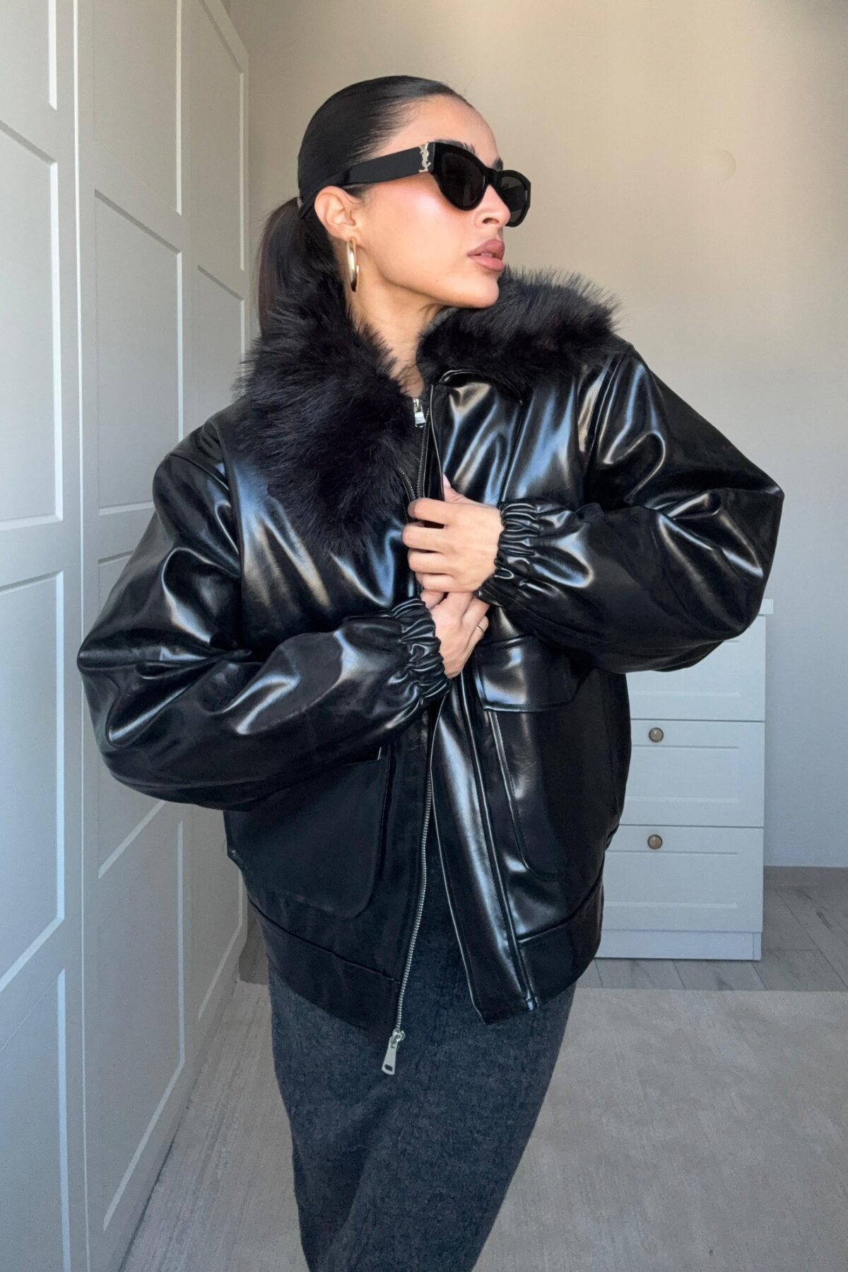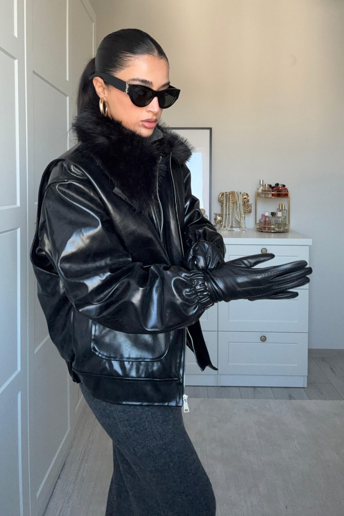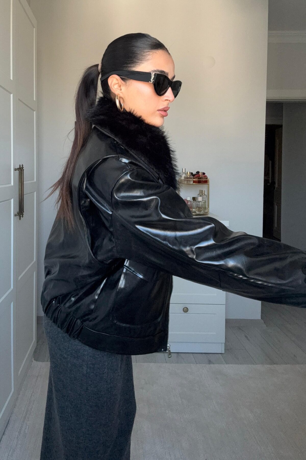 Yakası Kürklü Kanguru Cepli Deri Ceket Siyah