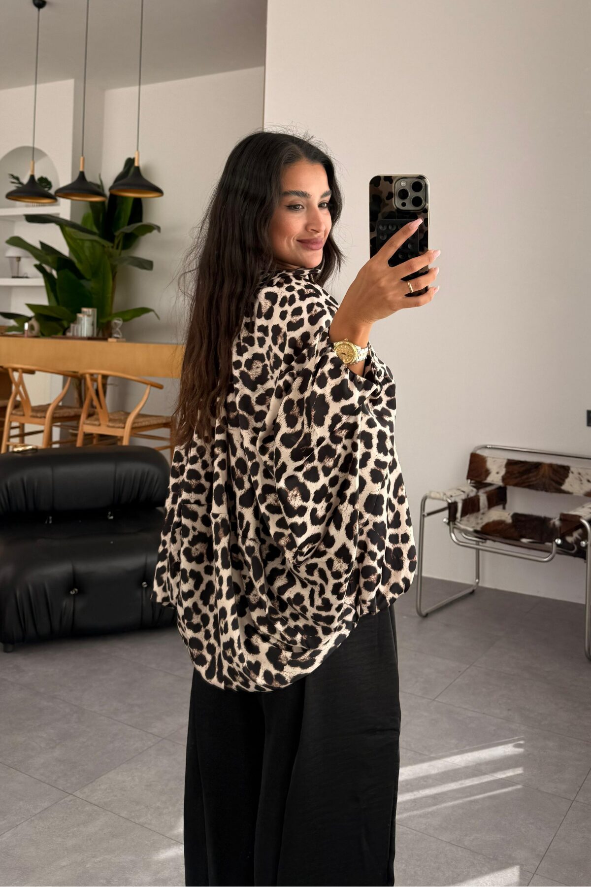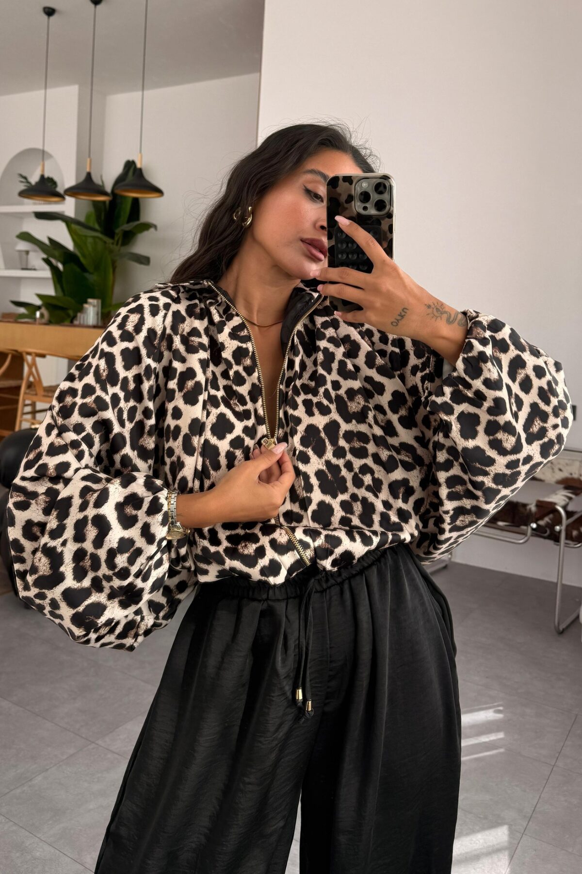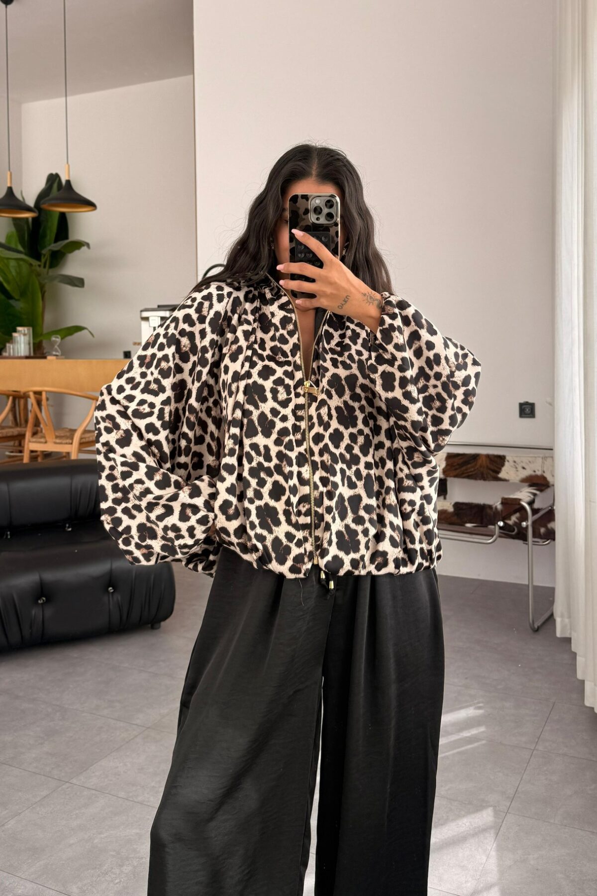 Yarasa Kol Leopar Saten Ceket