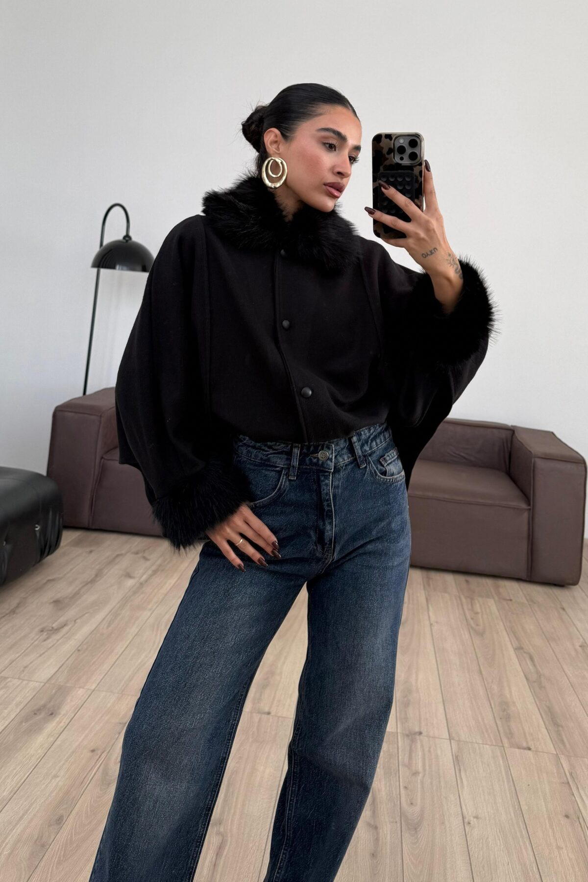Yarasa Kollu Kürk Detaylı Panço Siyah