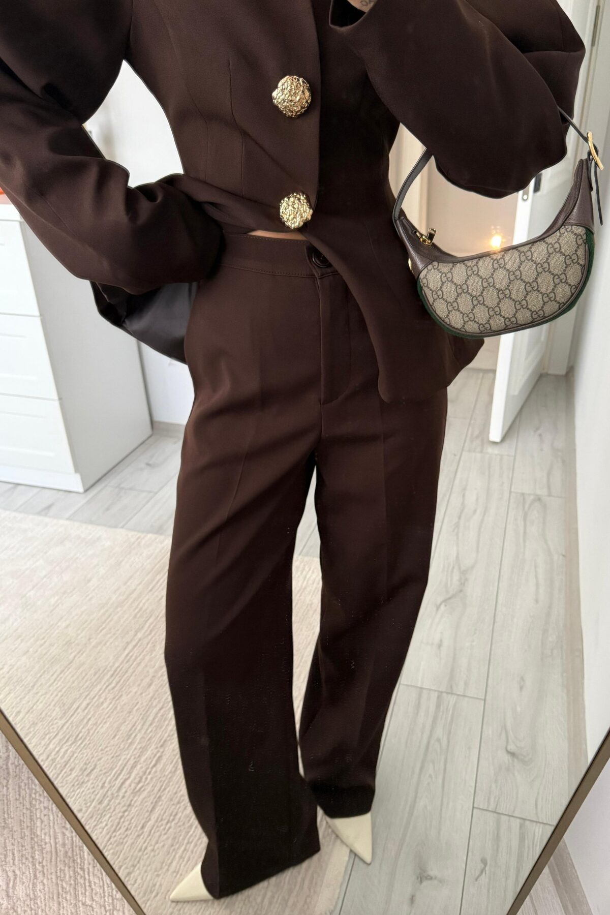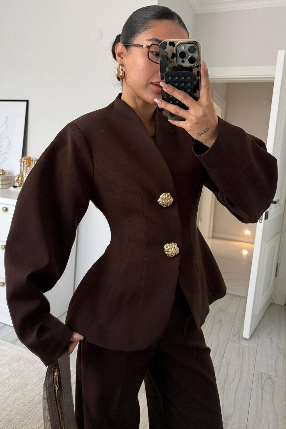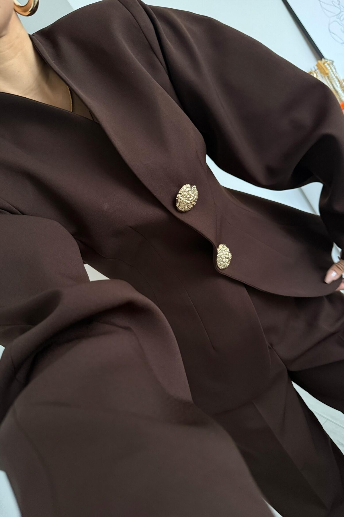 Balon Kollu Gold Düğmeli Blazer Takım Kahverengi