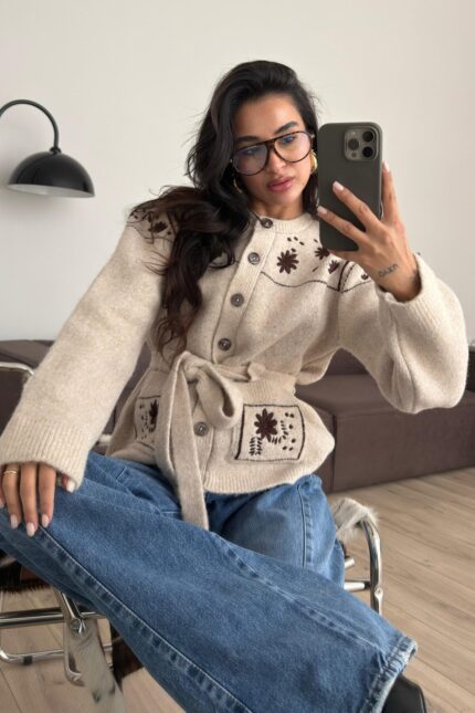 Çiçek Nakışlı Beli Bağlamalı Hırka Kahverengi