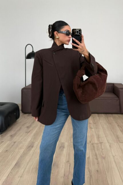 Tek Düğmeli Dik Yakalı Ceket Acı Kahve