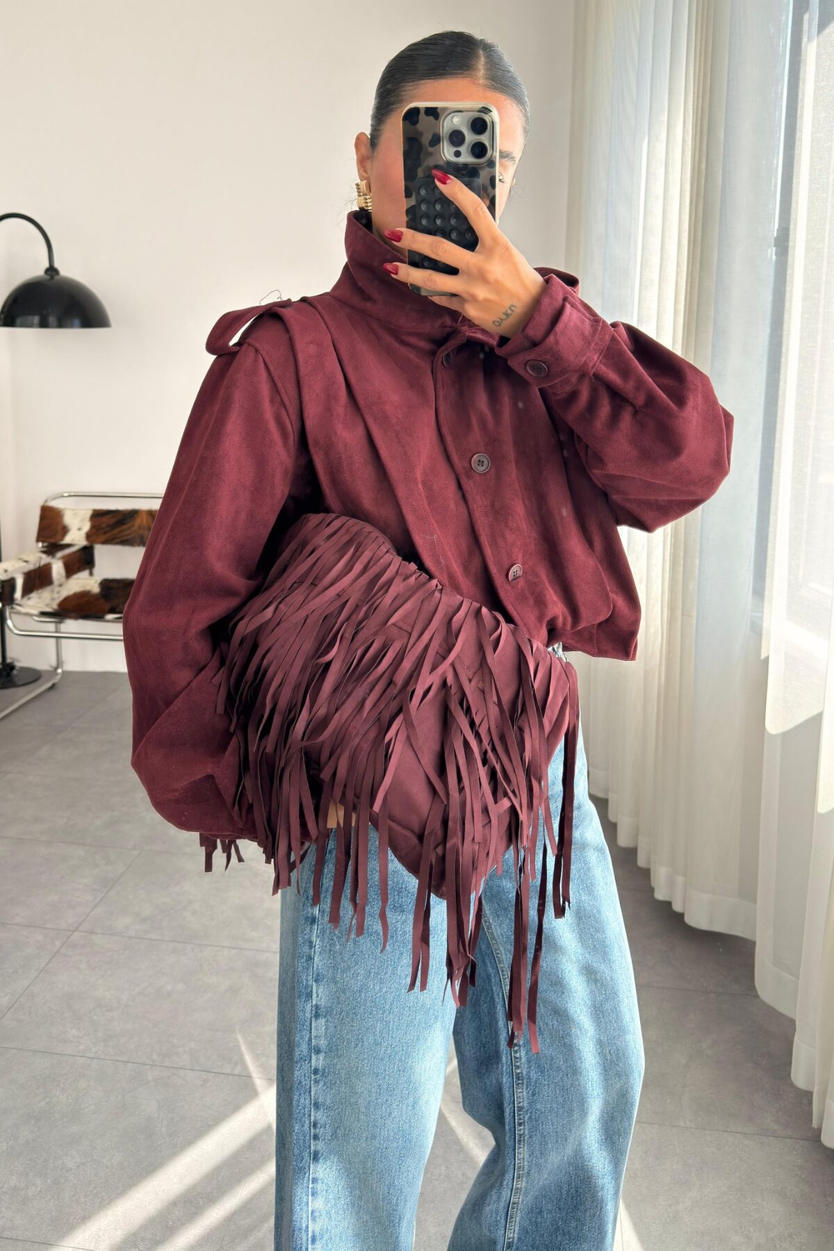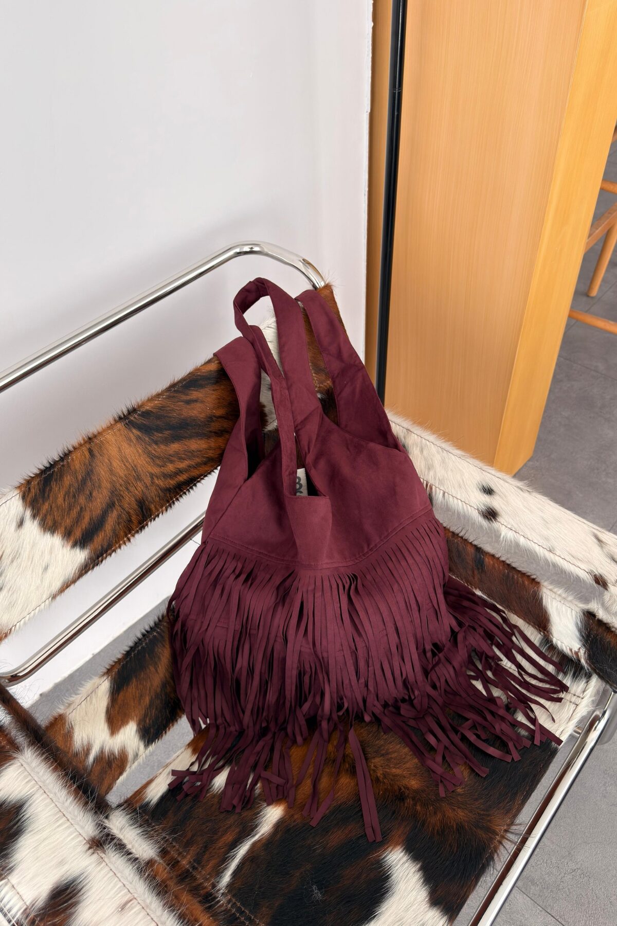 Kovboy Püsküllü süet Çanta Mürdüm