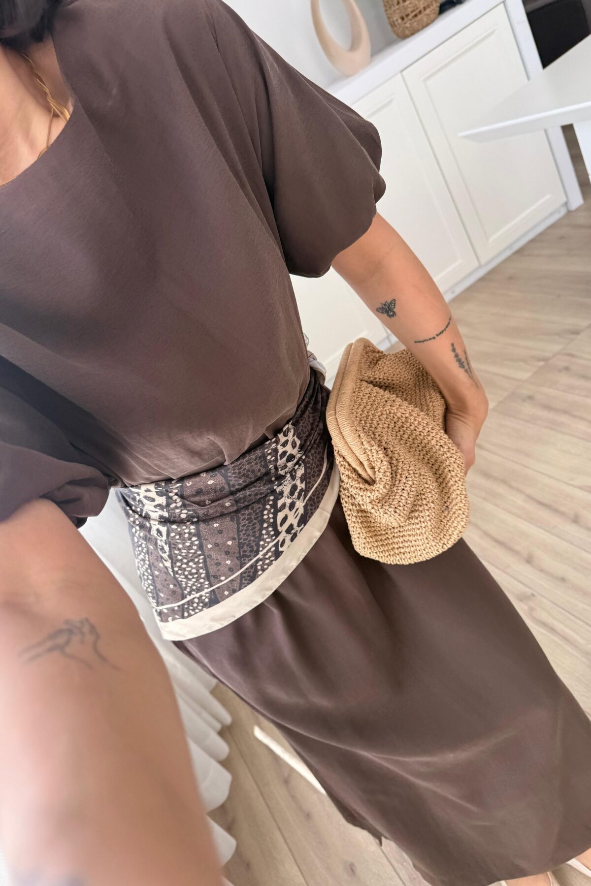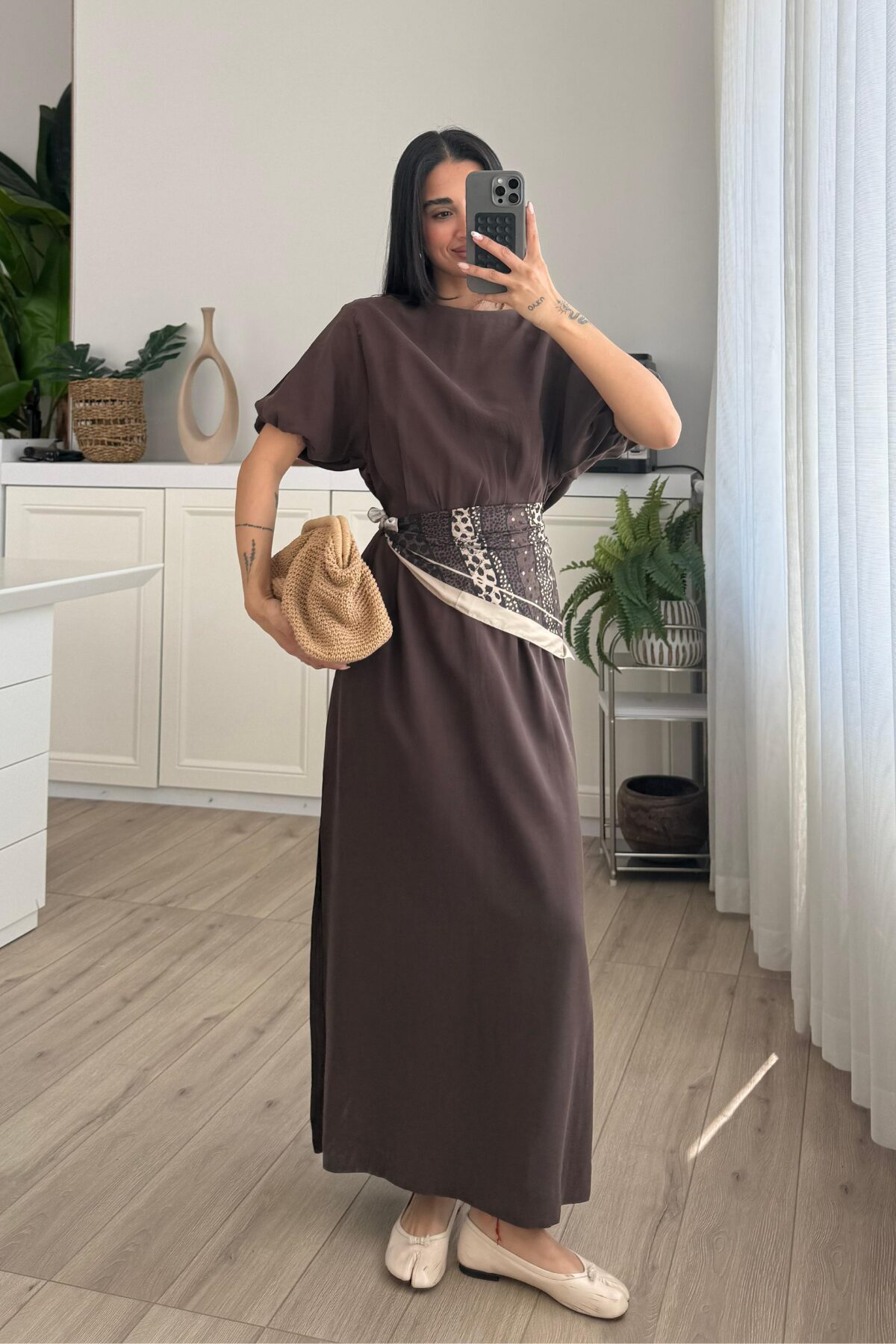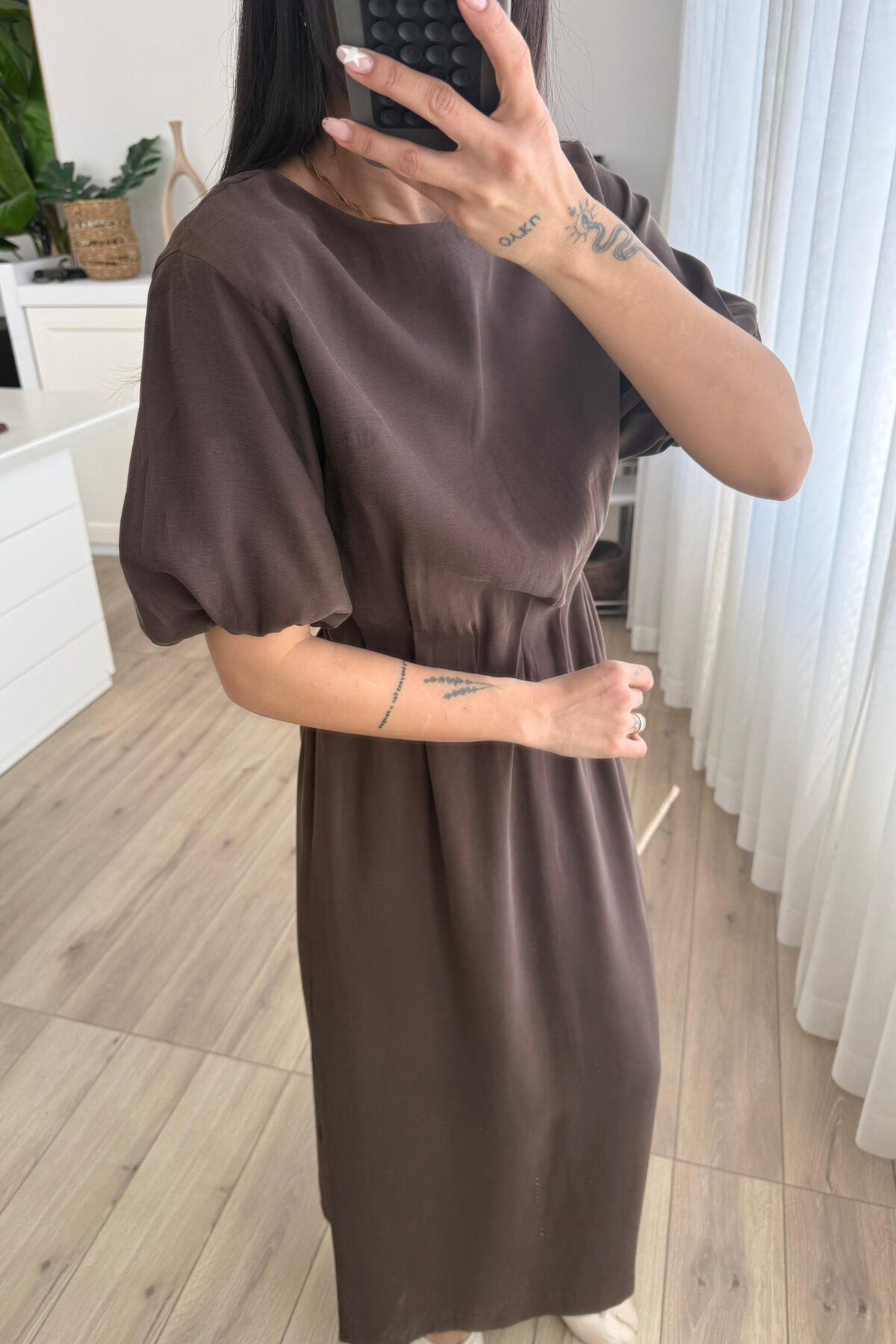 Andreen Beli Pileli Balon Kol Elbise Kahverengi