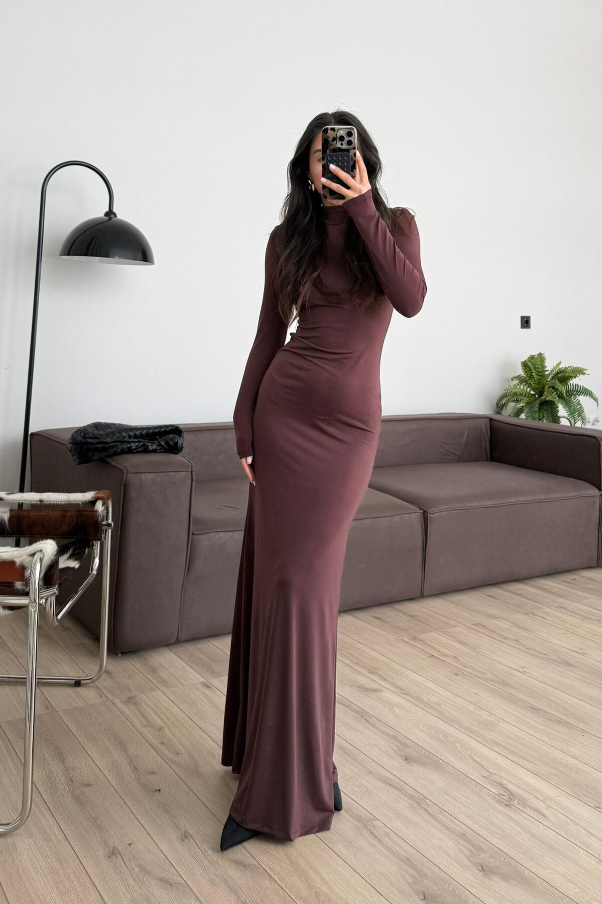 Balıkçı Yaka Vücudu Saran Elbise Kahverengi