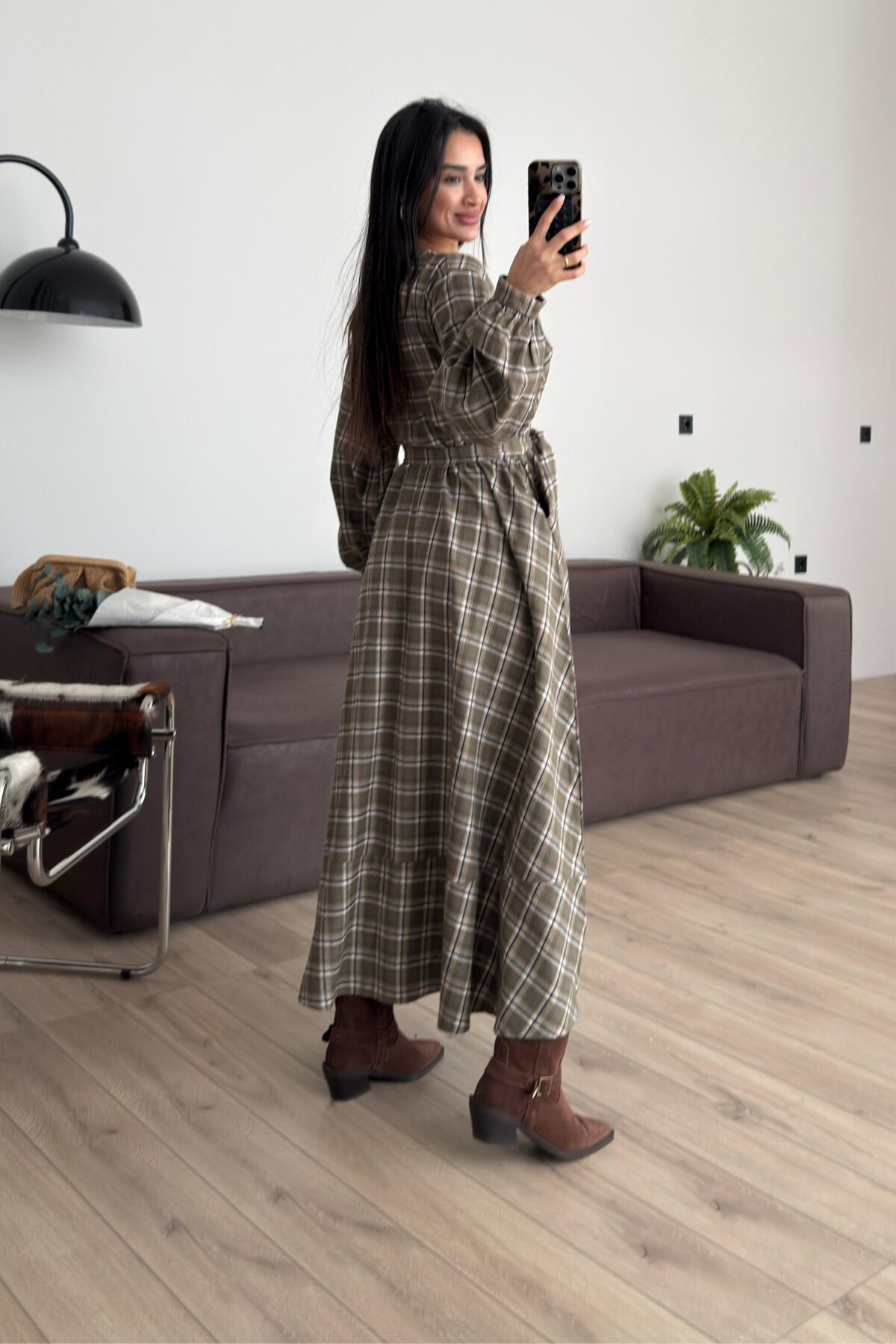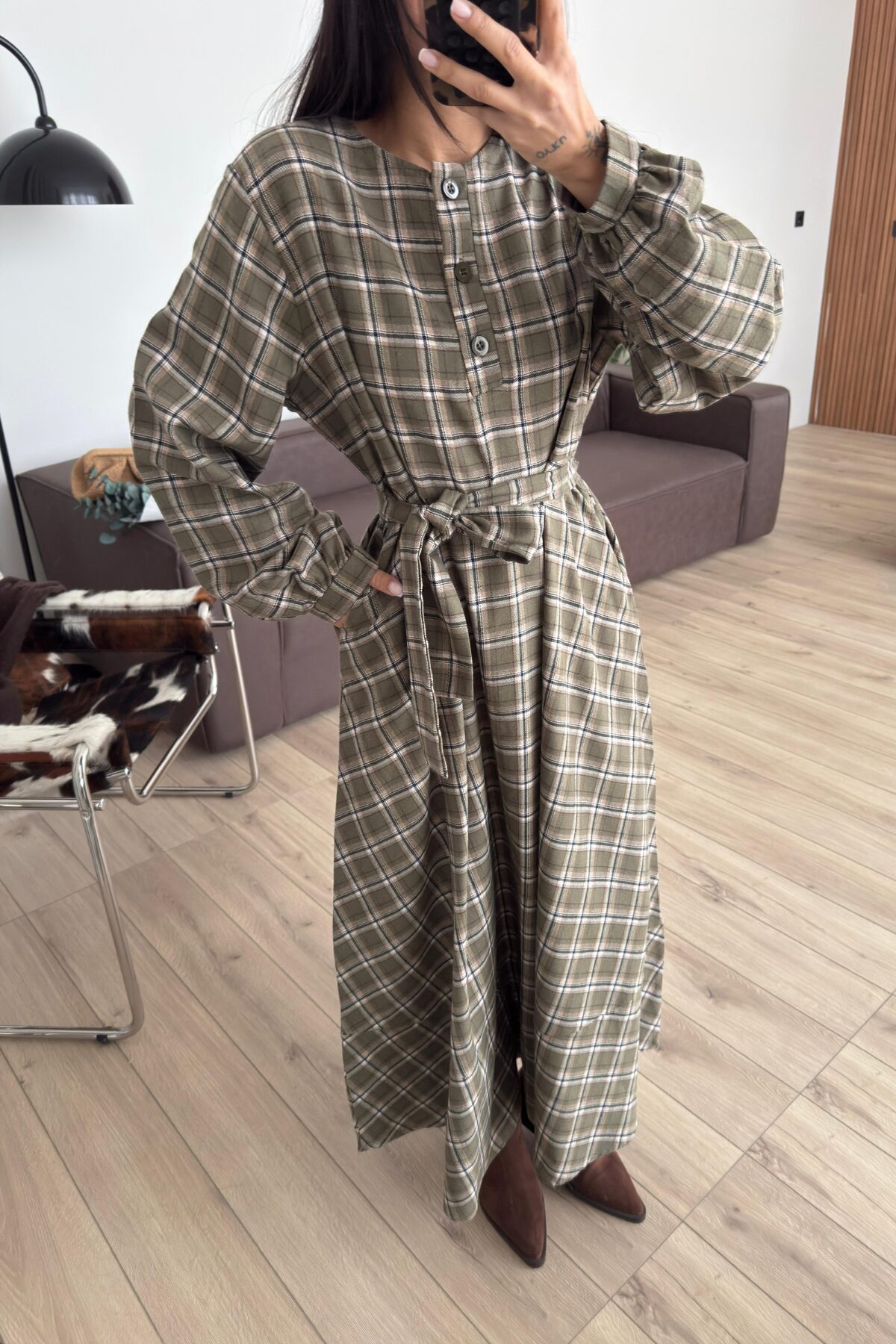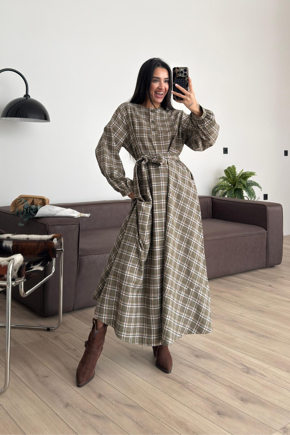“Beli Bağlamalı Ekose Elbise Haki” için yorum yapan ilk kişi siz olun
