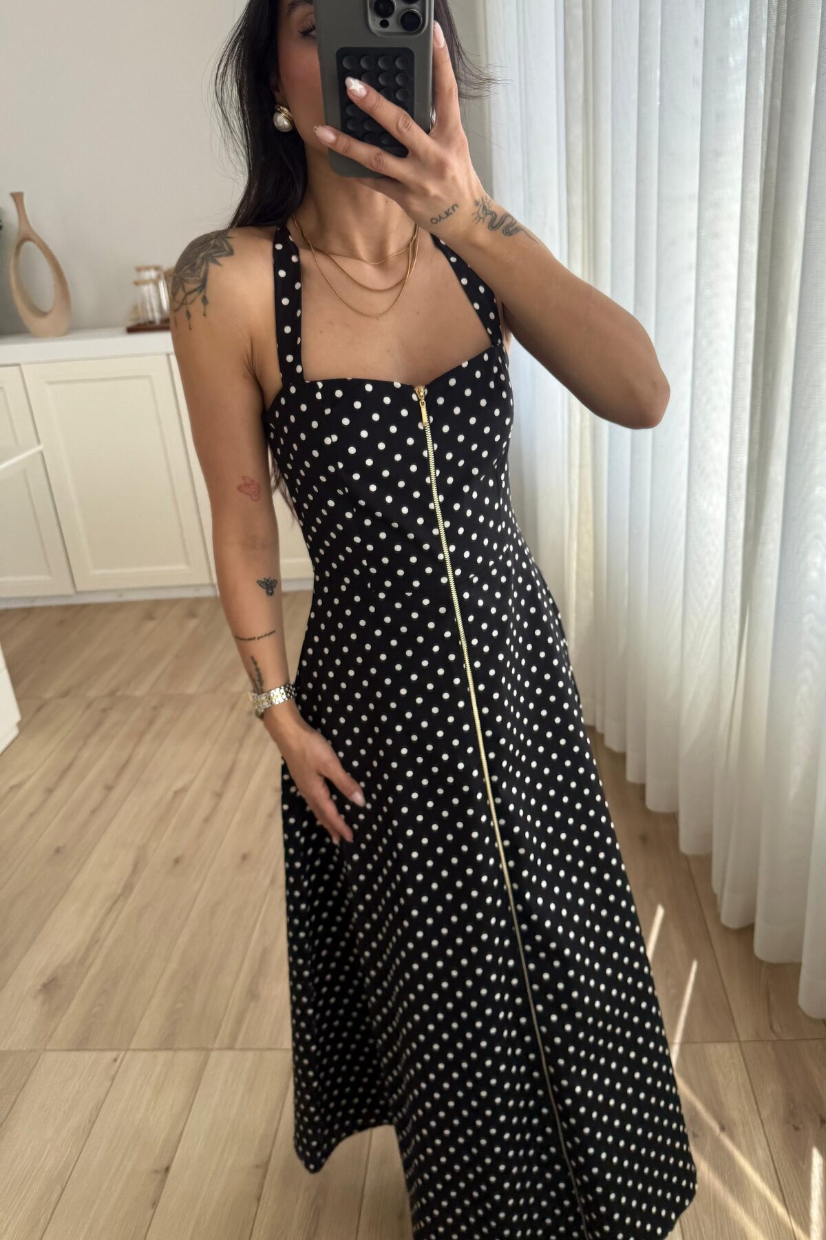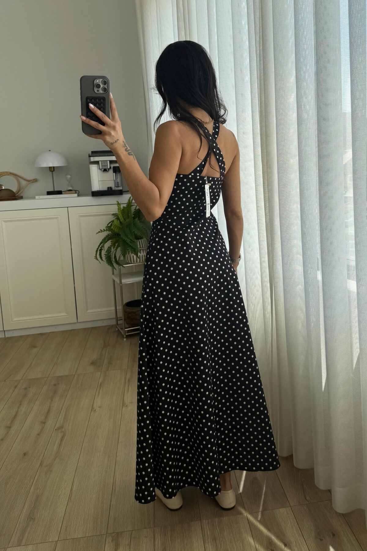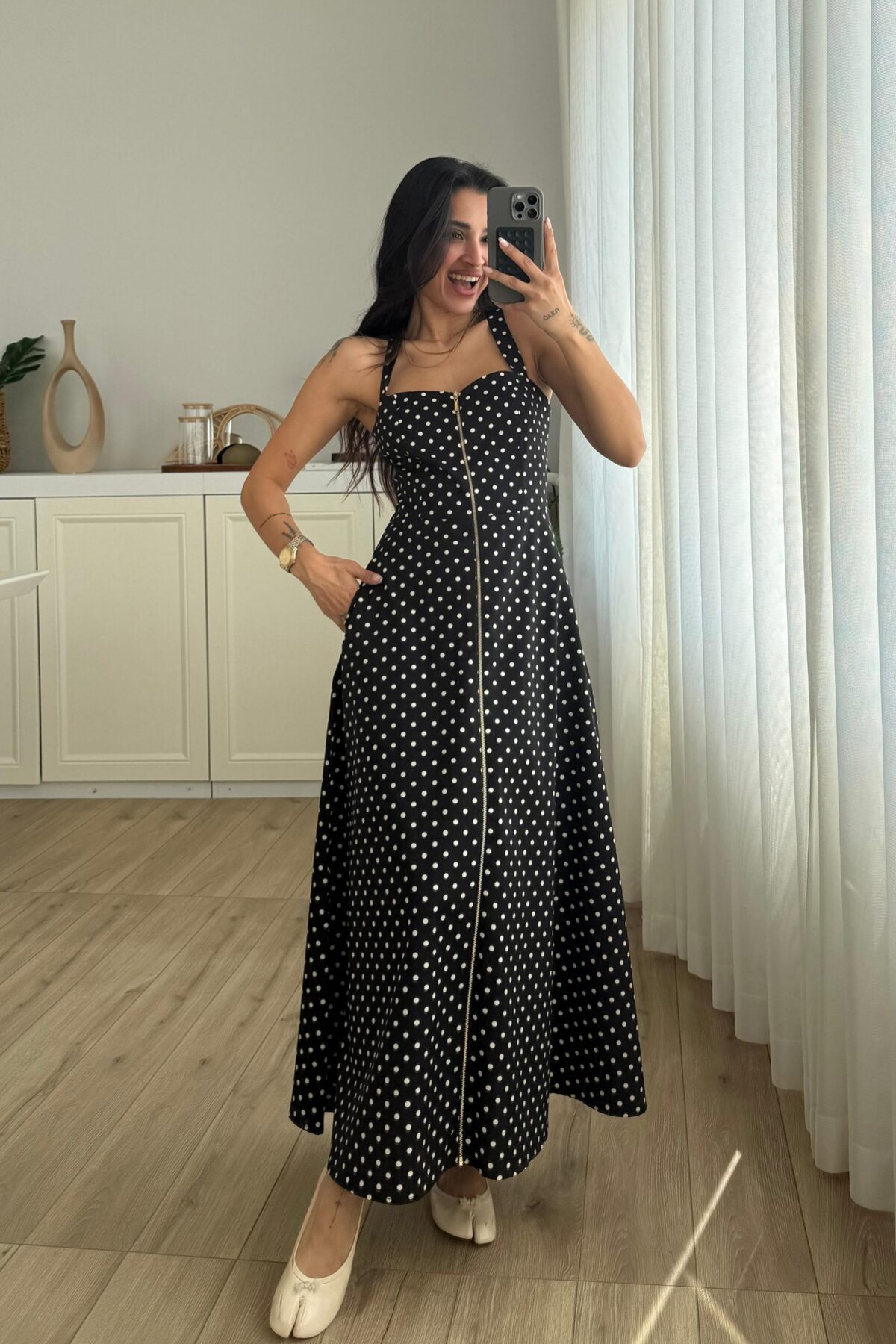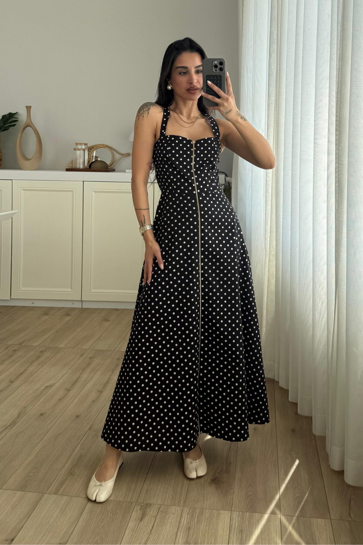 Çapraz Askılı Puantiyeli Fermuarlı Elbise Siyah
