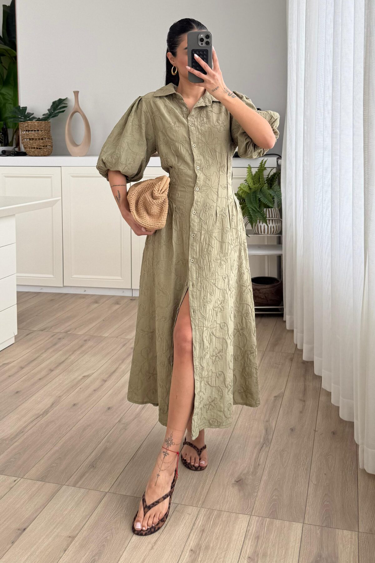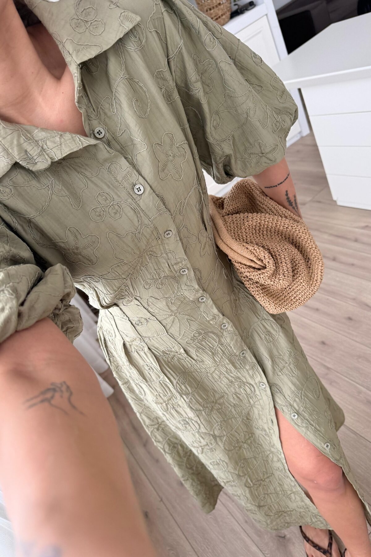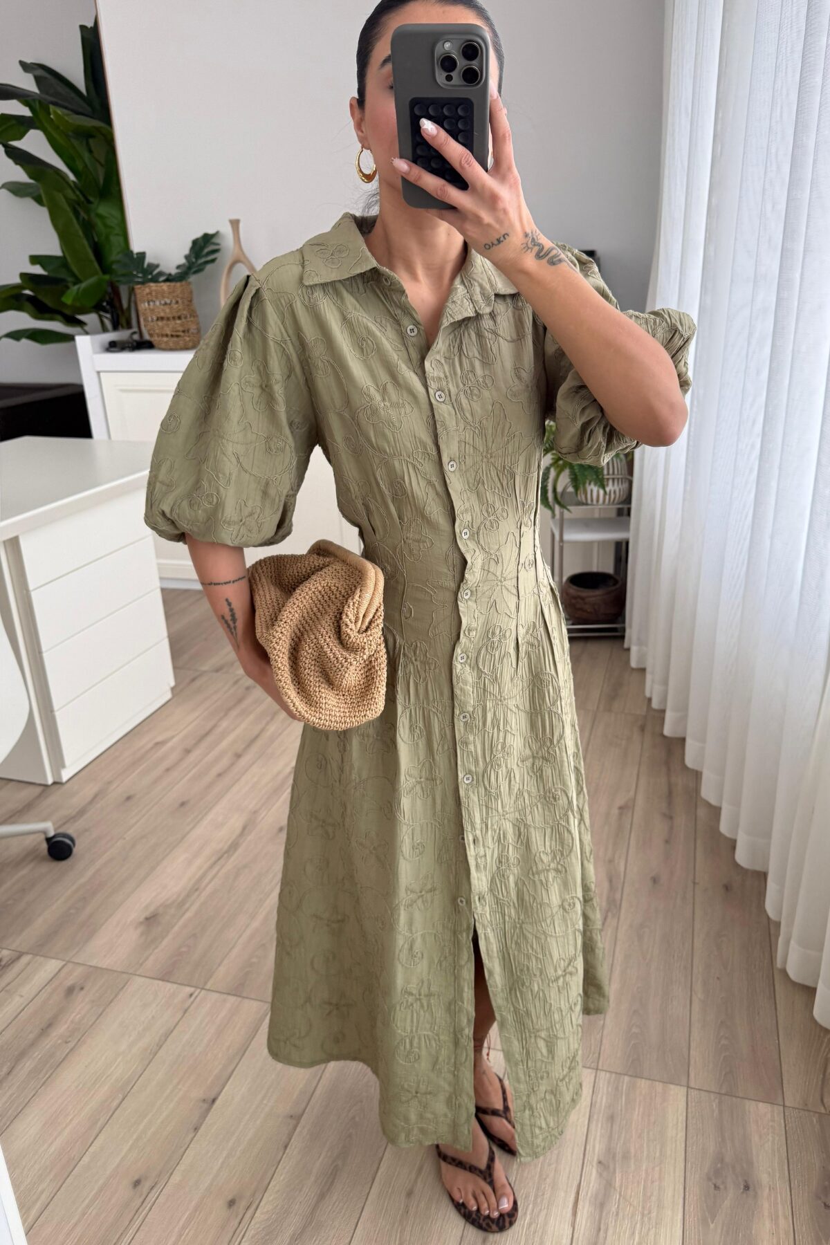 Çiçek Nakışlı Uzun Gömlek Elbise Haki