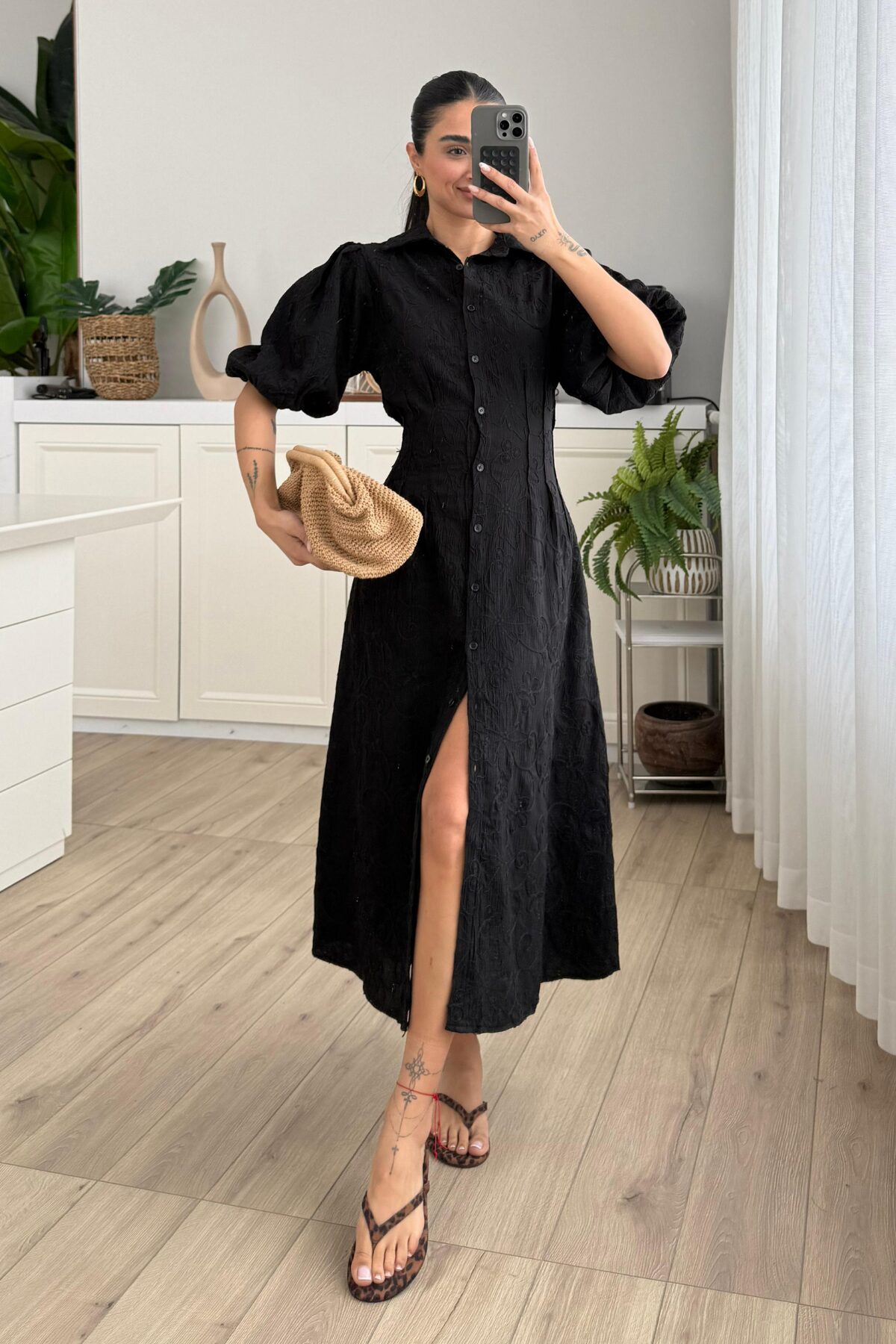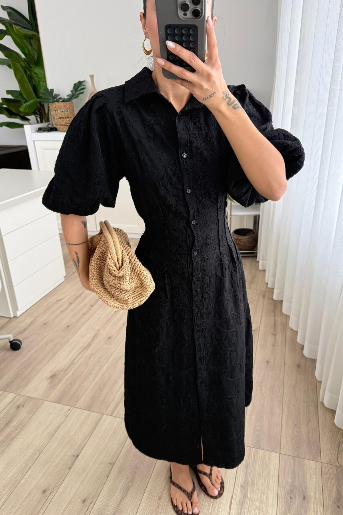 Çiçek Nakışlı Uzun Gömlek Elbise Siyah