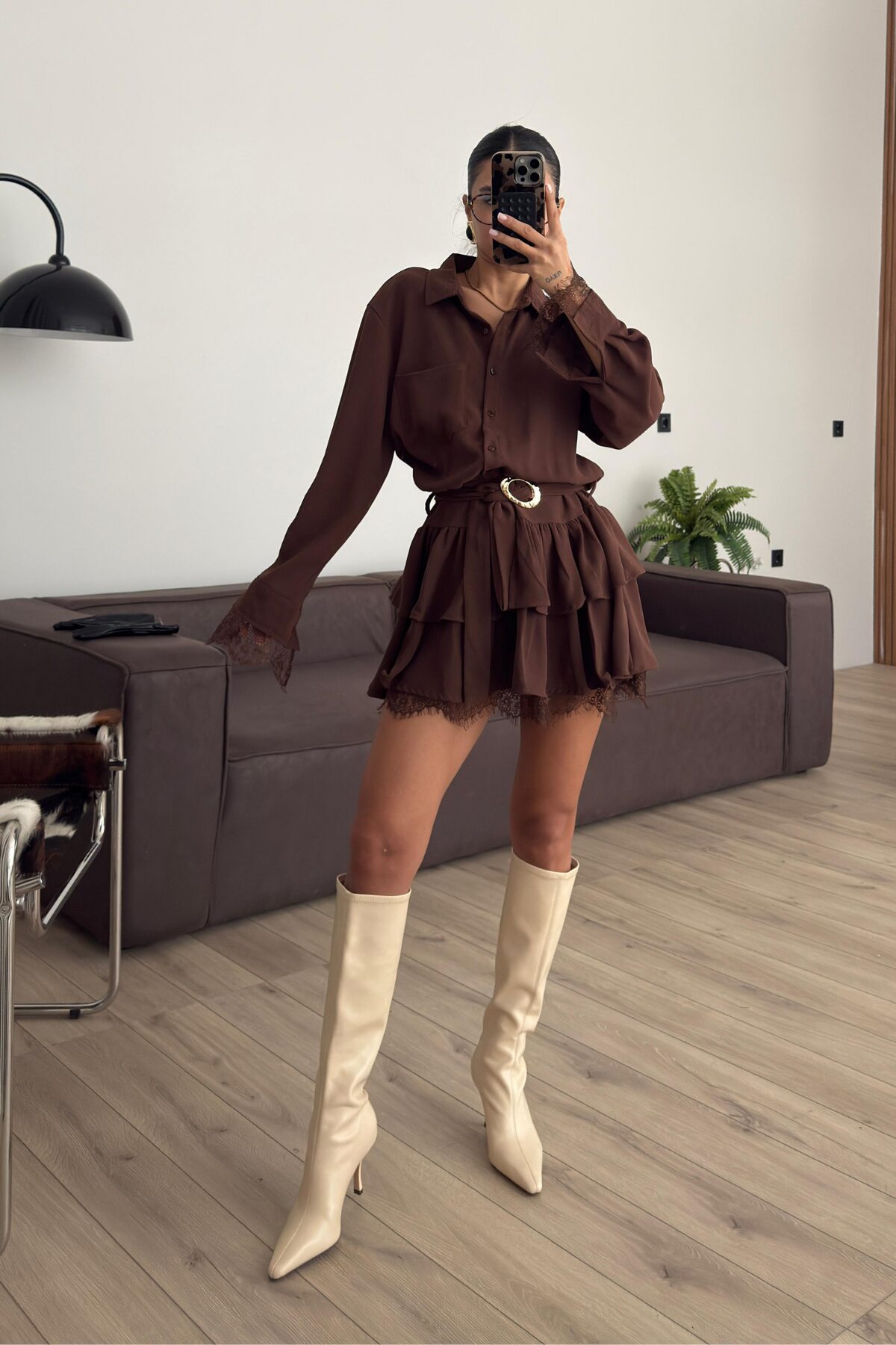 Güpür Detaylı Gold Tokalı Kahverengi Elbise