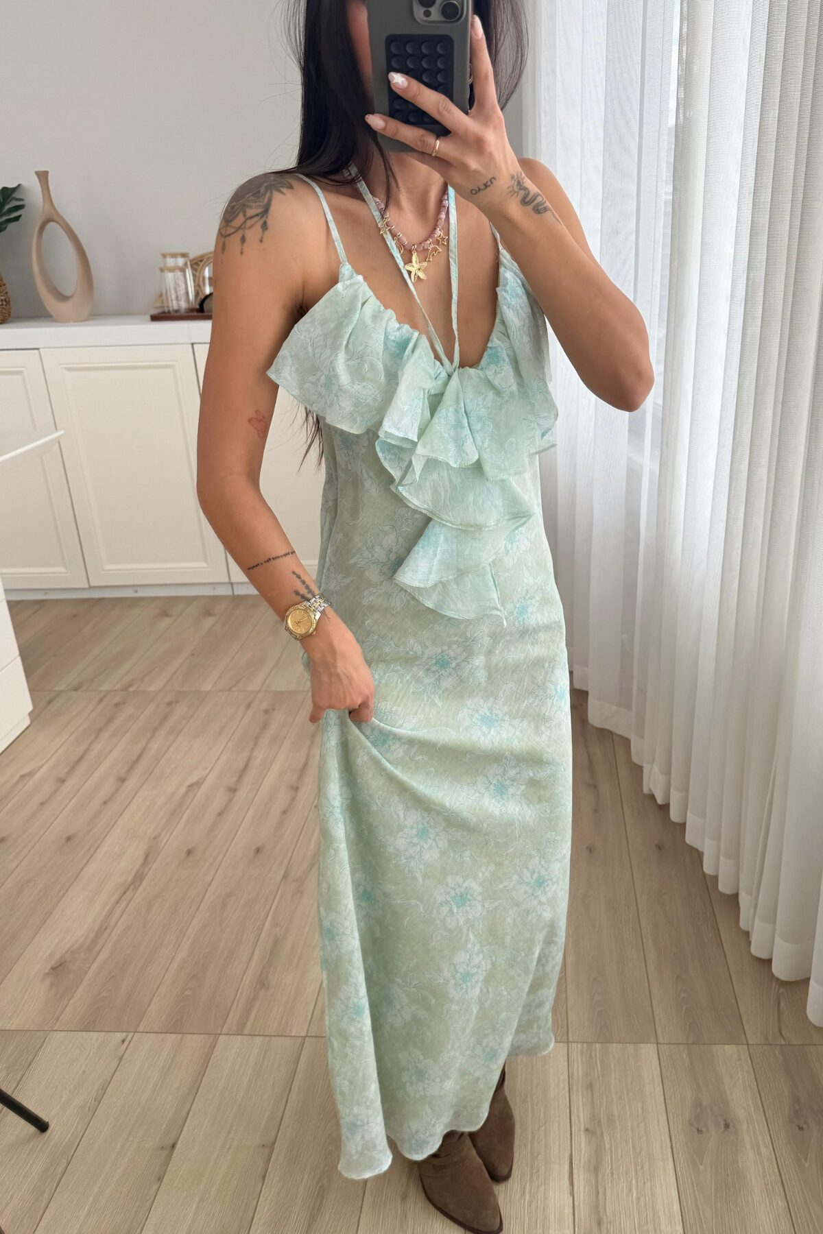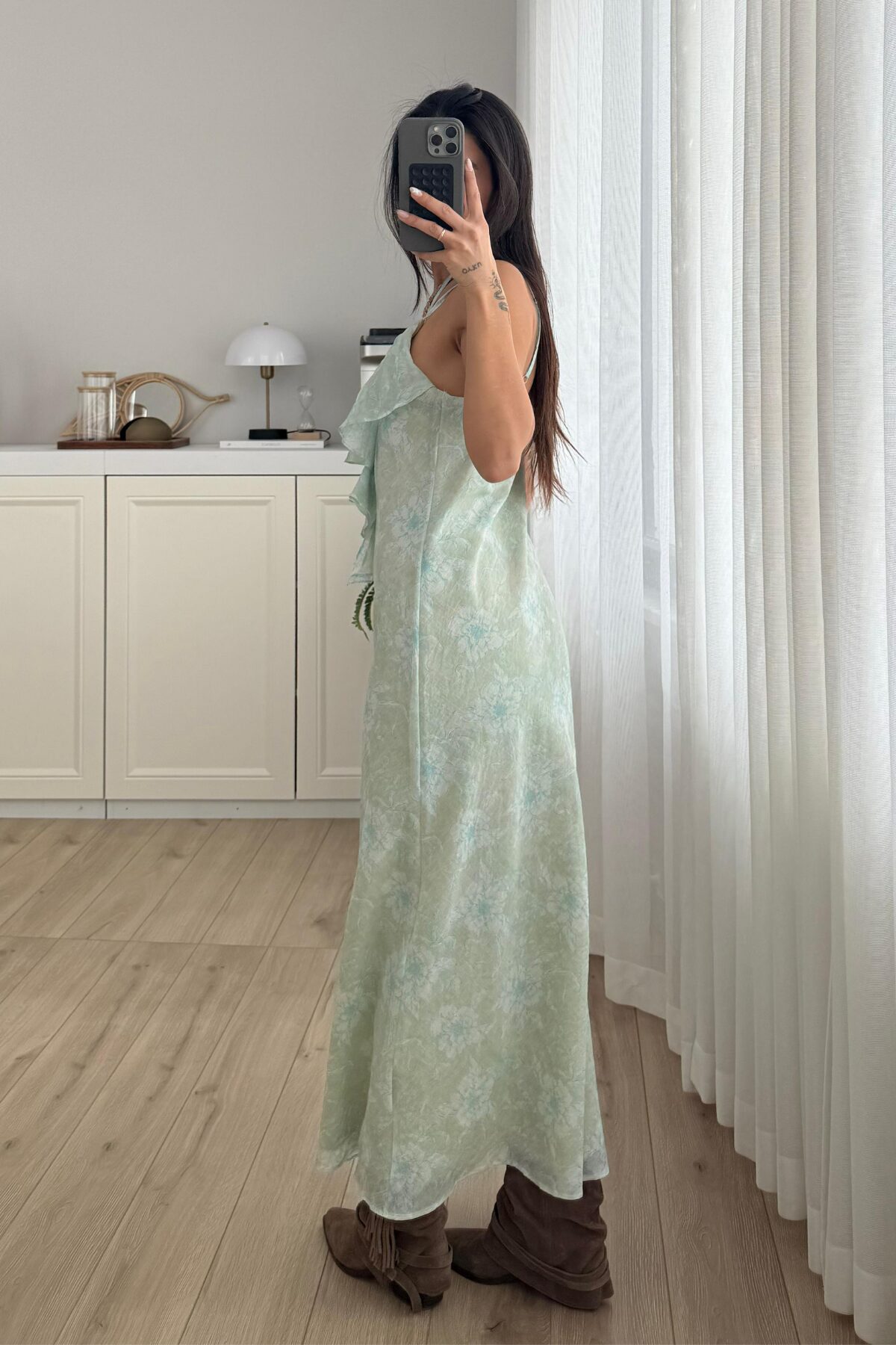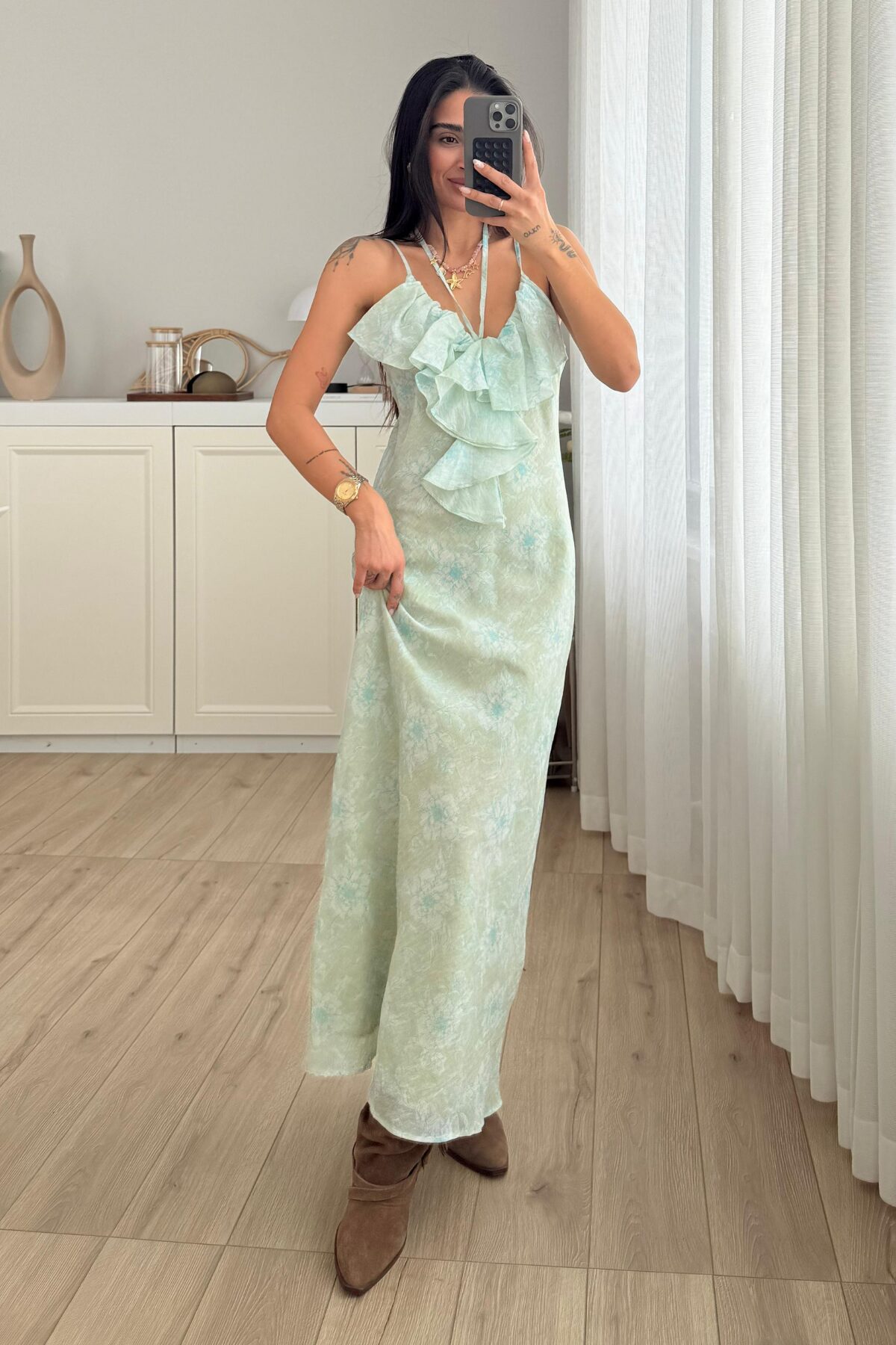 İp Askılı Fırfırlı Çiçekli Elbise Yeşil