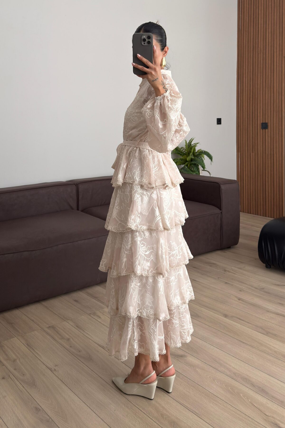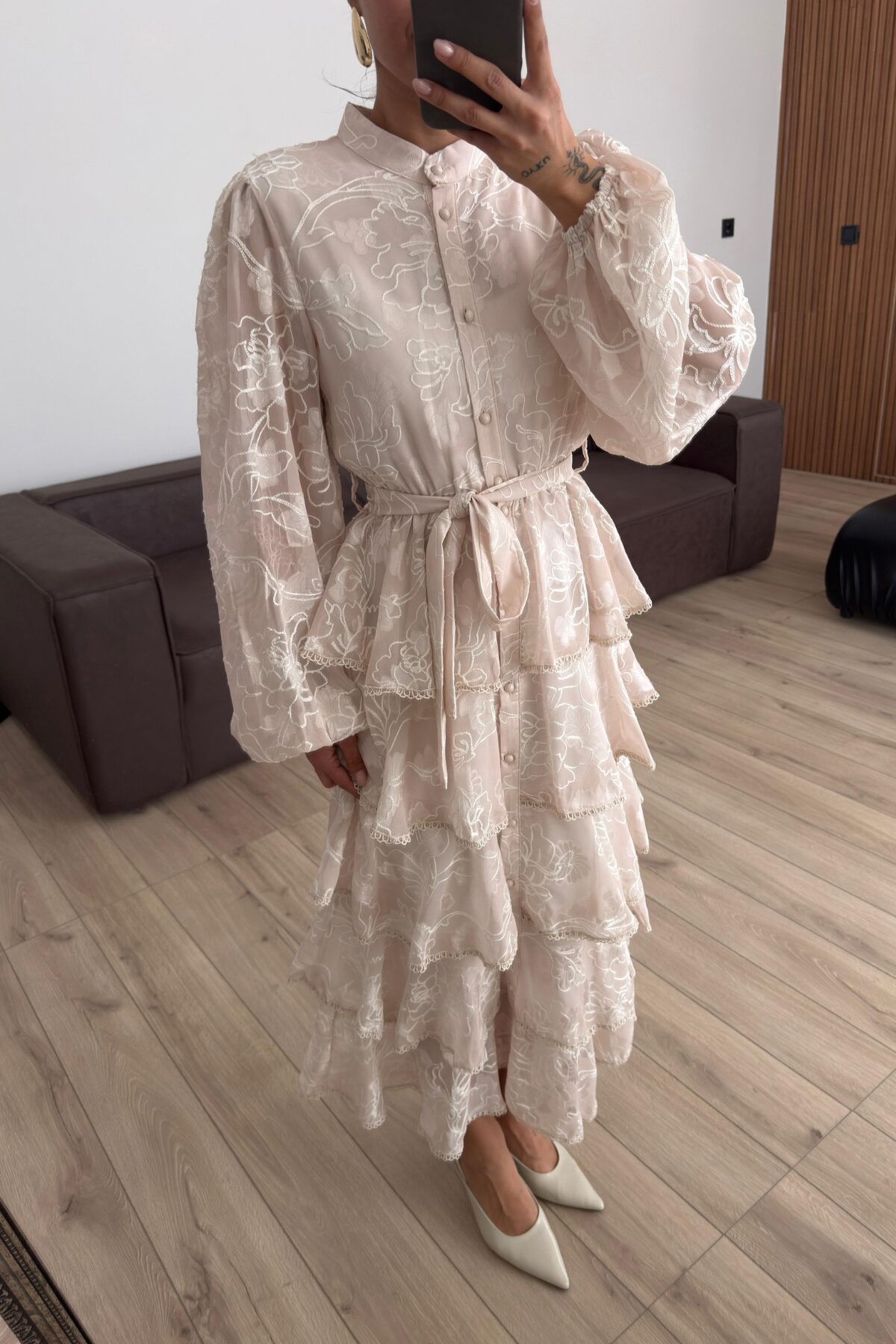 Kat Kat Volanlı Tül Elbise Bej