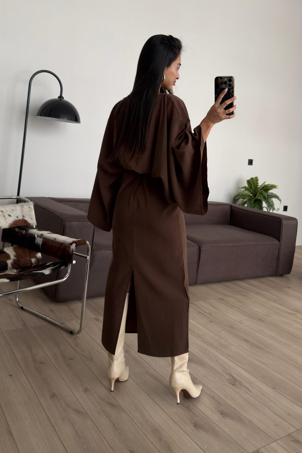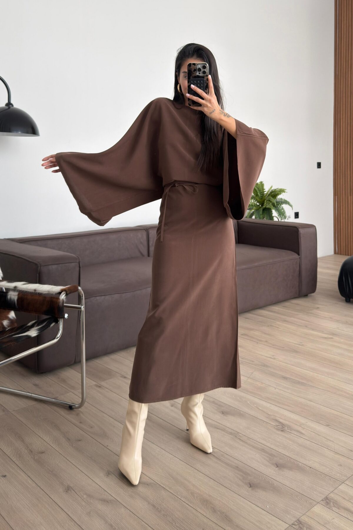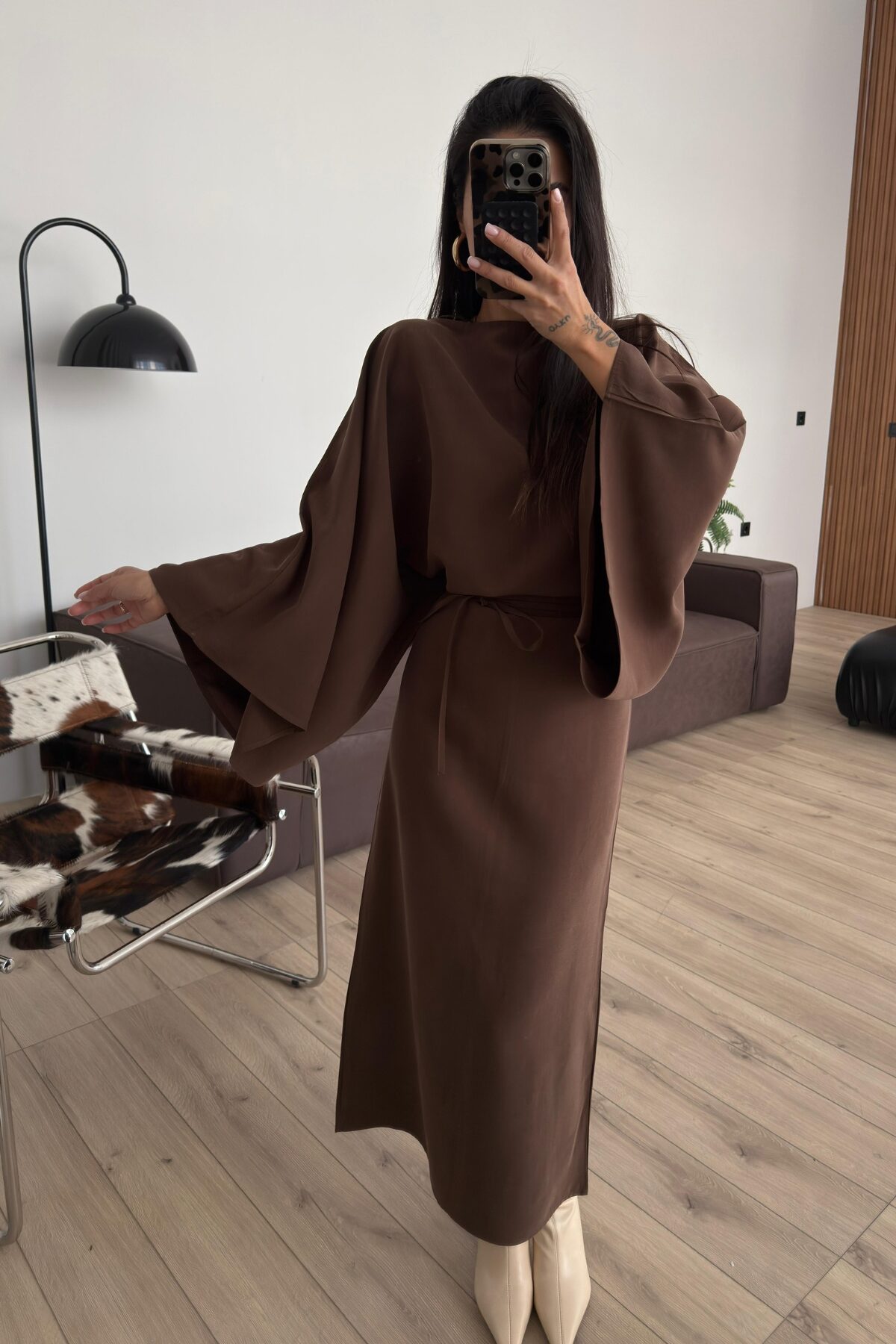 Massi Geniş Kollu Belden Bağlamalı Elbise Kahverengi