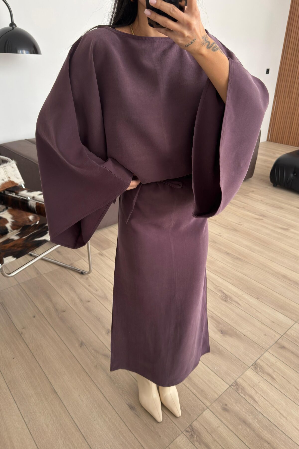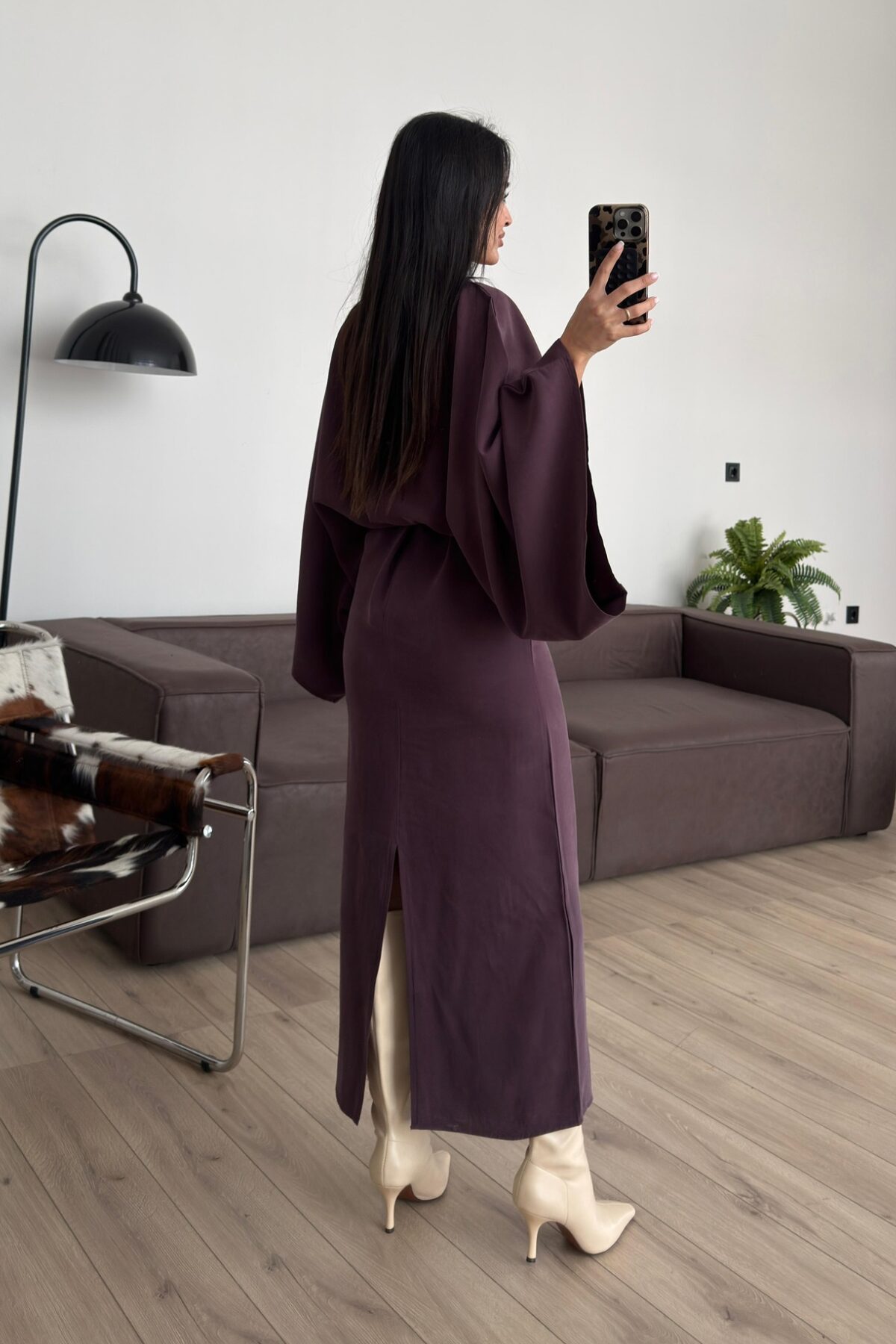 Massi Geniş Kollu Belden Bağlamalı Elbise Mürdüm