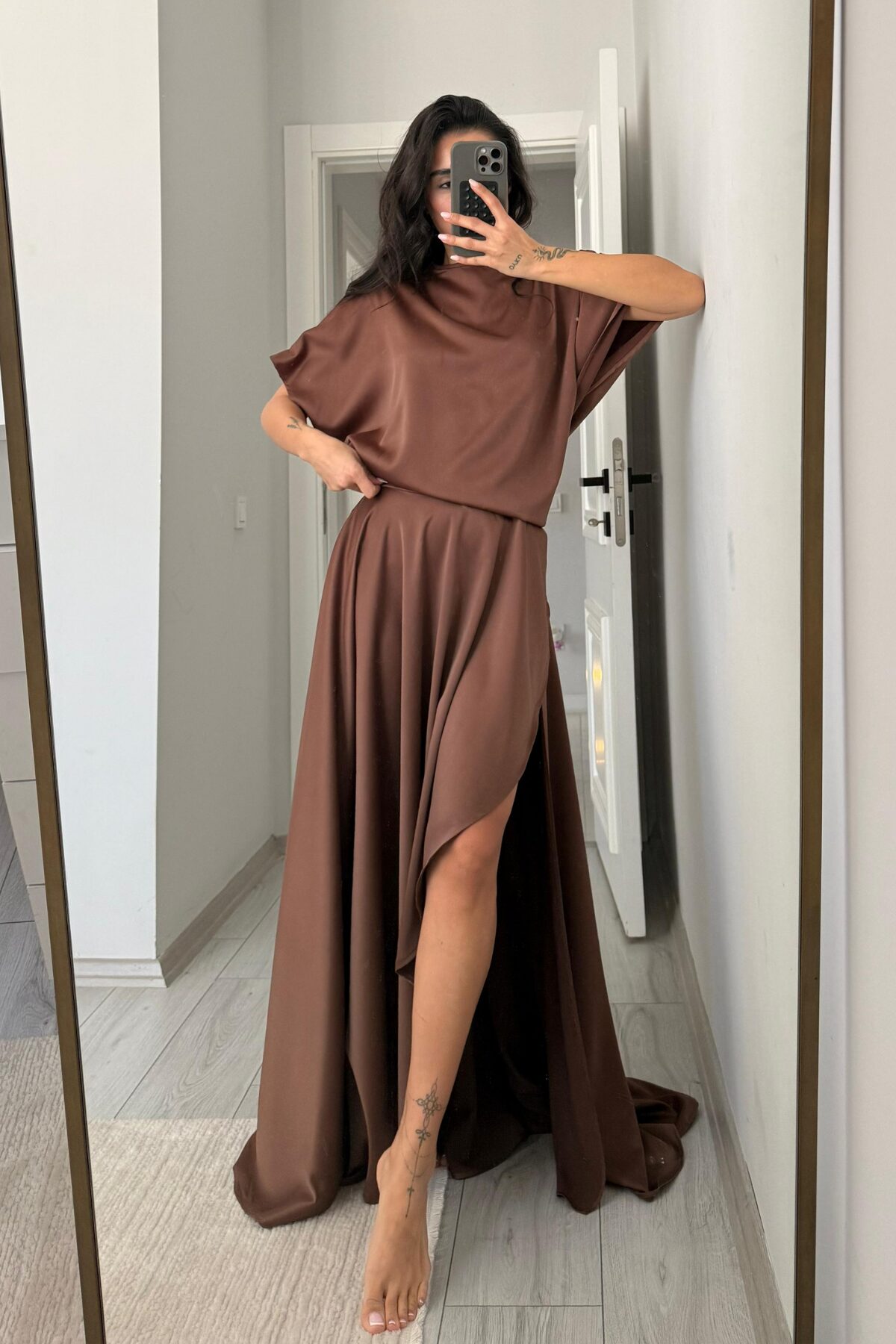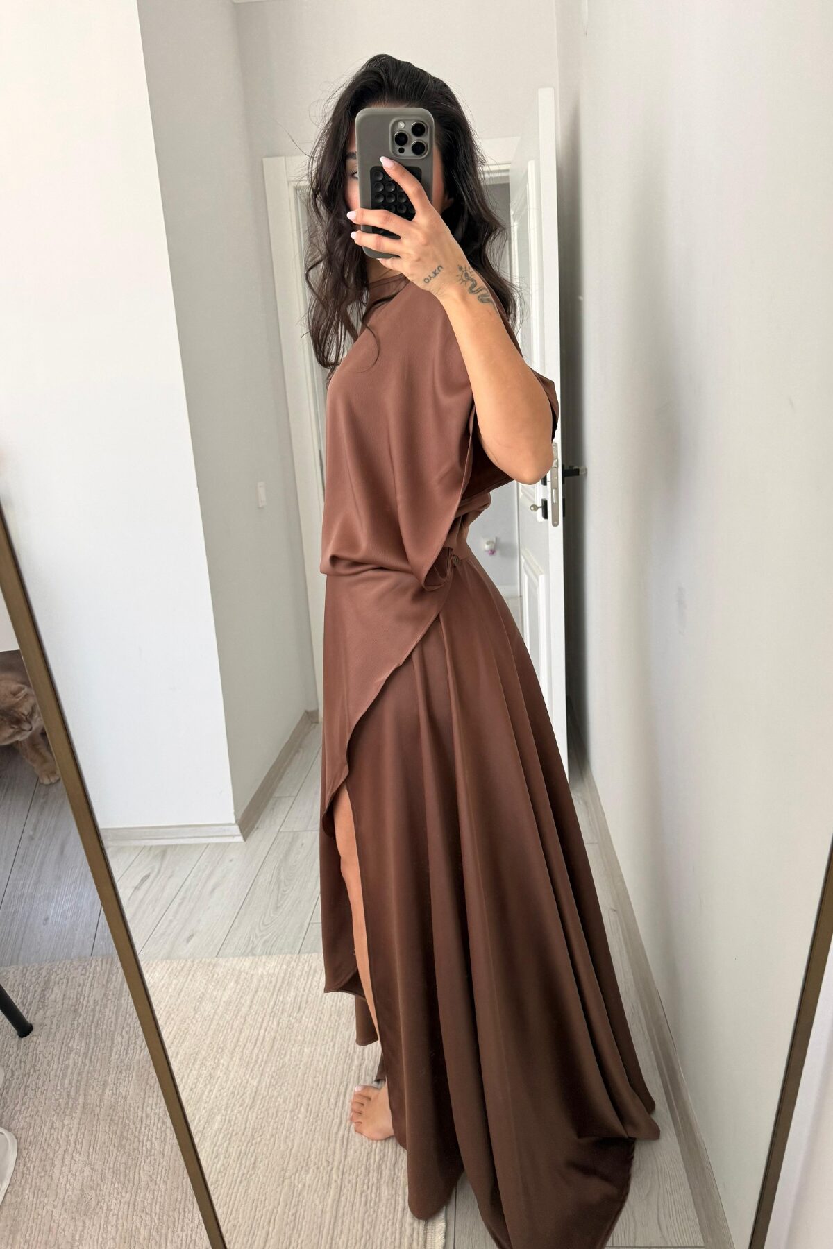 “Ous Belden Oturtmalı Yırtmaçlı Saten Elbise Kahverengi” için yorum yapan ilk kişi siz olun