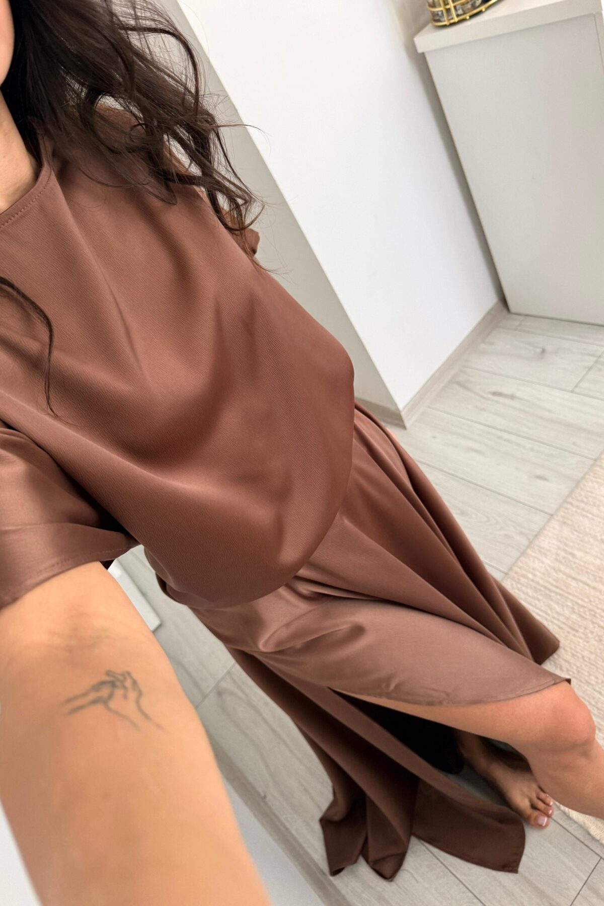 Ous Belden Oturtmalı Yırtmaçlı Saten Elbise Kahverengi