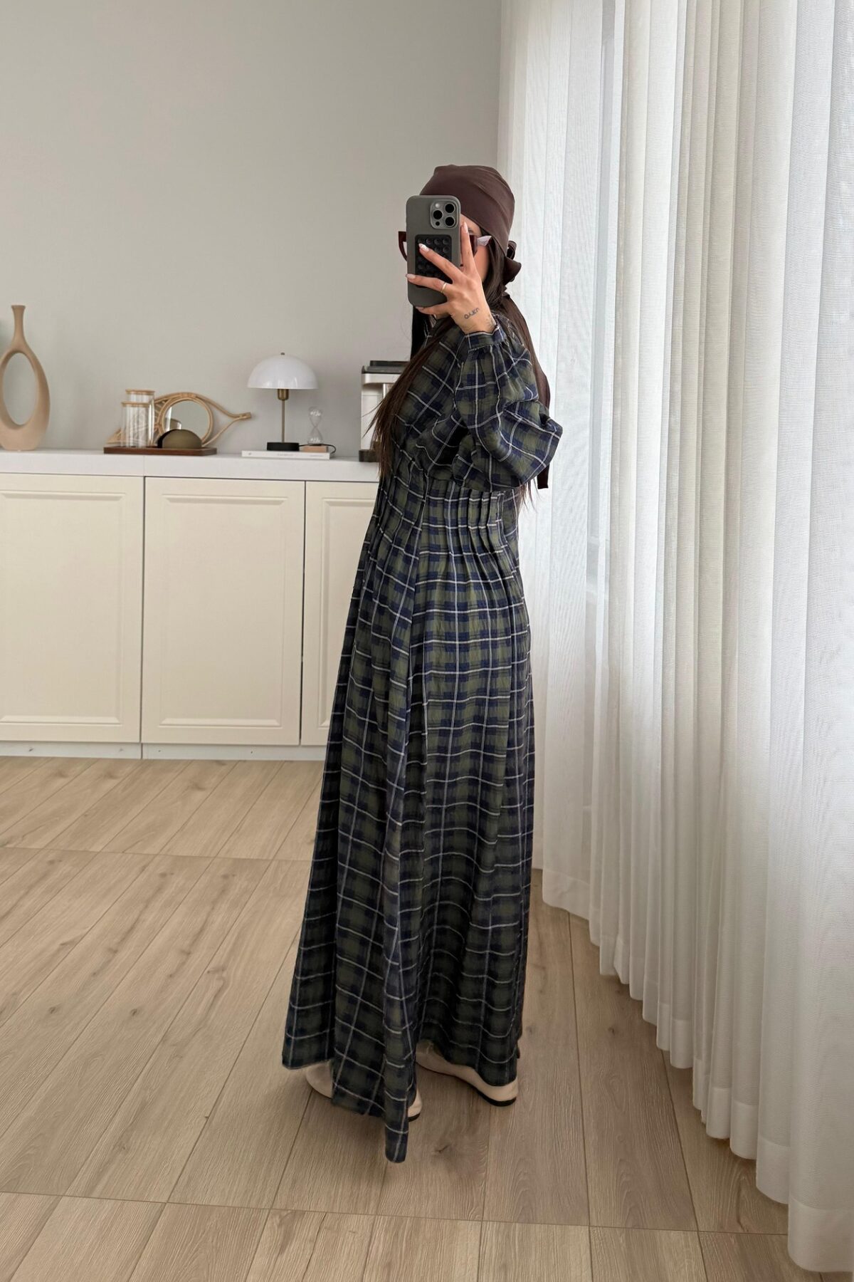Pile Detaylı Ekose Elbise Haki