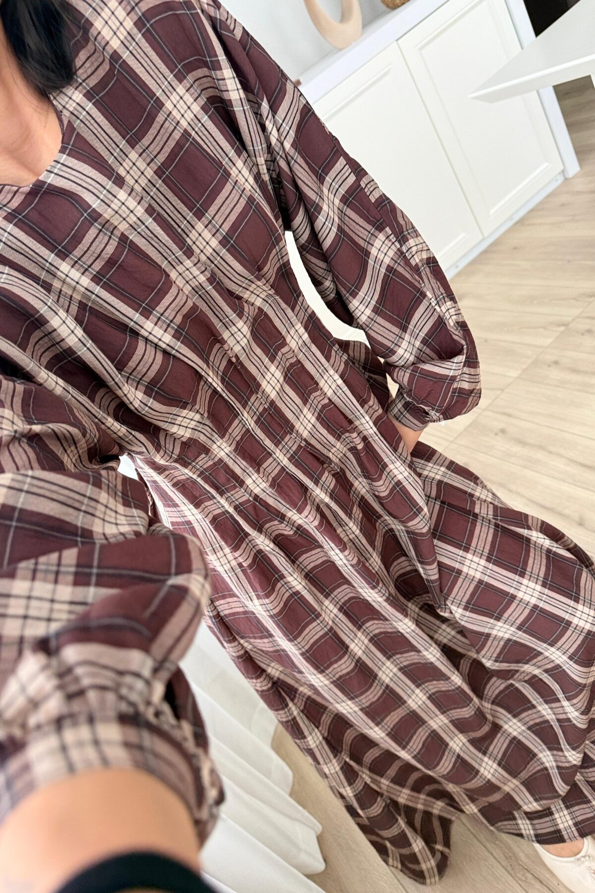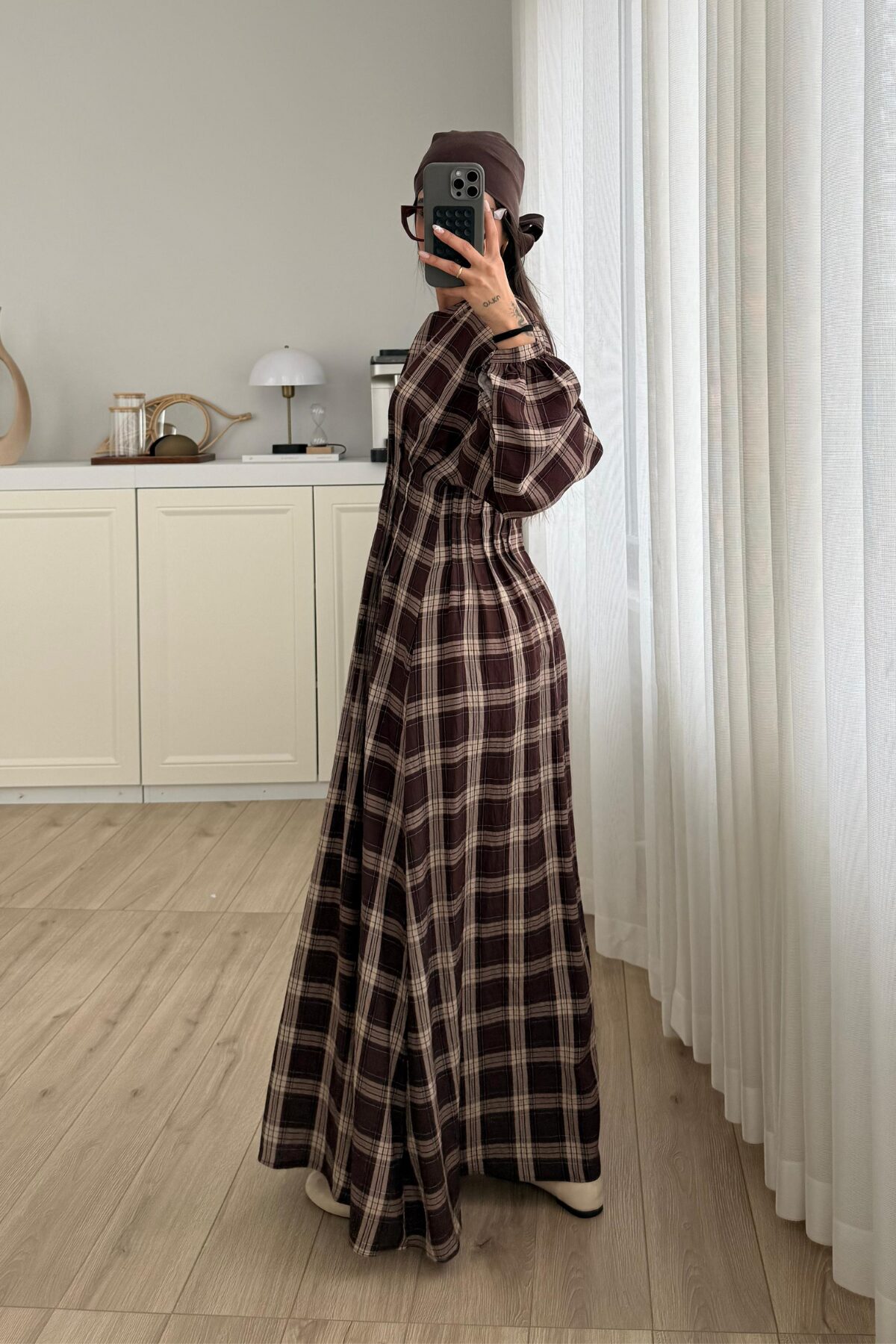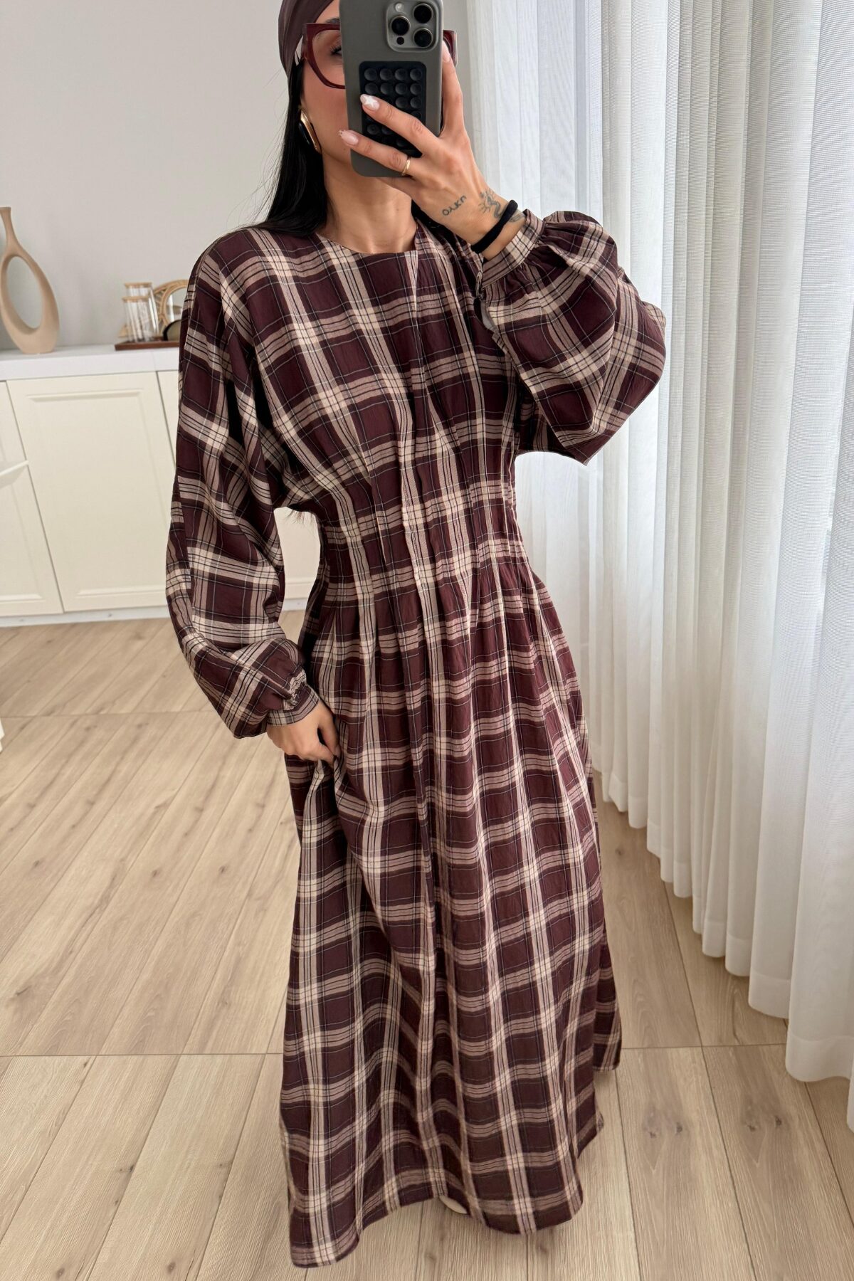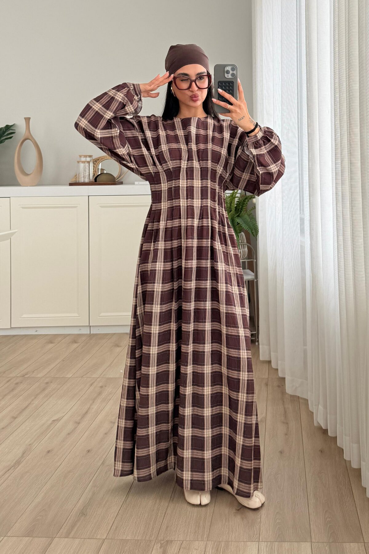 Pile Detaylı Ekose Elbise Sıcak Kahve