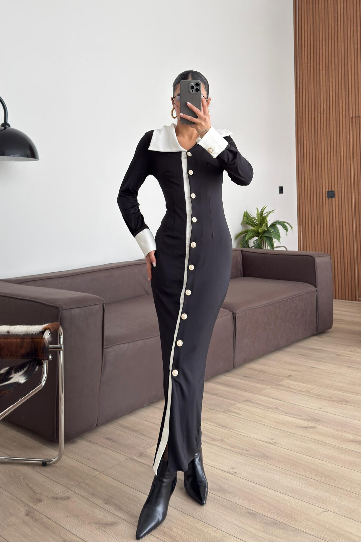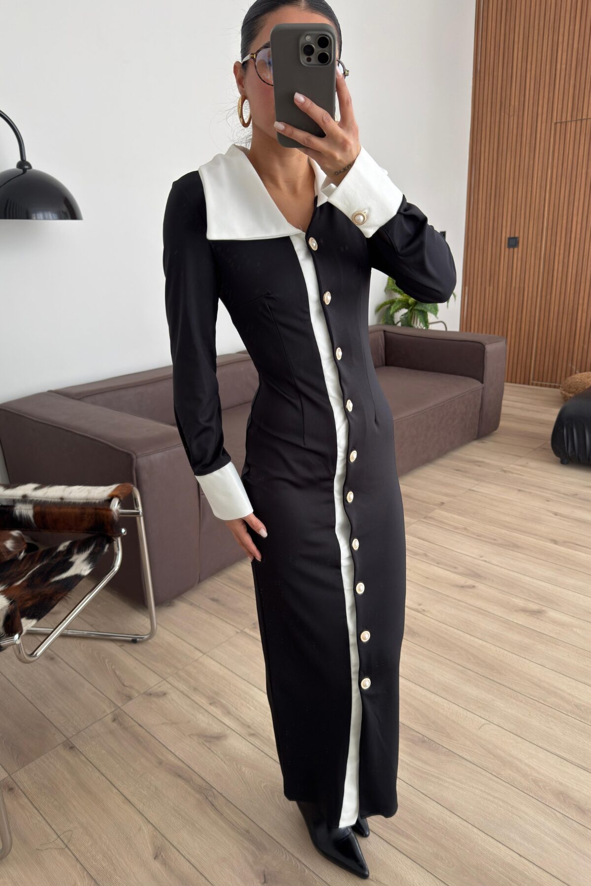 Polo Yaka İnci Düğmeli Siyah Elbise