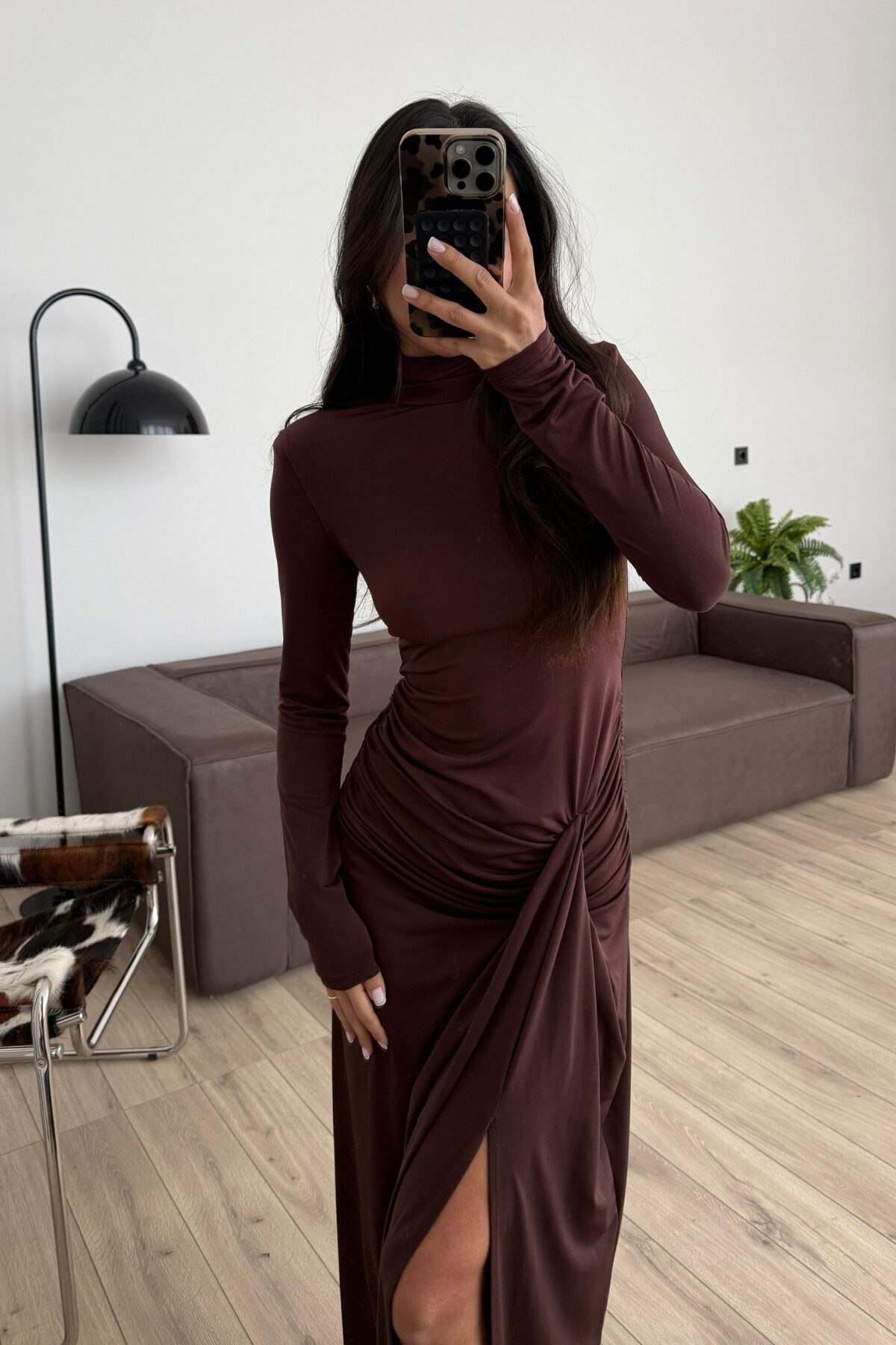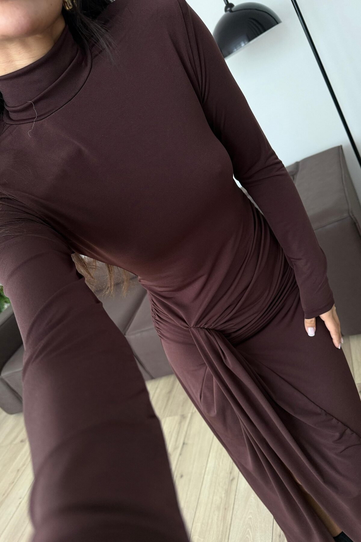 Vatkalı Drapeli Uzun Elbise Kahverengi