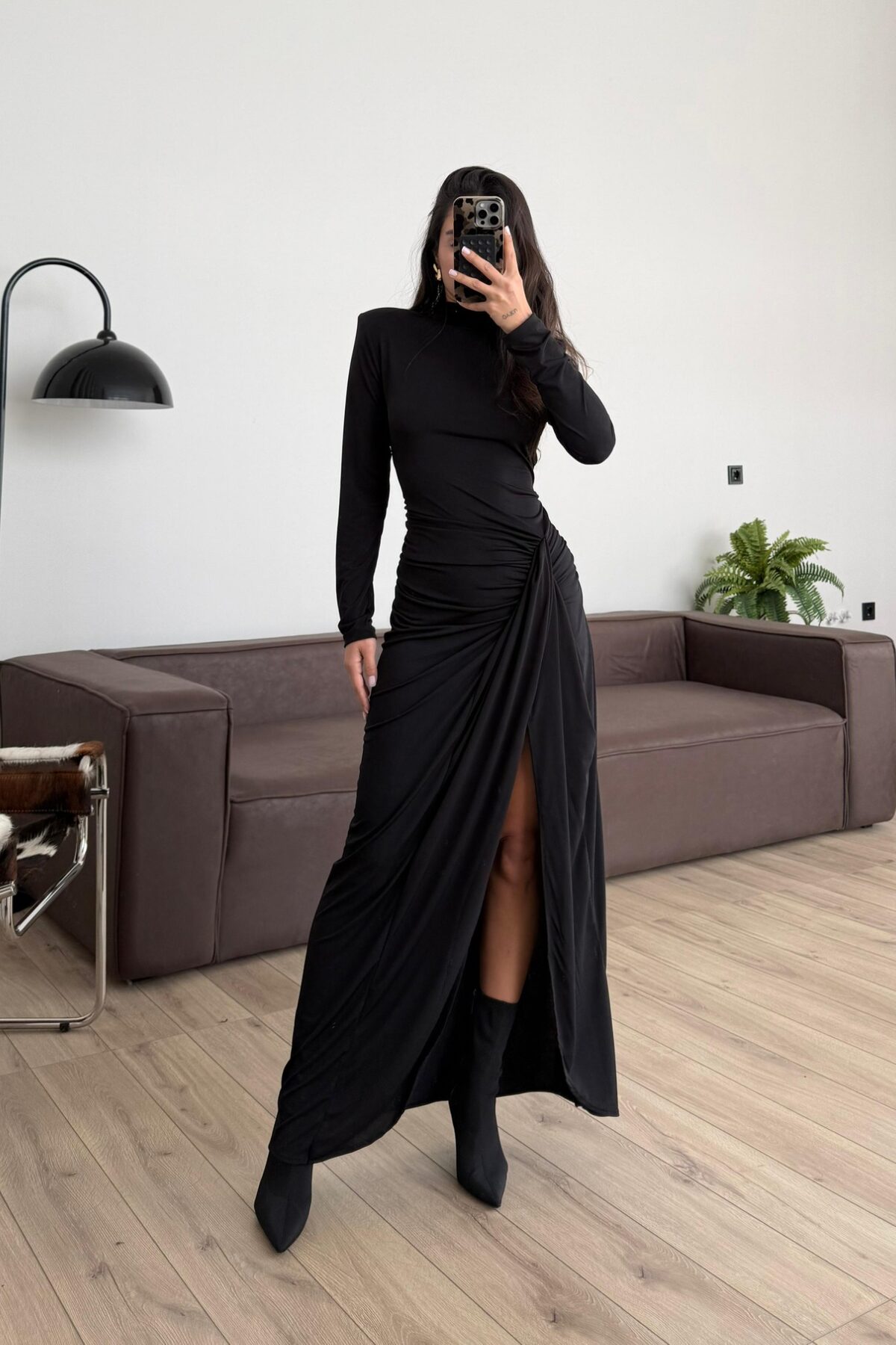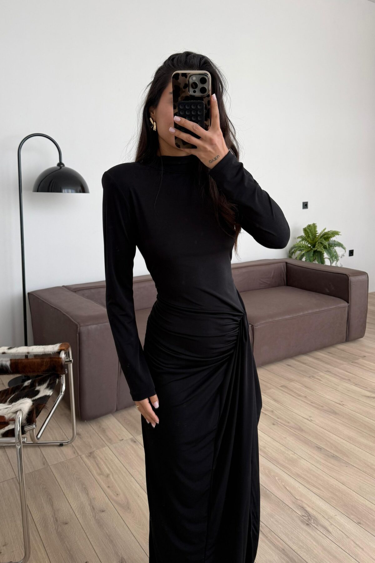 Vatkalı Drapeli Uzun Elbise Siyah