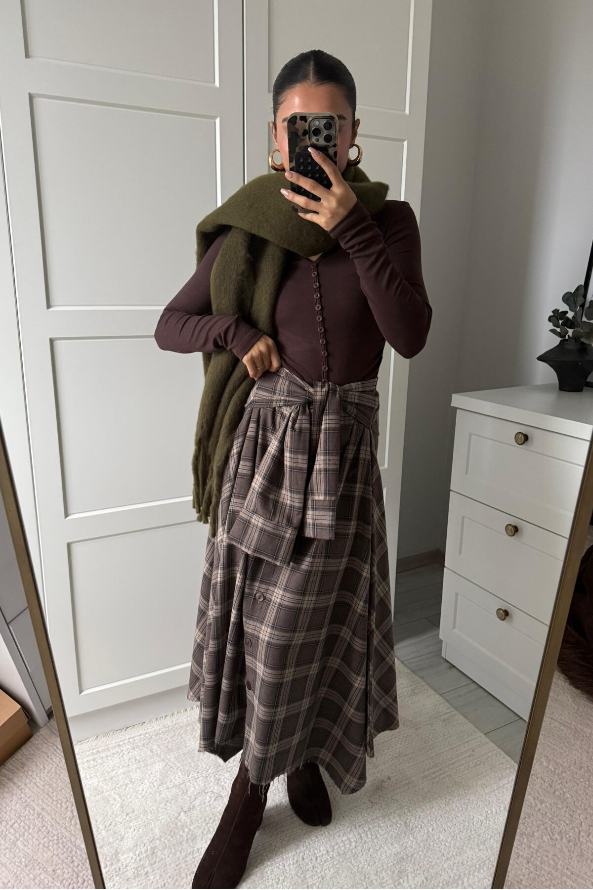 “Beli Bağlamalı Ekose Düğmeli Etek Kahverengi” için yorum yapan ilk kişi siz olun
