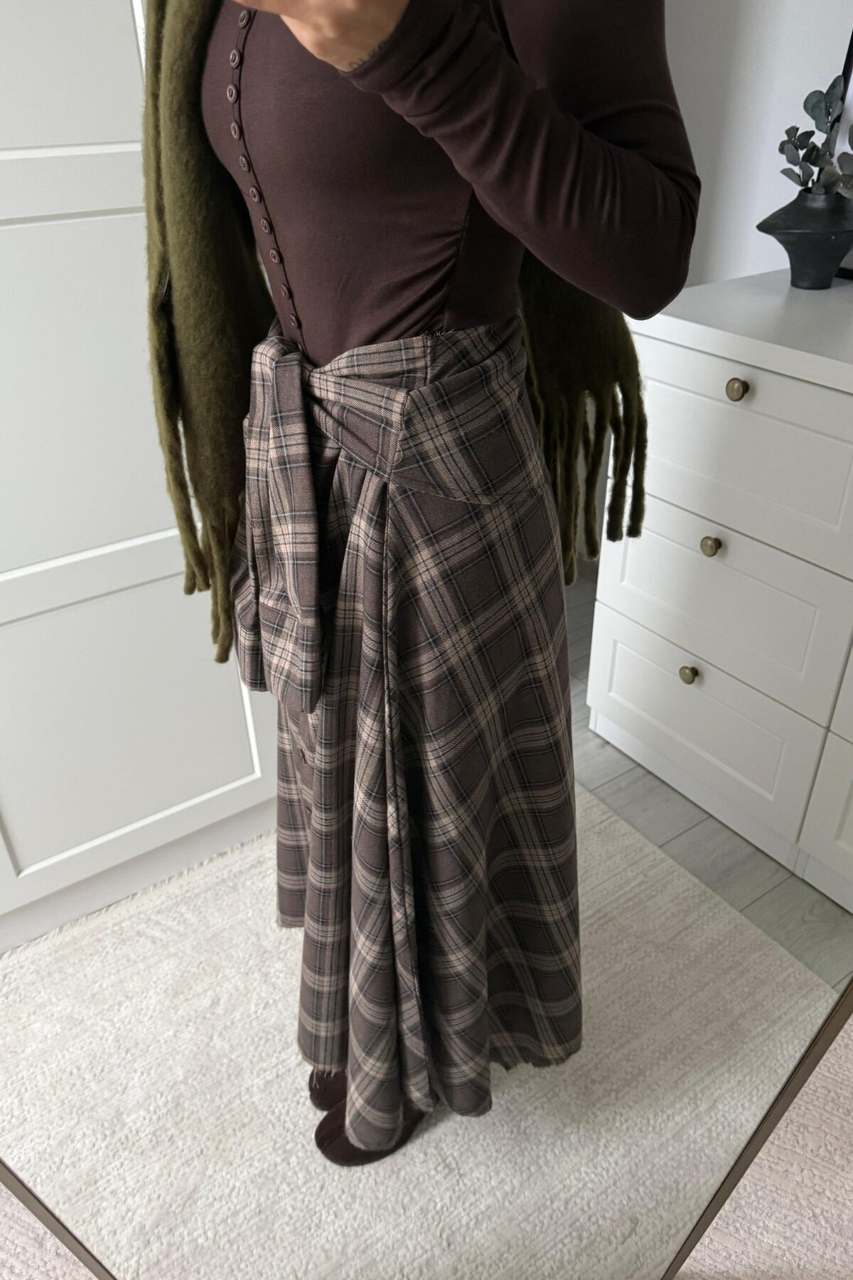 Beli Bağlamalı Ekose Düğmeli Etek Kahverengi