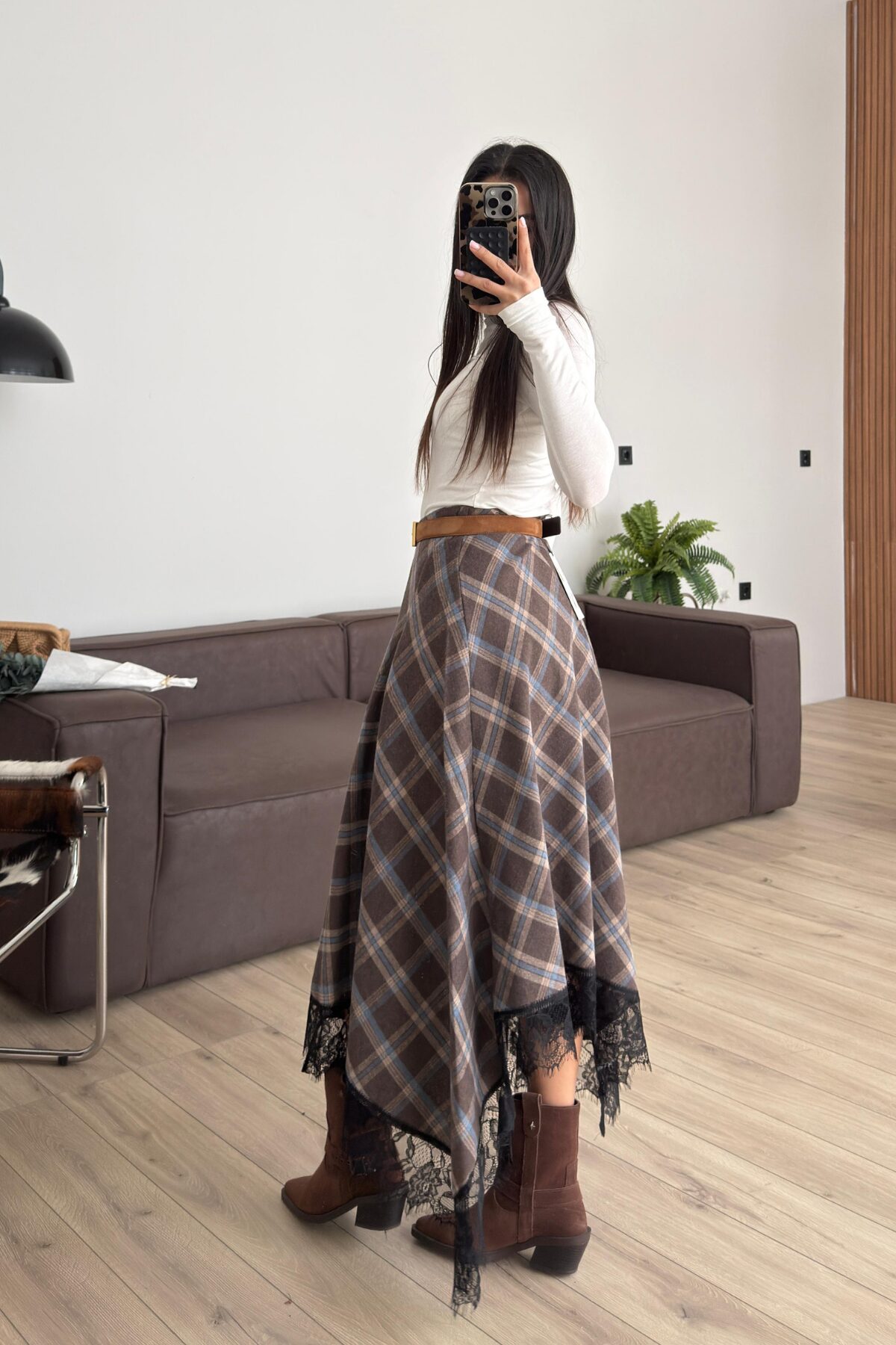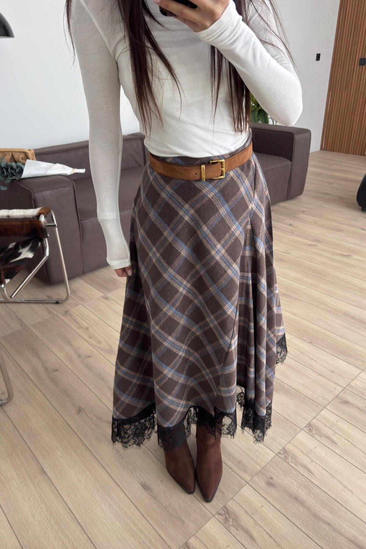 Dantel Detaylı Ekose Etek Kahve Mavi