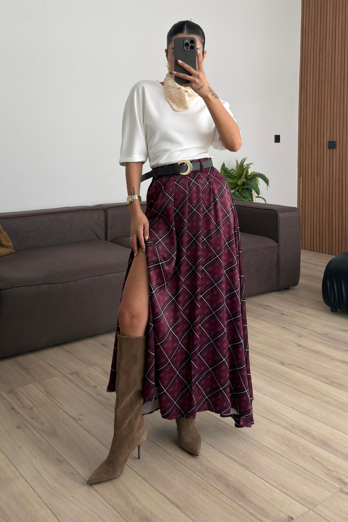 Yırtmaçlı Ekose Saten Etek Mürdüm