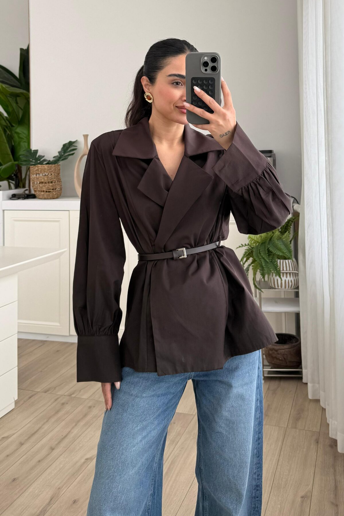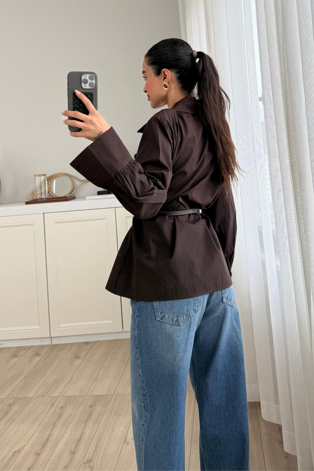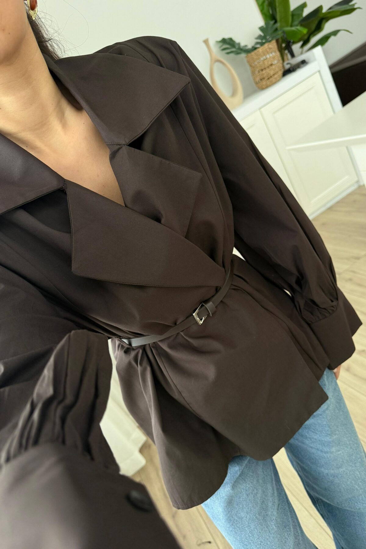 Balon Kol Kemerli Gömlek Kahverengi