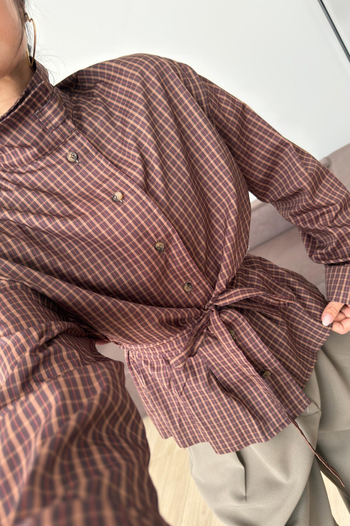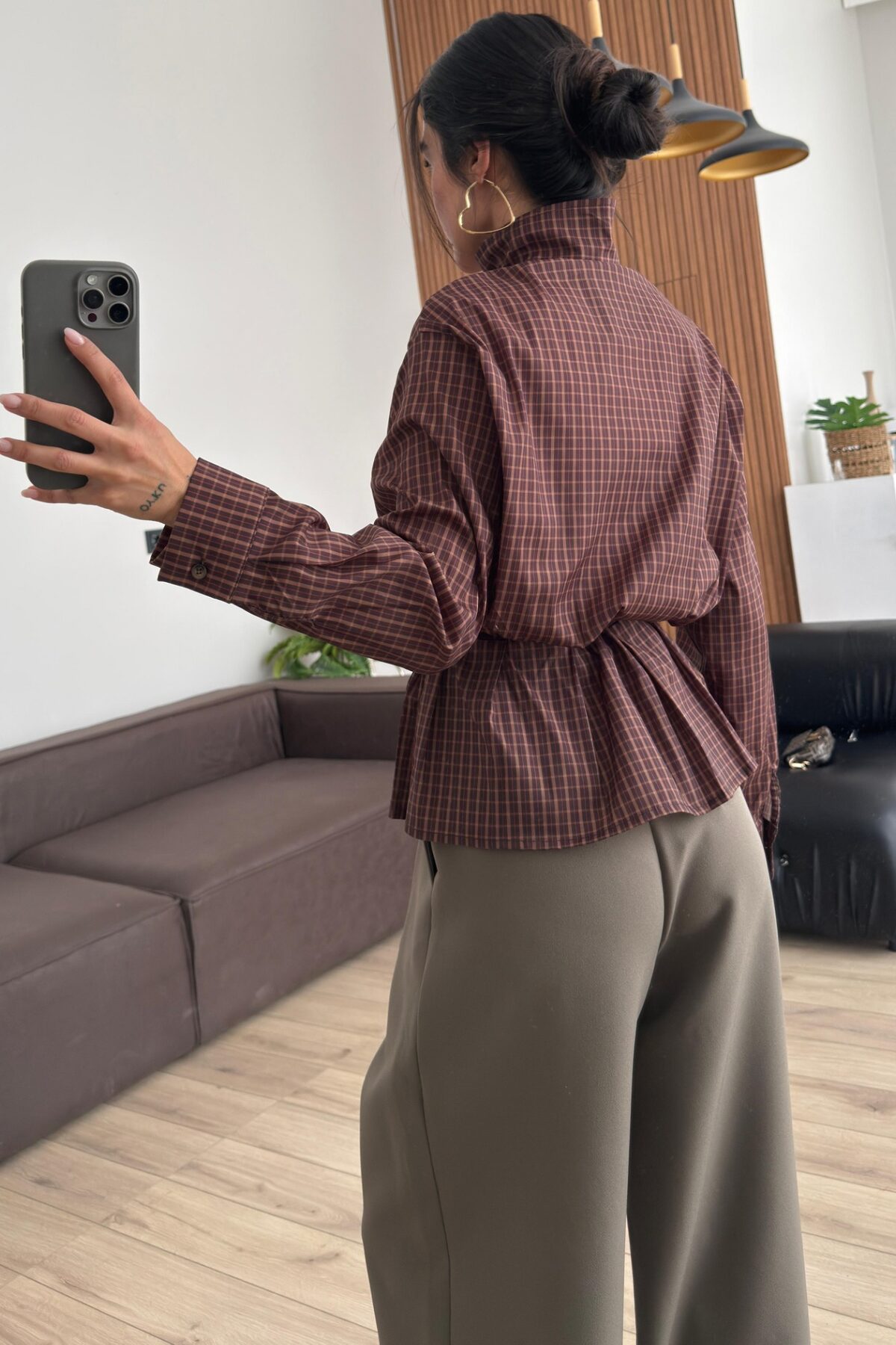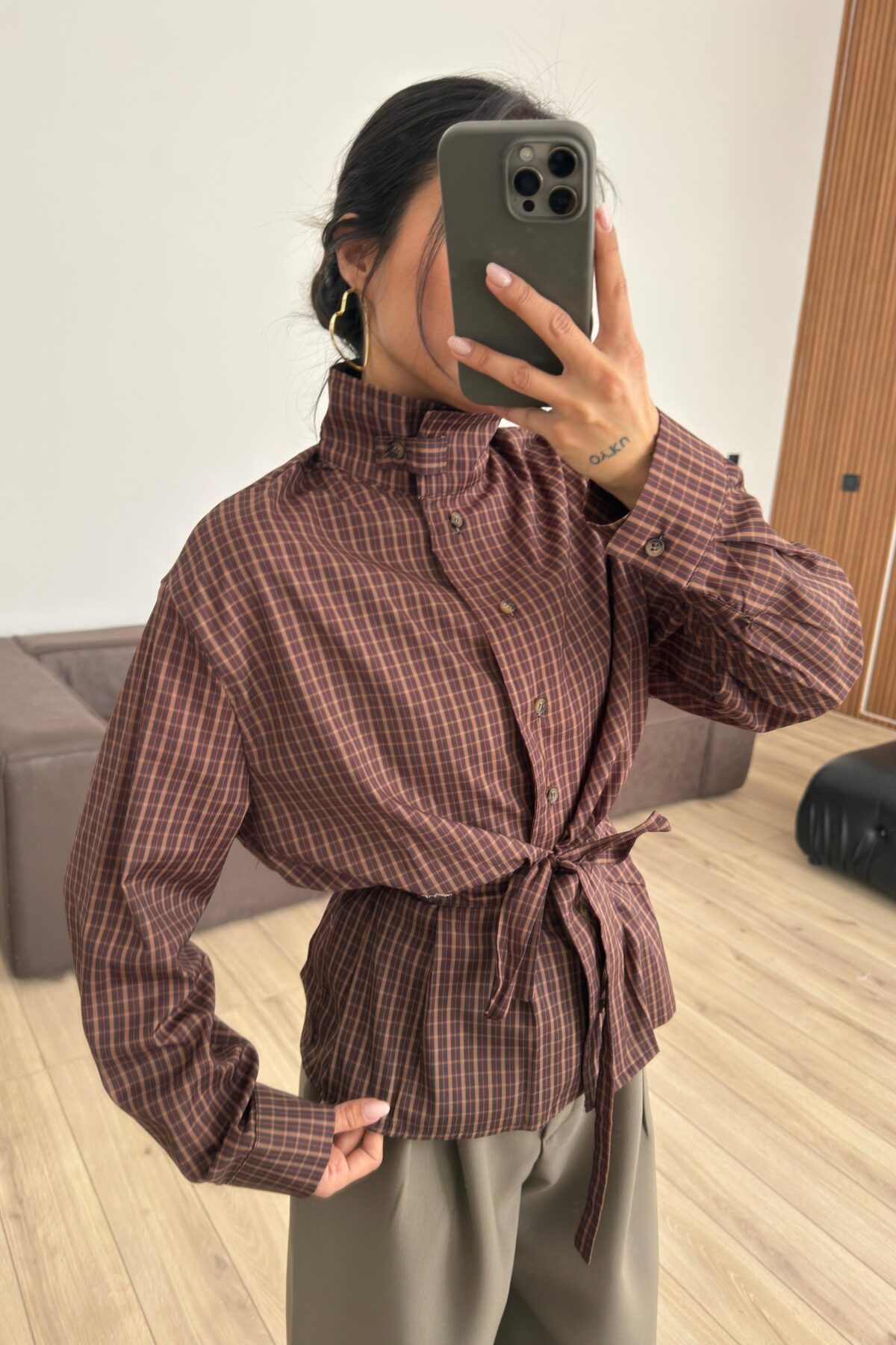 Belden Bağlamalı Dik Yaka Ekose Gömlek Kahverengi