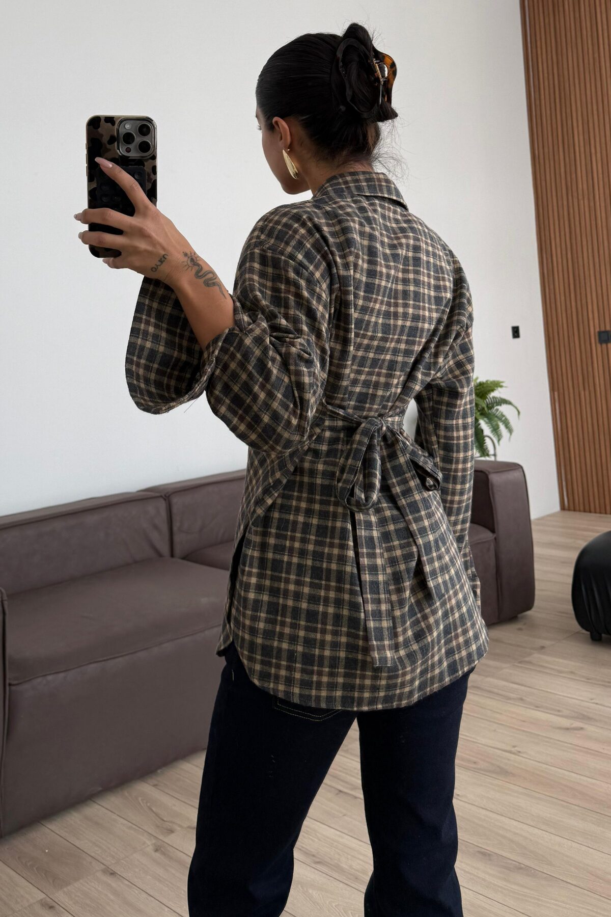 Düğme Detaylı Beli Bağlamalı Ekose Gömlek Kahverengi