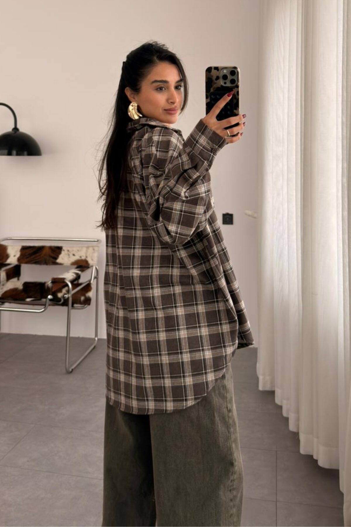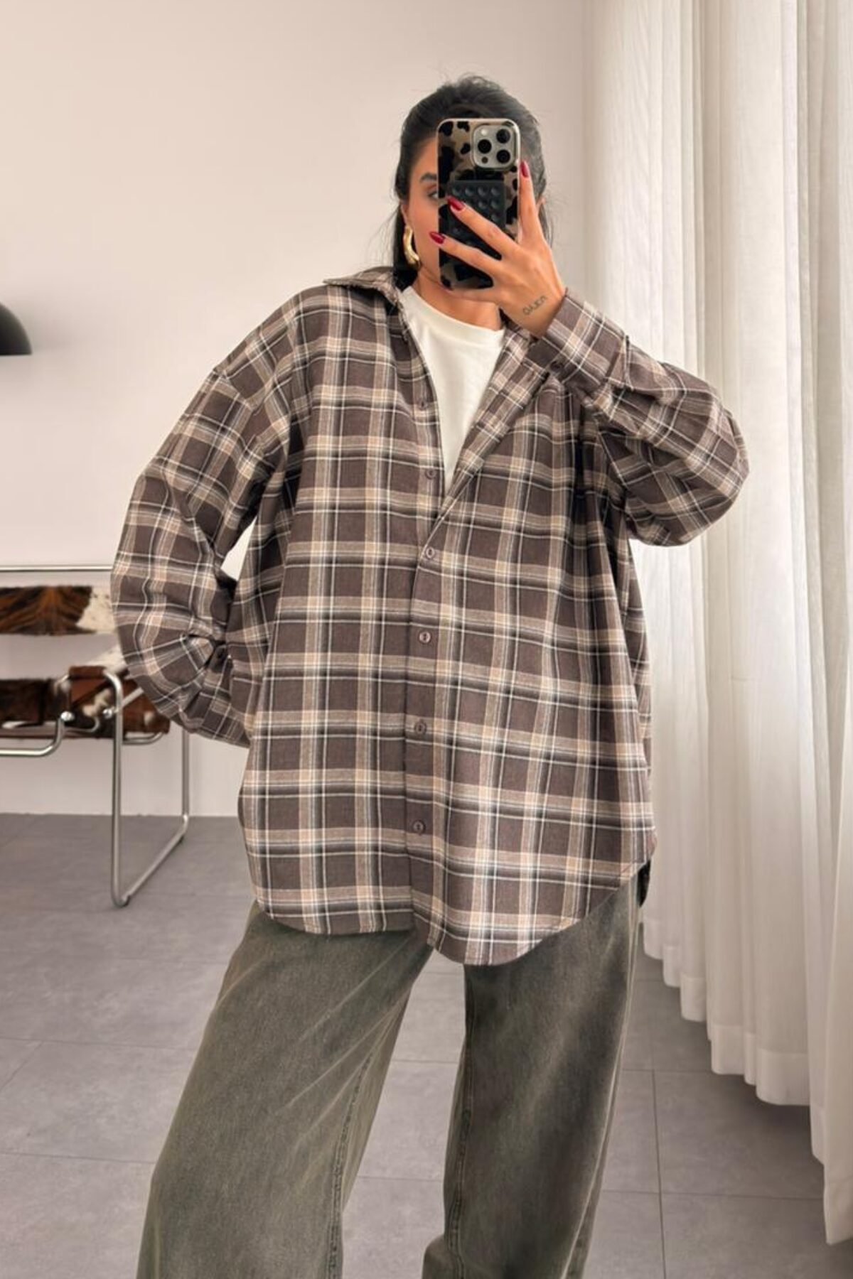 Ekose Oversize Oduncu Gömlek Kahve Bej