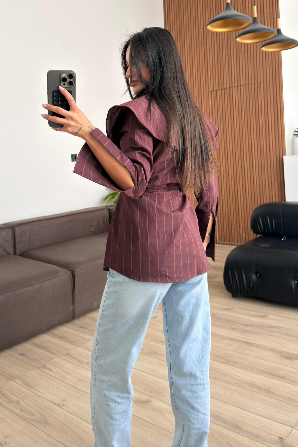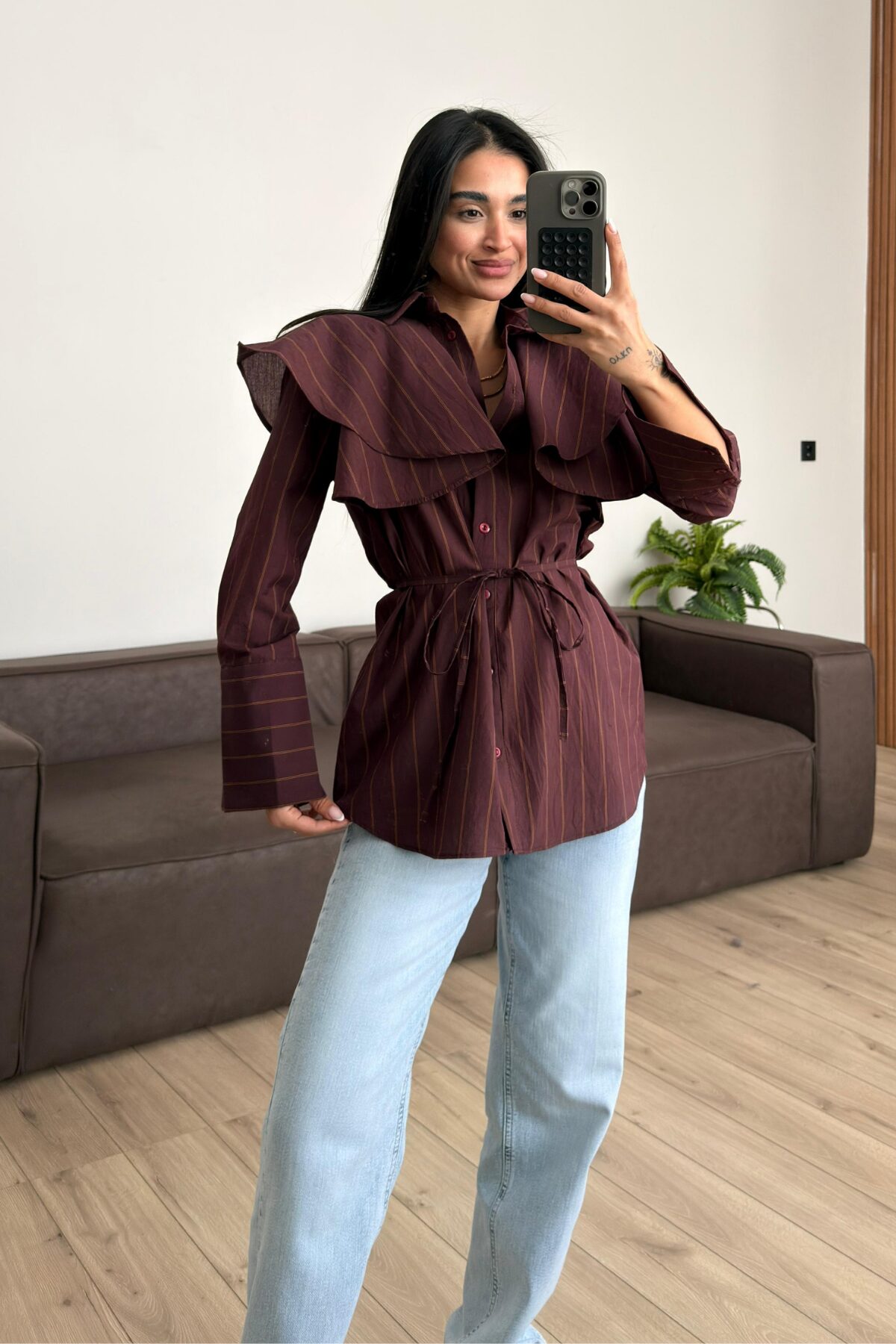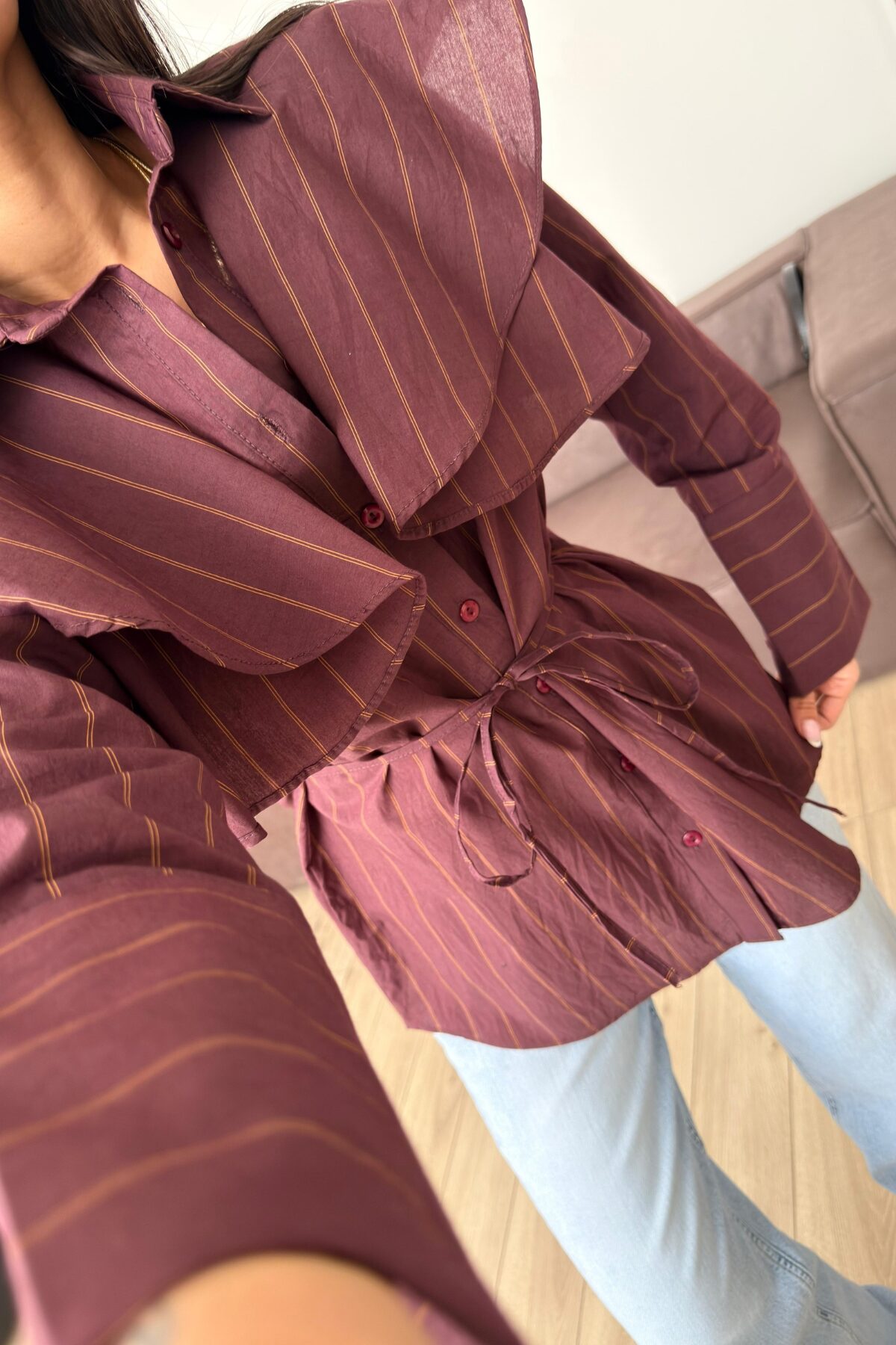 “Omzu Fırfırlı Çizgili Gömlek Bordo” için yorum yapan ilk kişi siz olun