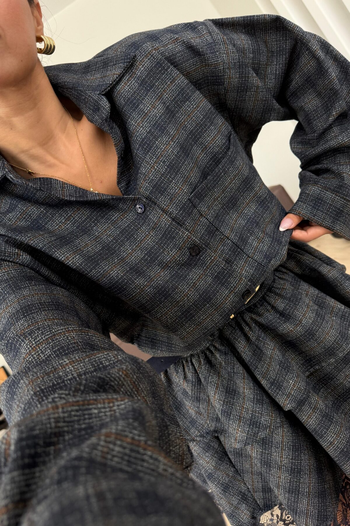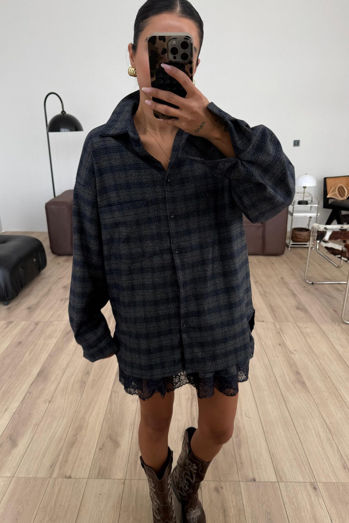 Oversize Tek Cepli Ekose Gömlek Lacivert