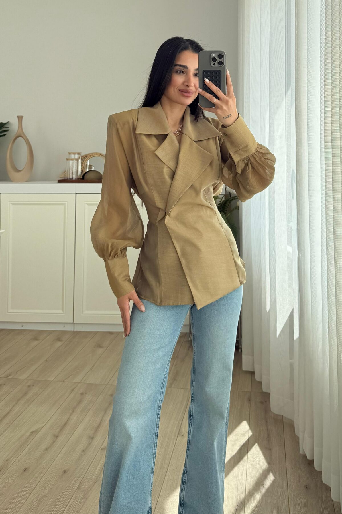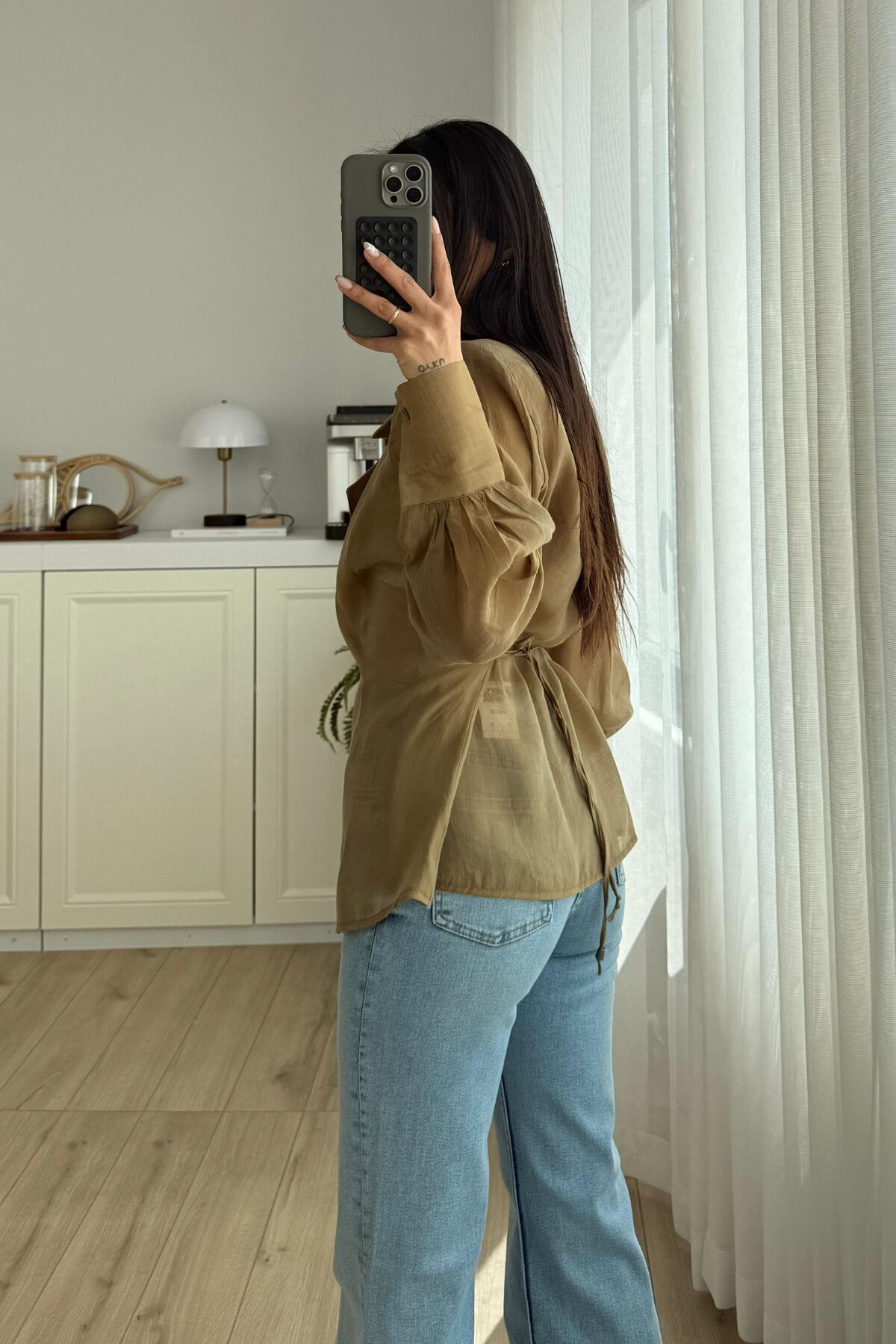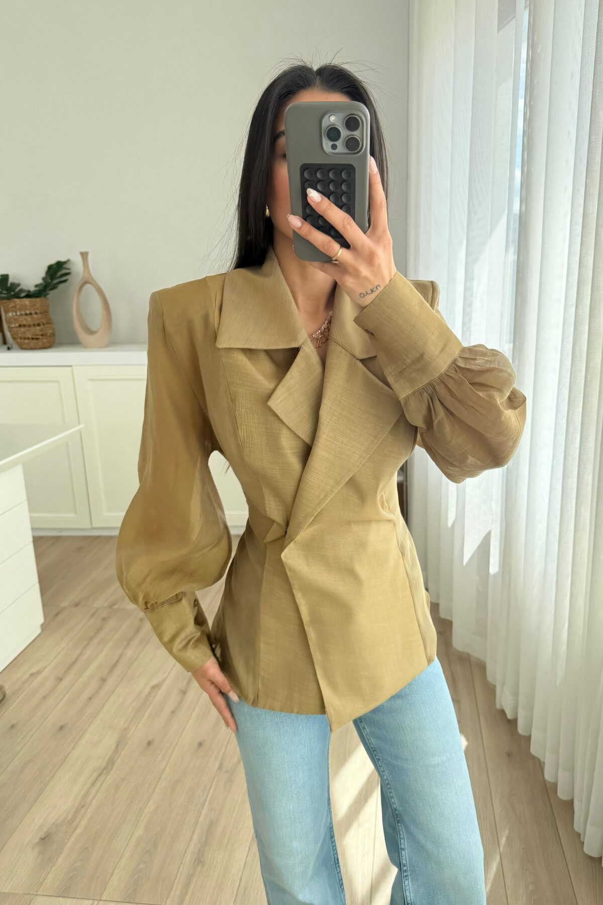 Vatkalı Kruvaze Yaka Çıtçıtlı Tül Gömlek Olivia