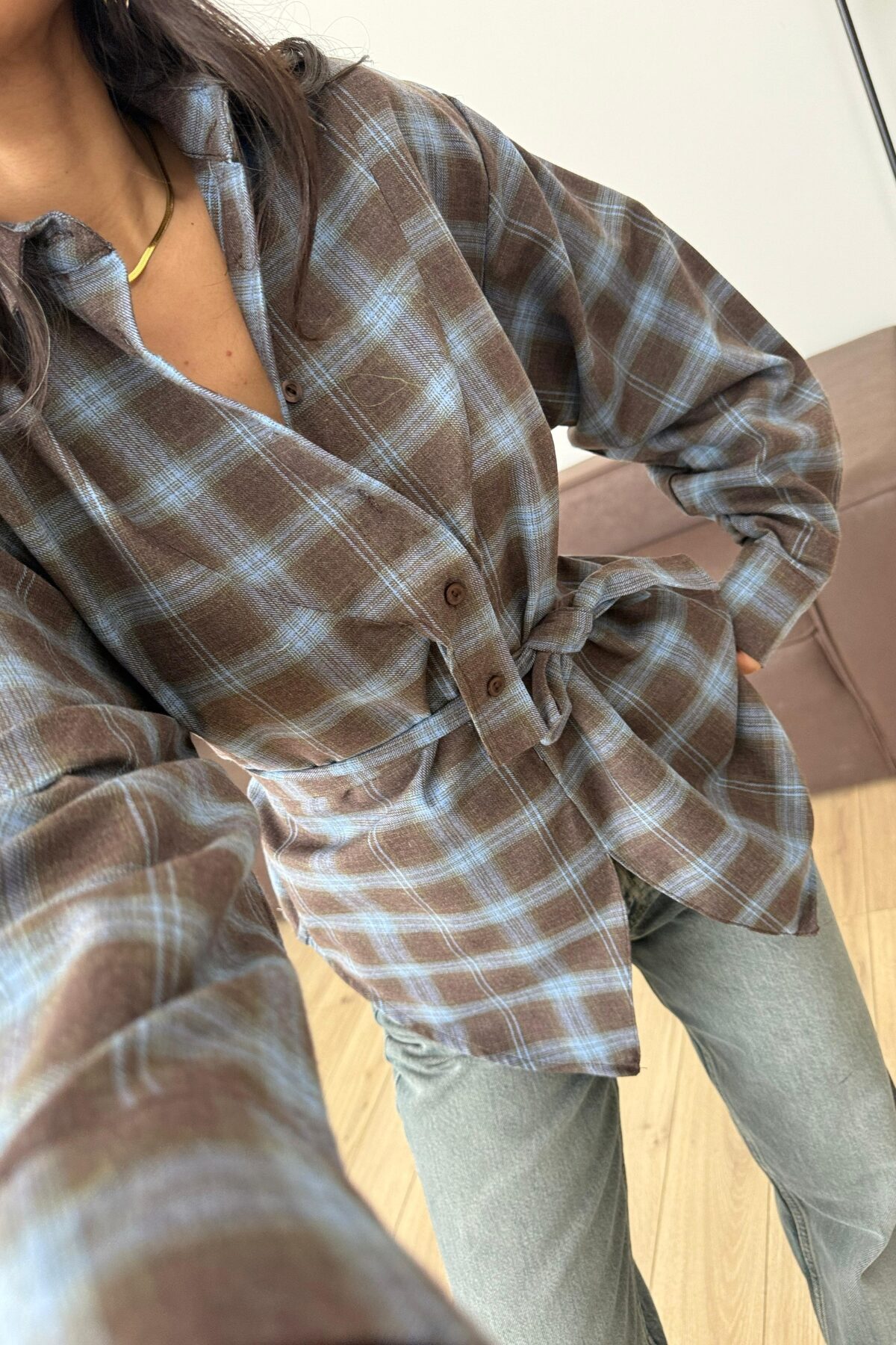 Yakası Düğmeli Bağlamalı Ekose Gömlek Mavi